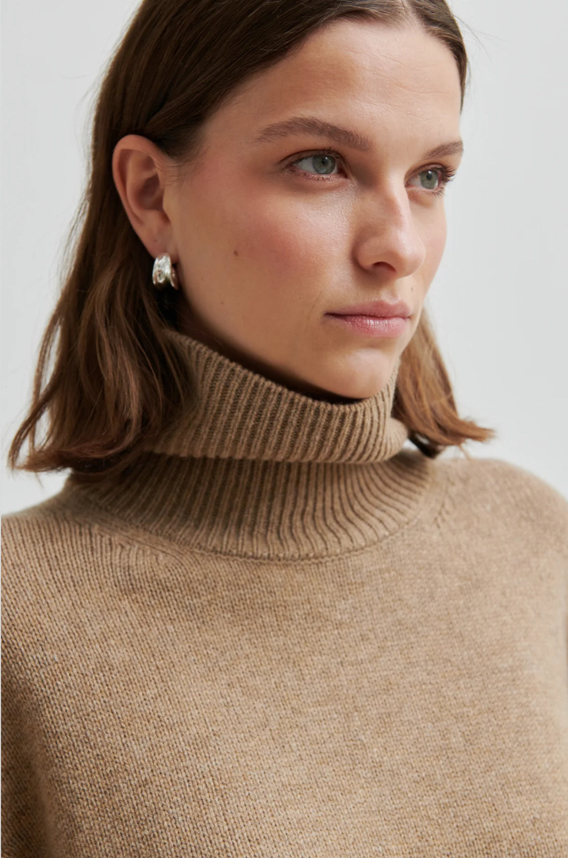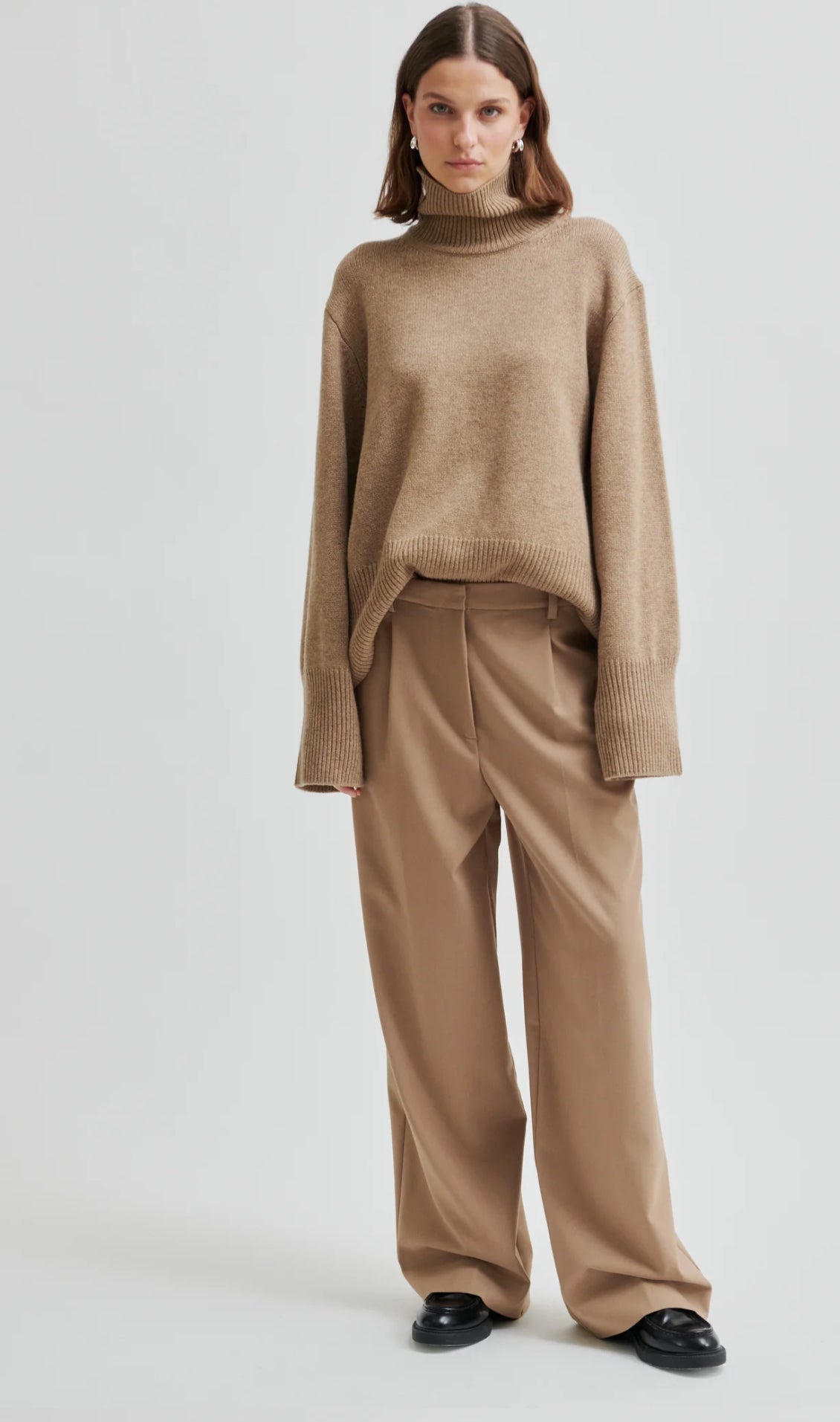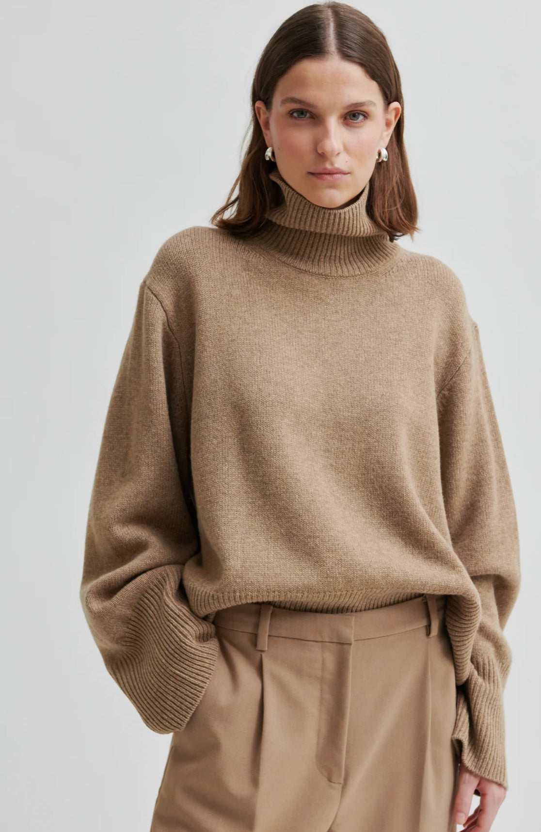 Second Female turtle-neck pullover. The pullover is made in soft wool. Featuring a turtle neck and dropped shoulders with wide, long sleeves. Ribbed neck, cuffs and bottom hem. Extra-wide fit.