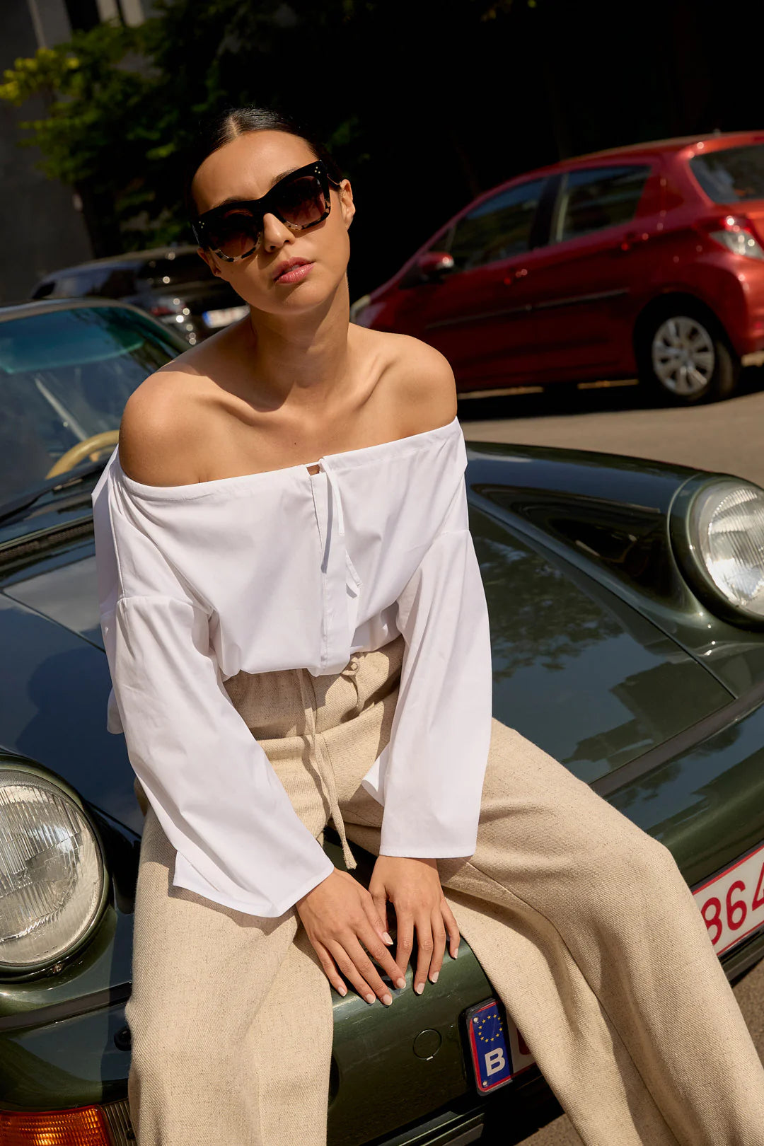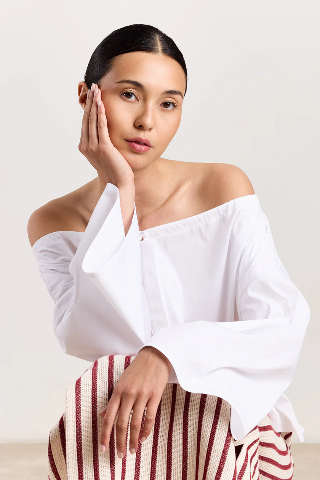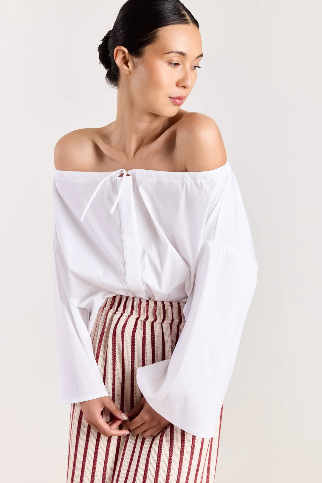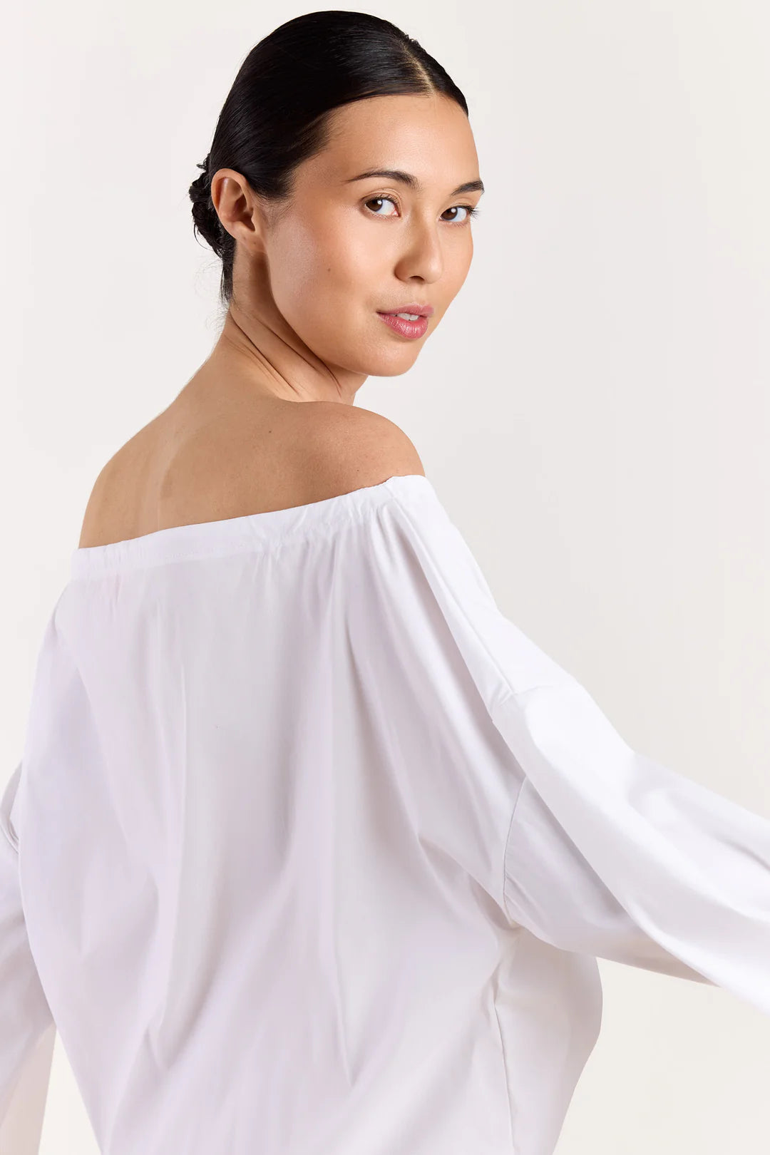 Anais is an off-shoulder shirt with a clean, confident shape. The open neckline softens the look, while the structured cut keeps it sharp. Easy to style in endless ways: wear it loose over a skirt or tailored trousers for an elegant everyday look. Let it sit off one shoulder for a relaxed, feminine feel. Available Navy & White.