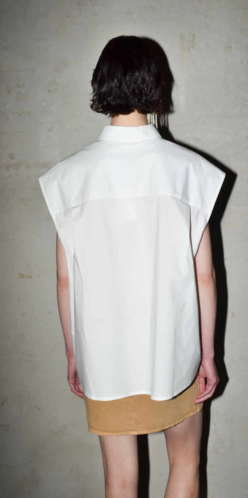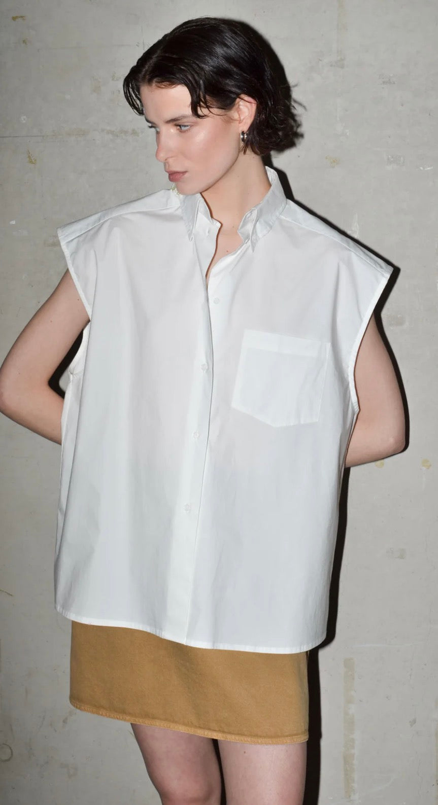 This long oversized shirt is cut from cotton poplin. Sleeveless, with an attached chest pocket and a button-down collar, it’s finished with a double pleat in the back for added volume. A clean silhouette with subtle structure.