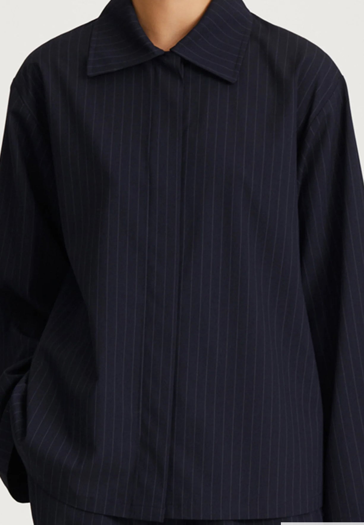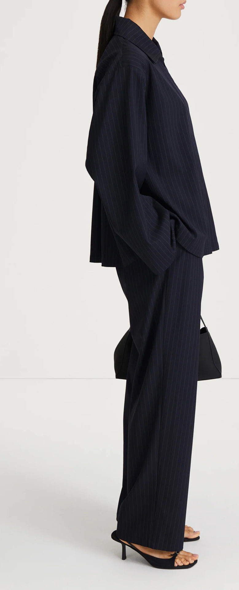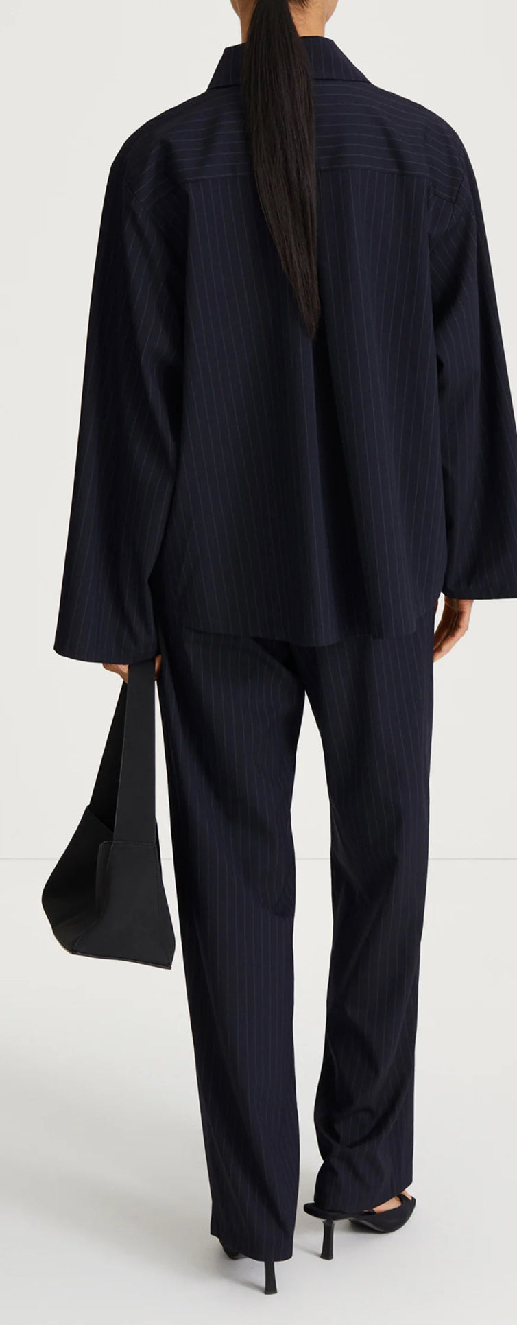 Brenly Shirt is a loose-flared shirt crafted from pinstriped suit fabric. Featuring Stylein’s signature yoke and box pleat at the back, it has full-length wide sleeves, creating an effortlessly refined look.