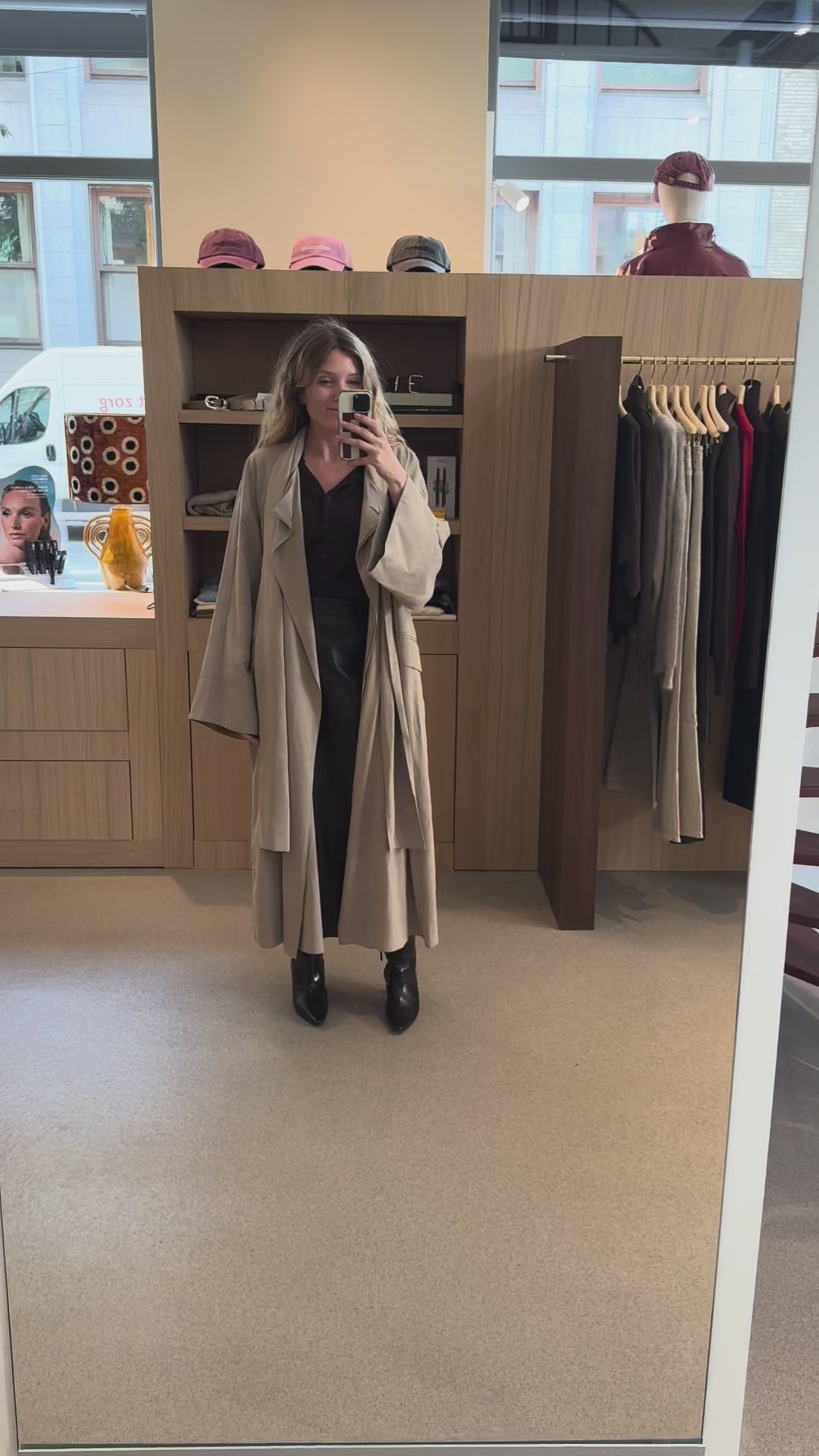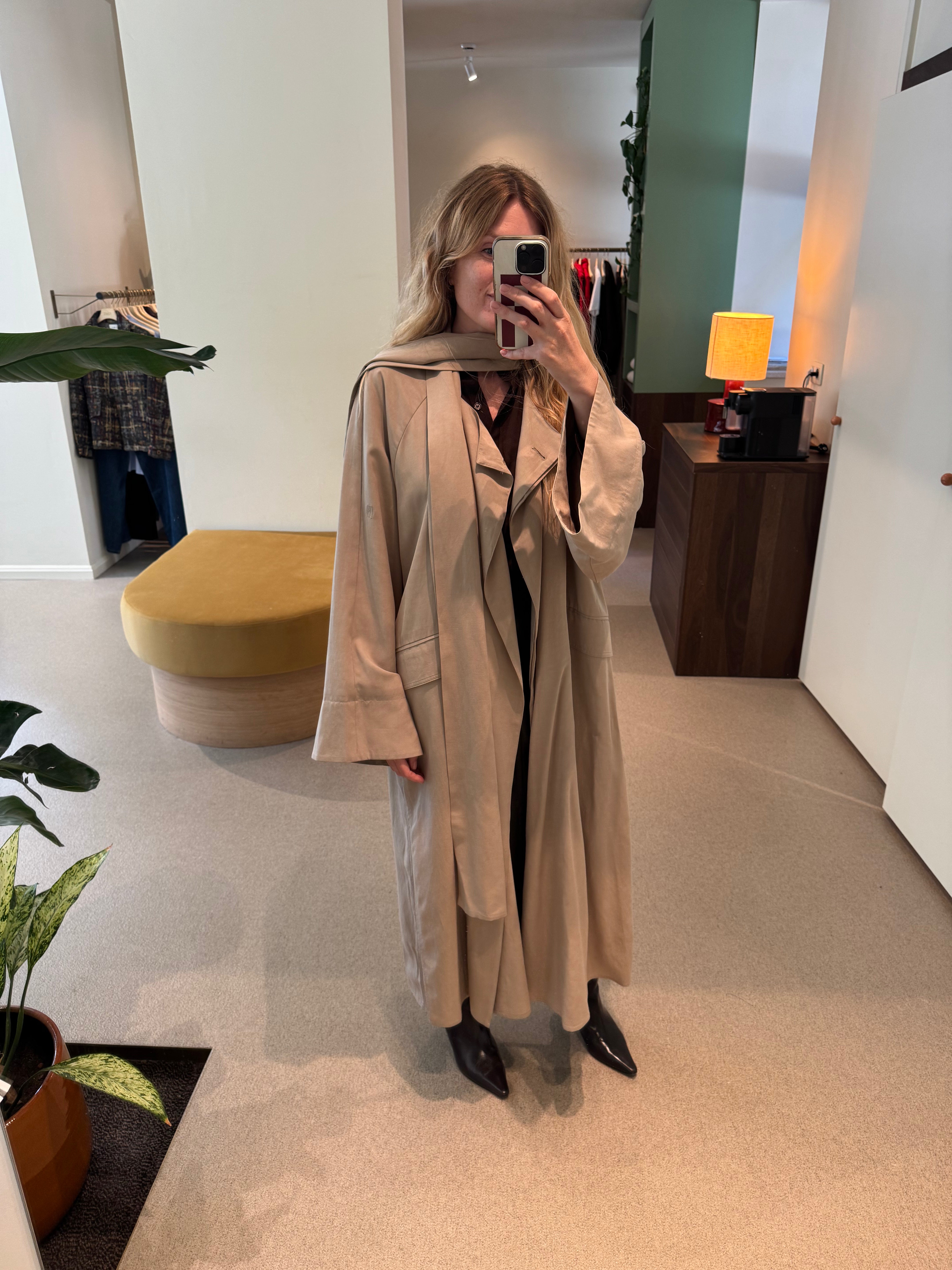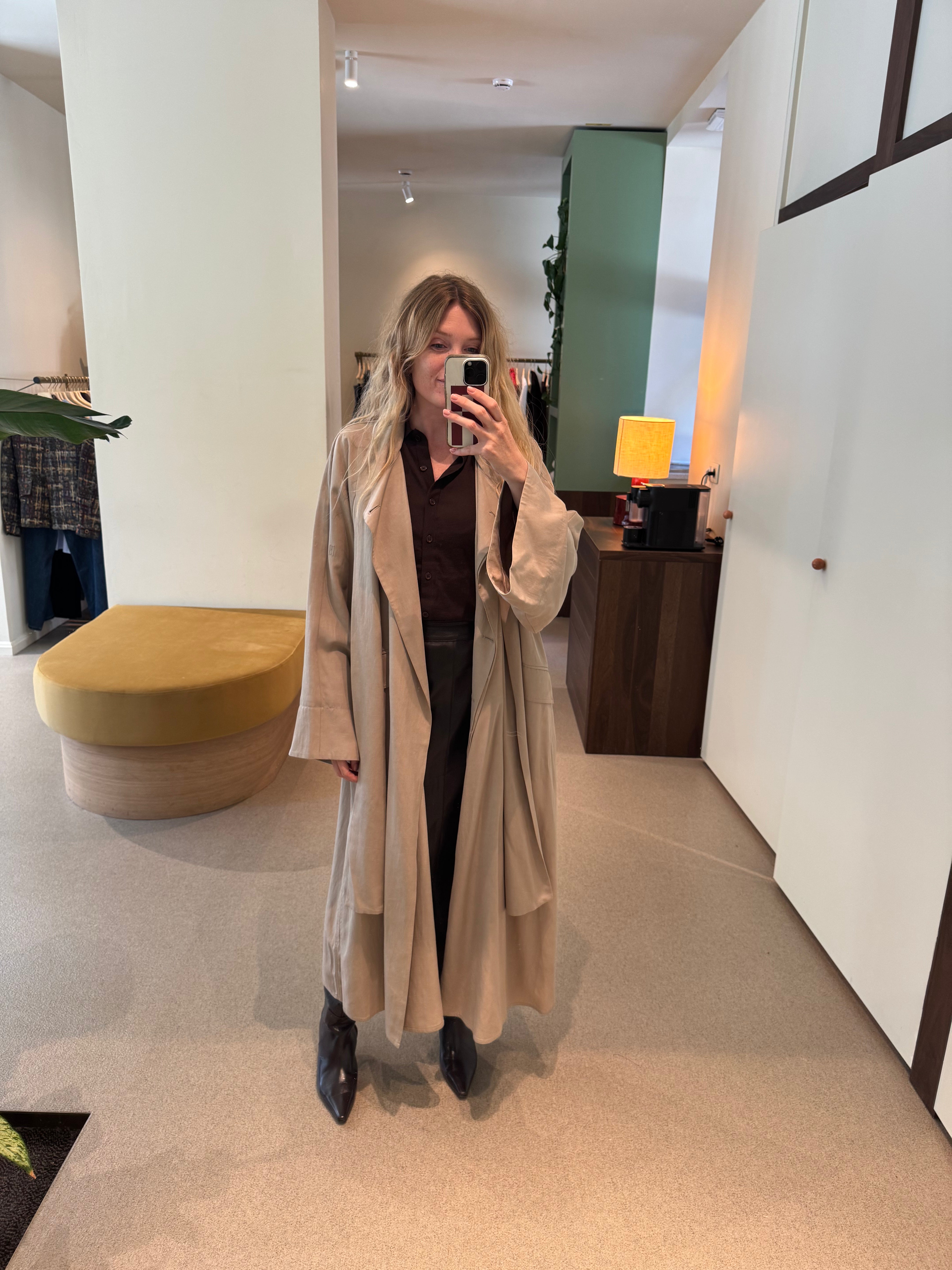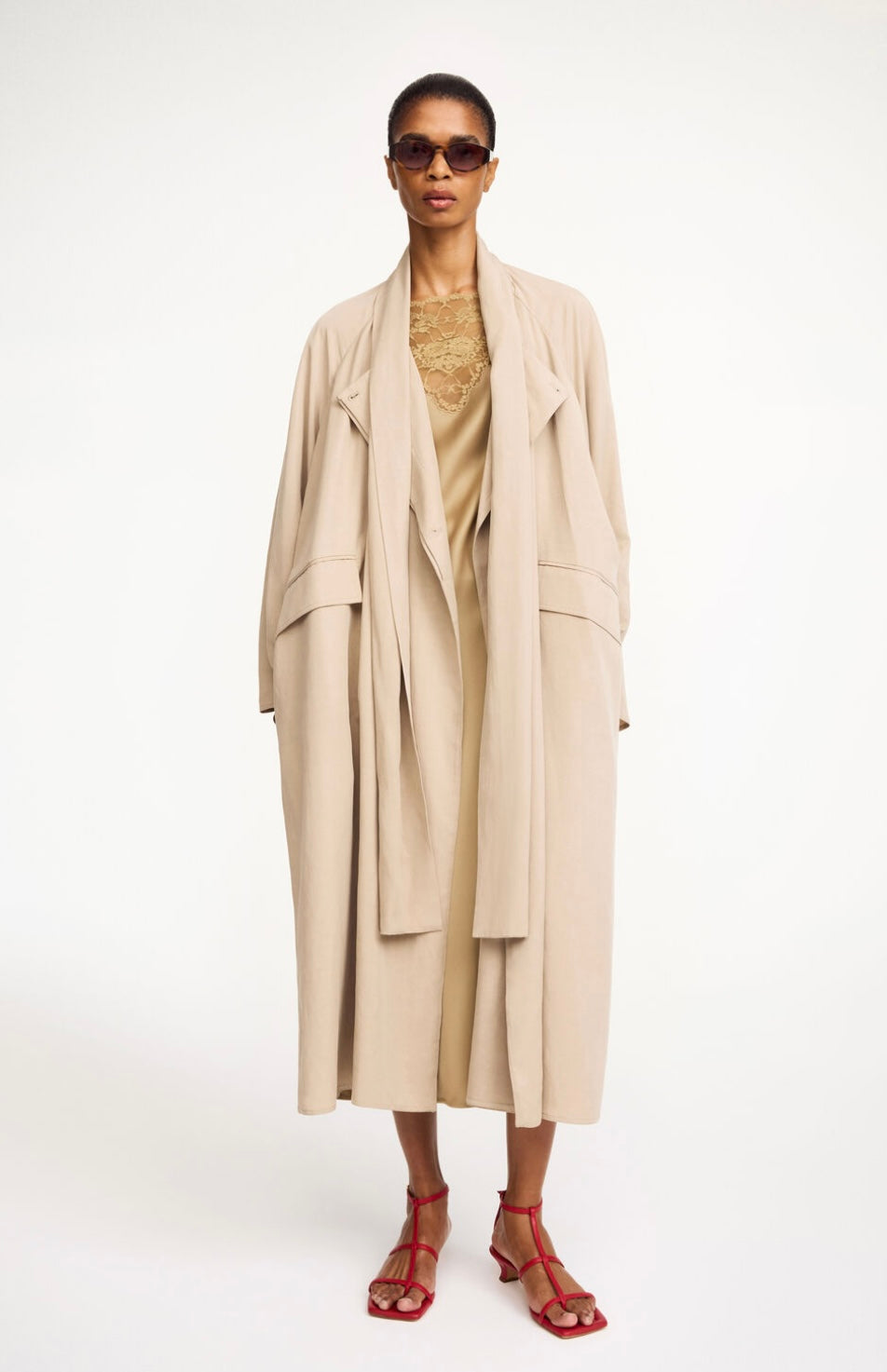 A key piece of the season, the Campagna trench coat is ideal for transitional dressing – layered over tactile attires and worn open or closed to your preference. Revealing secret pockets down the coat’s side, it’s a nod to the functional gardener’s vest. Details worth noticing? The scarf-like collage and the small, embroidered monogram.