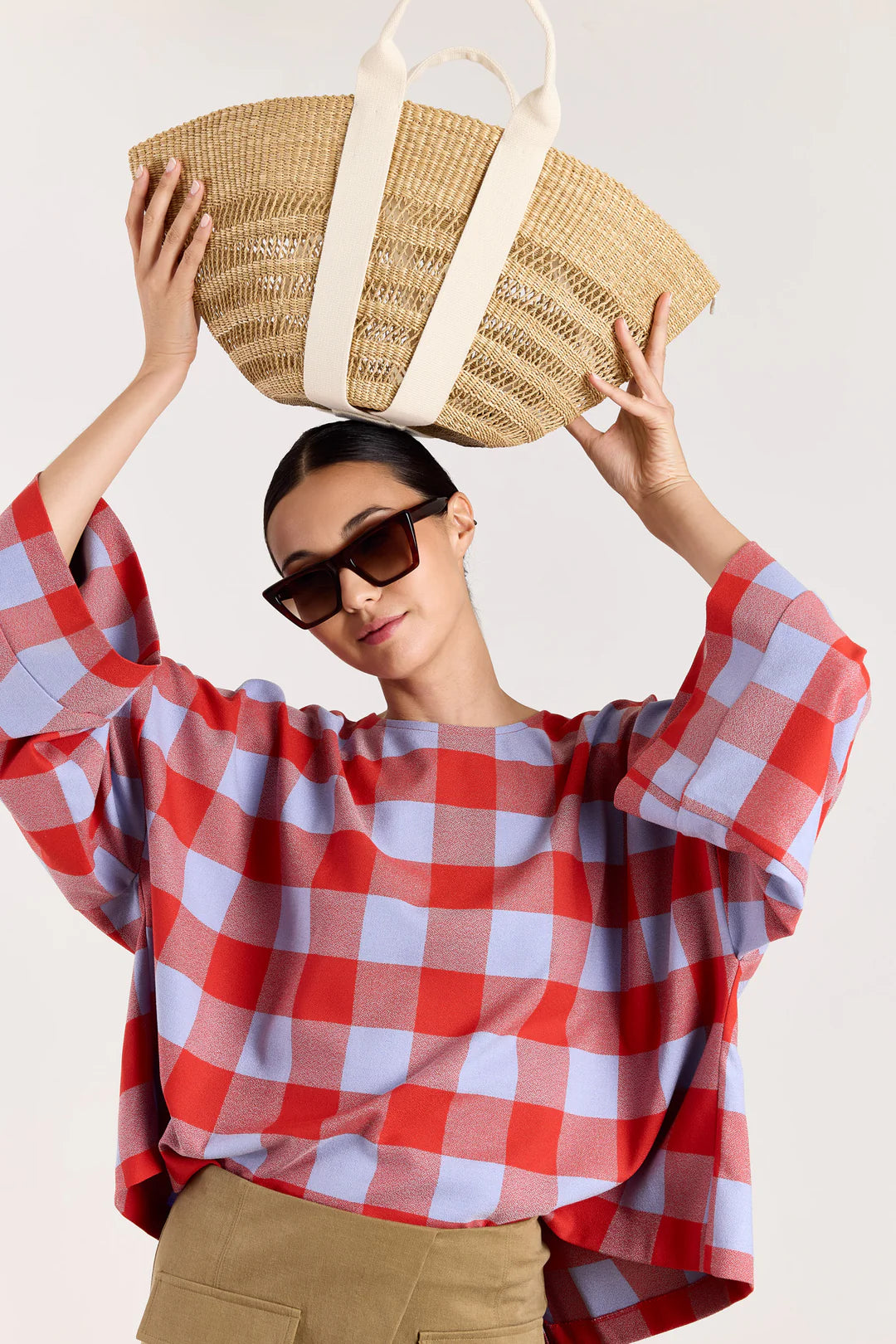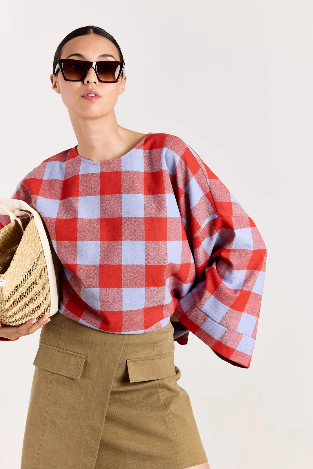 The Carina blouse plays with proportion and pattern in a straightforward way. The loose shape and wide sleeves give it an easy, relaxed feel, while the graphic check keeps the look sharp and present. It’s a piece that stands out through shape and print, without needing extra detail.
