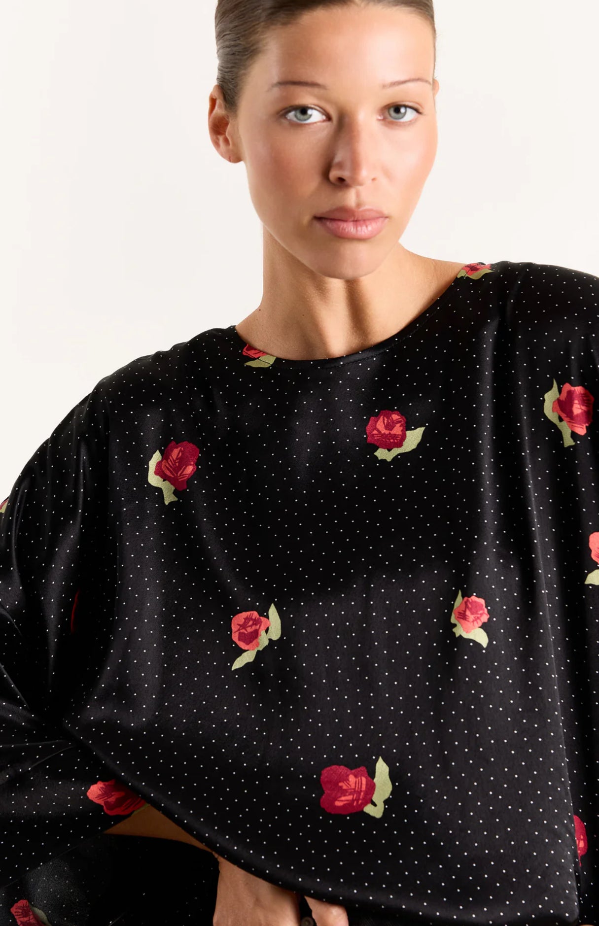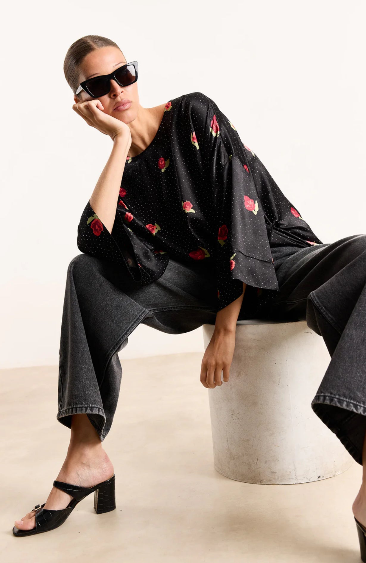 This abstract rose-printed blouse is your shortcut to effortless cool with a romantic twist. Featuring a relaxed, oversized silhouette and wide kimono-inspired sleeves, it channels a Parisian nonchalance that works for both casual and elevated looks.
