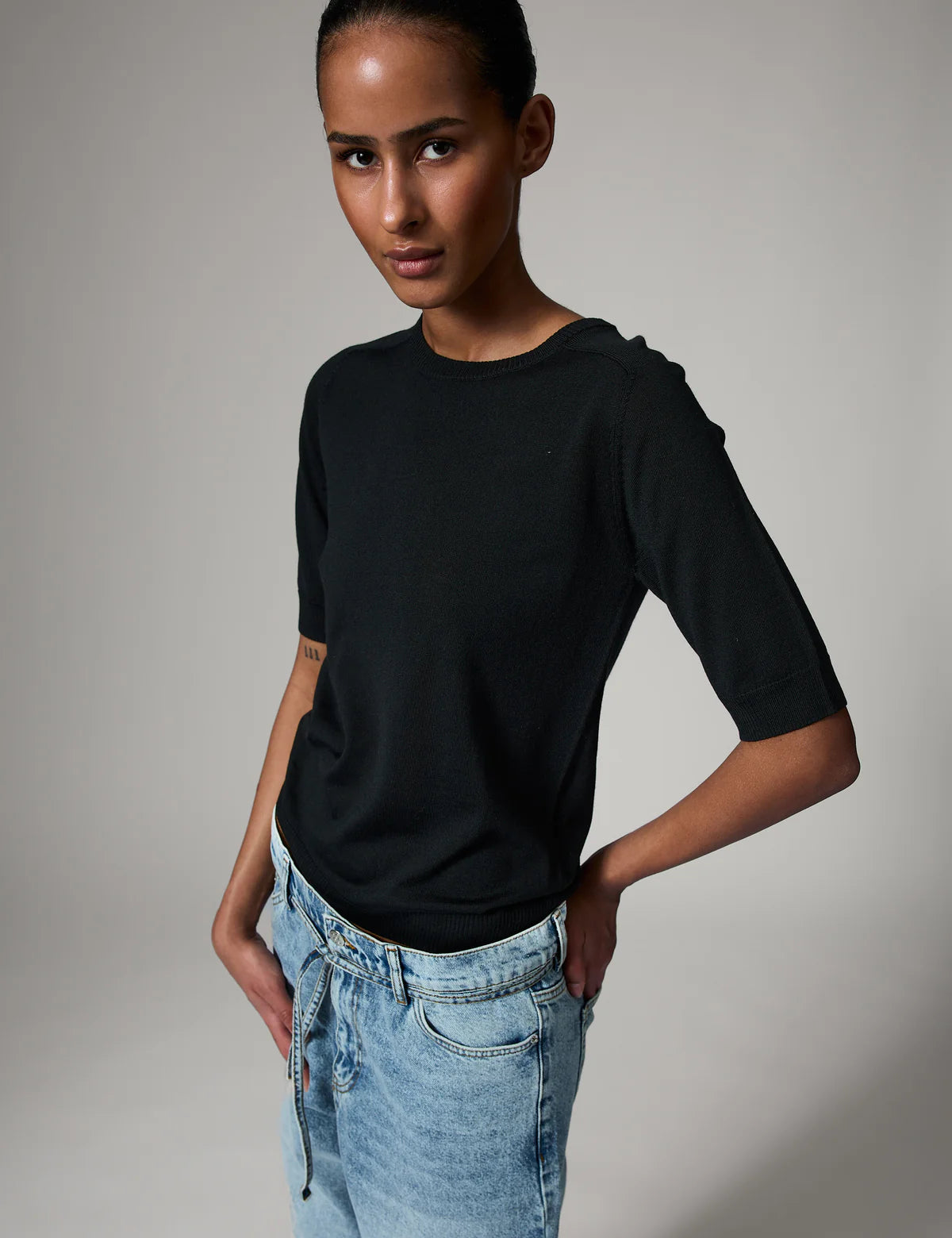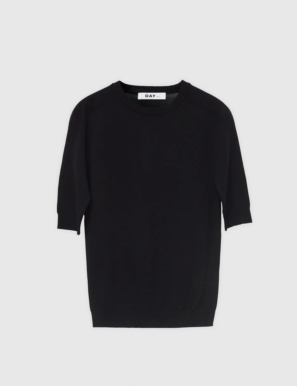 A thin knit pullover t-shirt with ribbing at the sleeves, hem, and neck. Wear with high-waisted trousers for a classic, professional ensemble.