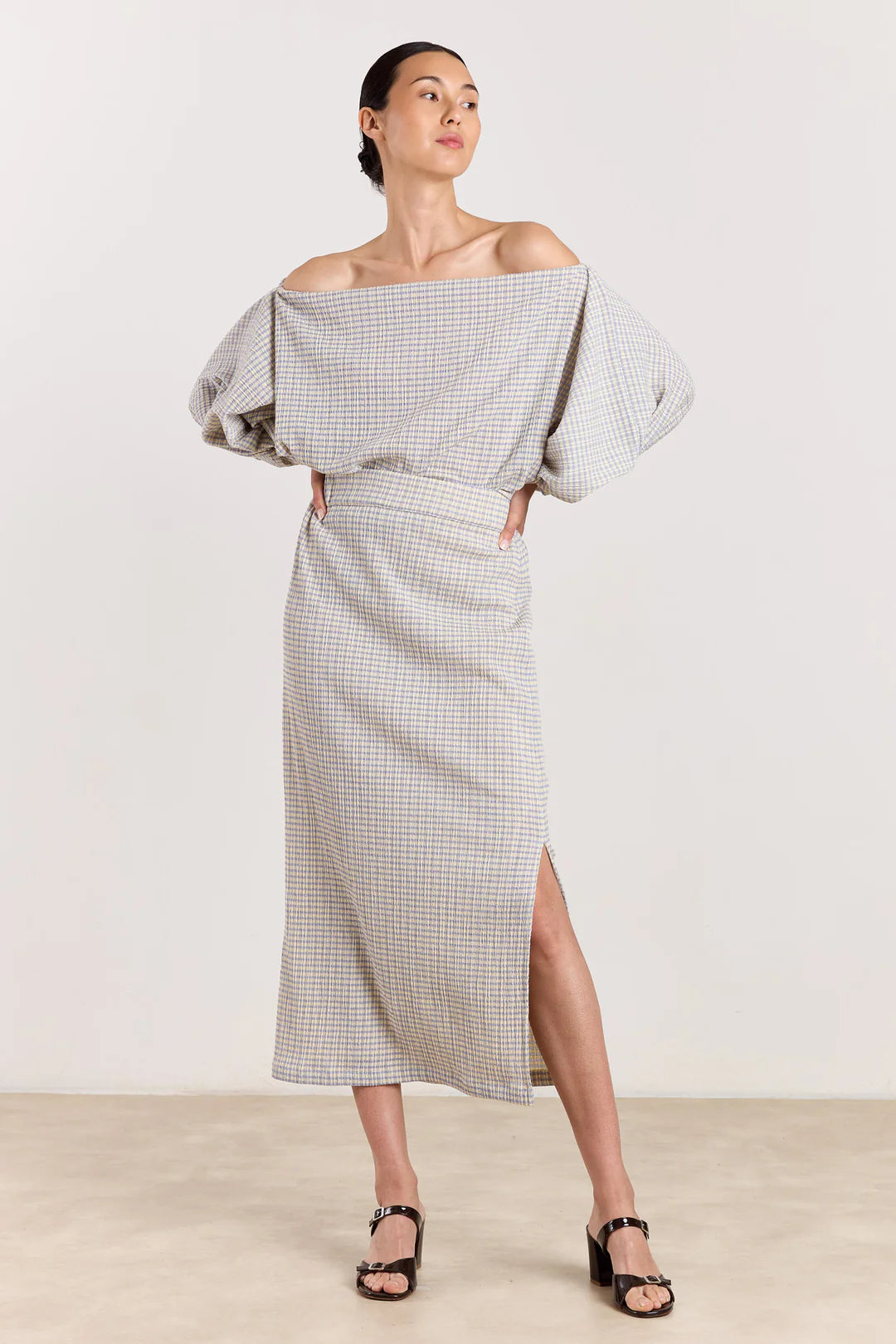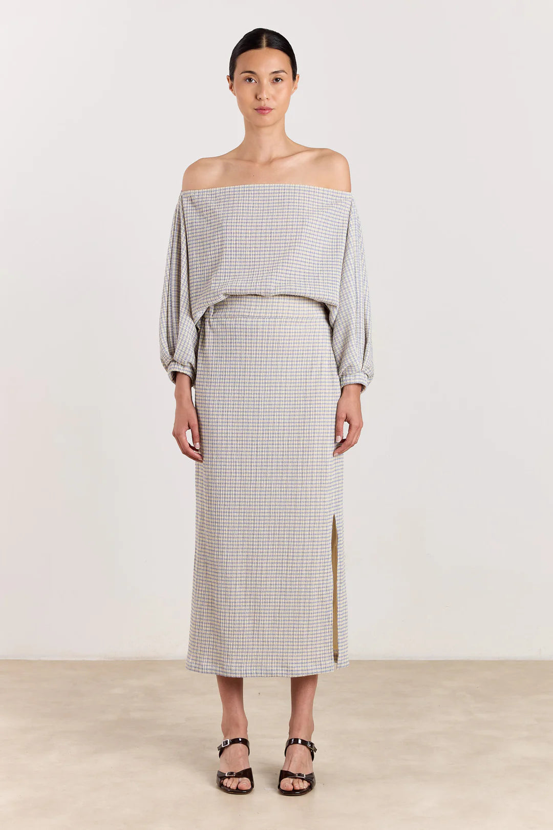 Celena is a classic clique style, this lightweight seersucker skirt with clean, straight silhouette is designed to sit high on the waist. It features a subtle side slit for ease of movement and a softly textured finish. The breathable fabric makes it an easy choice for warm days, offering comfort with a refined look. Pair with the matching off-shoulder top for a coordinated set, or style it with a simple tee or crisp shirt for everyday wear. Finish with sandals or heels depending on the occasion. Available in Vanilla/Blue and Cranberry/Light Grey.