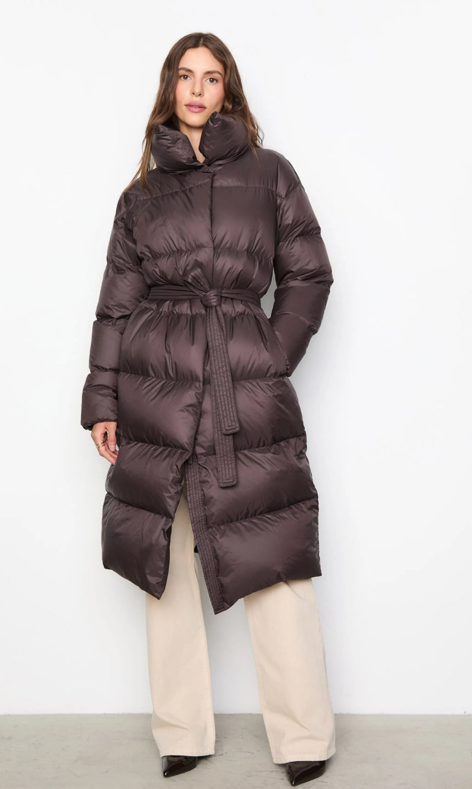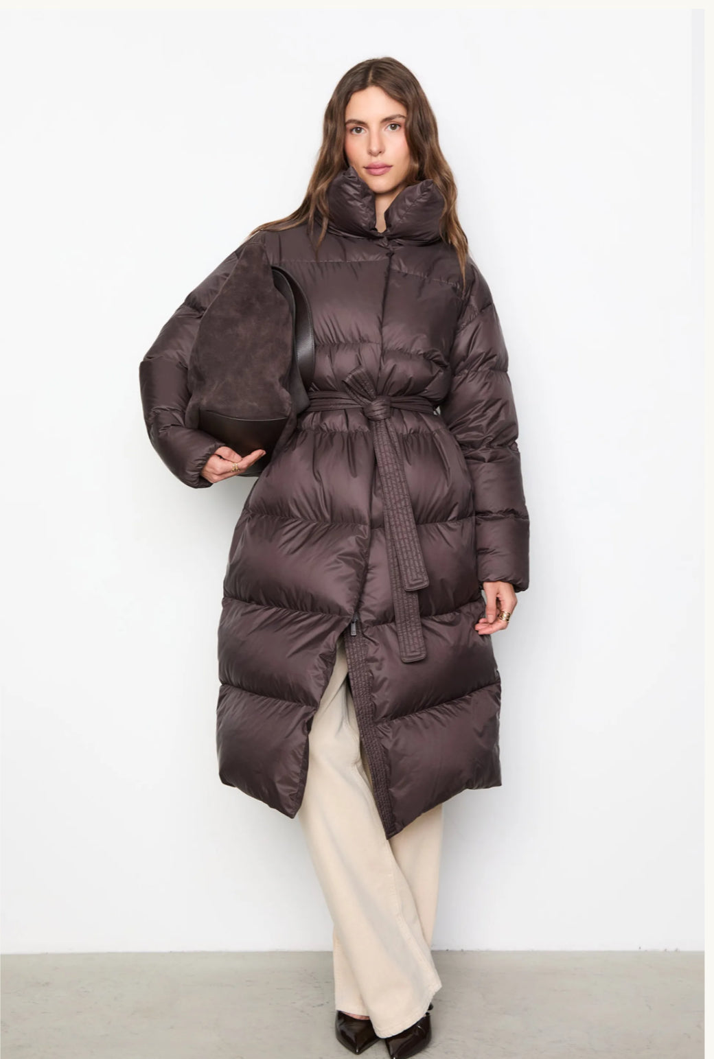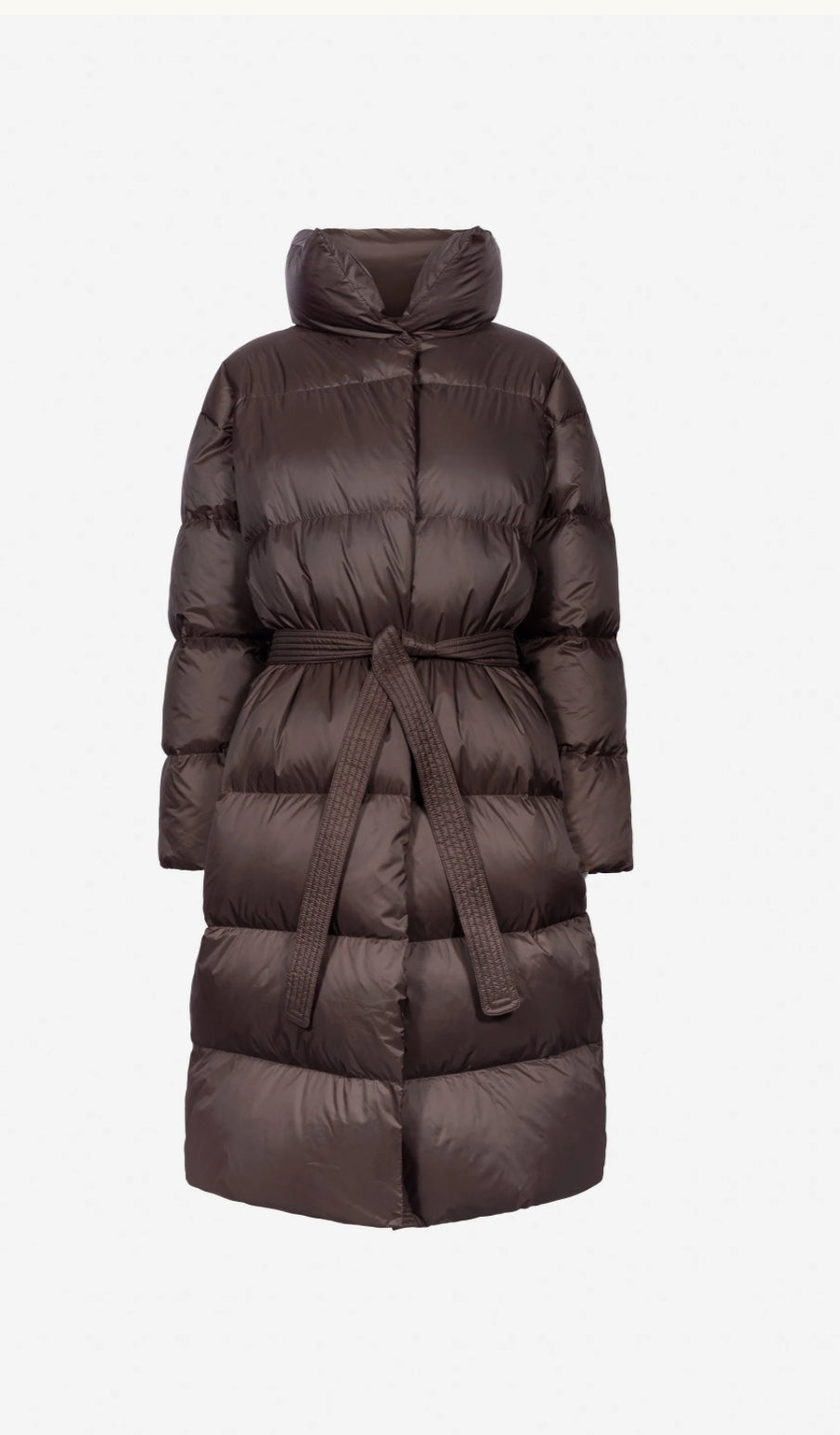 Dakota Down Coat is our long straight down coat, crafted from recycled materials with a shiny finish. Filled with RDS-certified responsible down, it features a large lapel collar, detachable belt and a concealed two-way zipper as well as press button closure. The jacket also has side pockets and a black rubber logo is positioned at the back of the neck.
