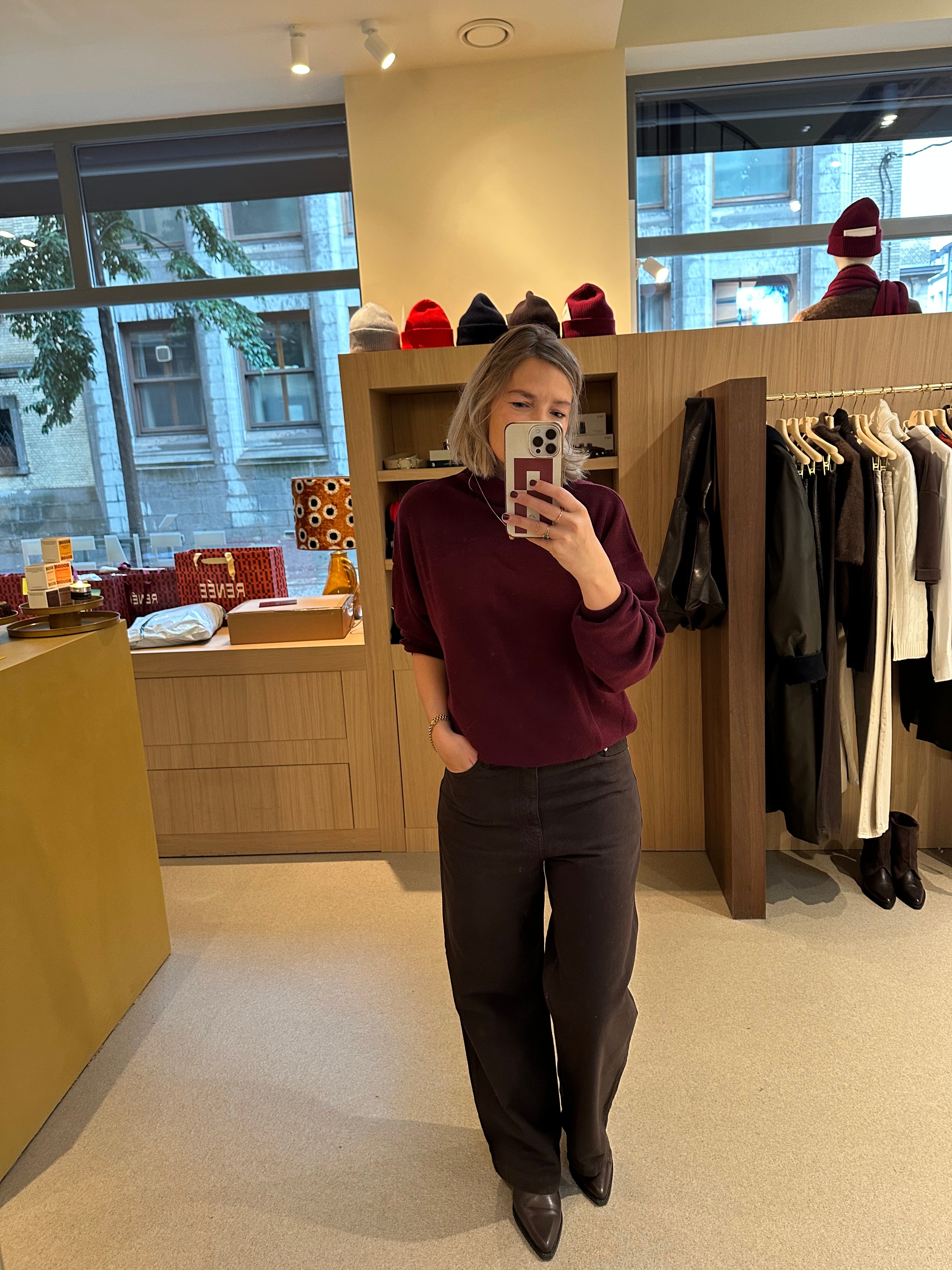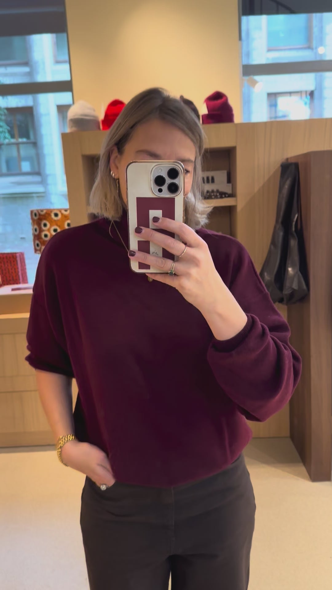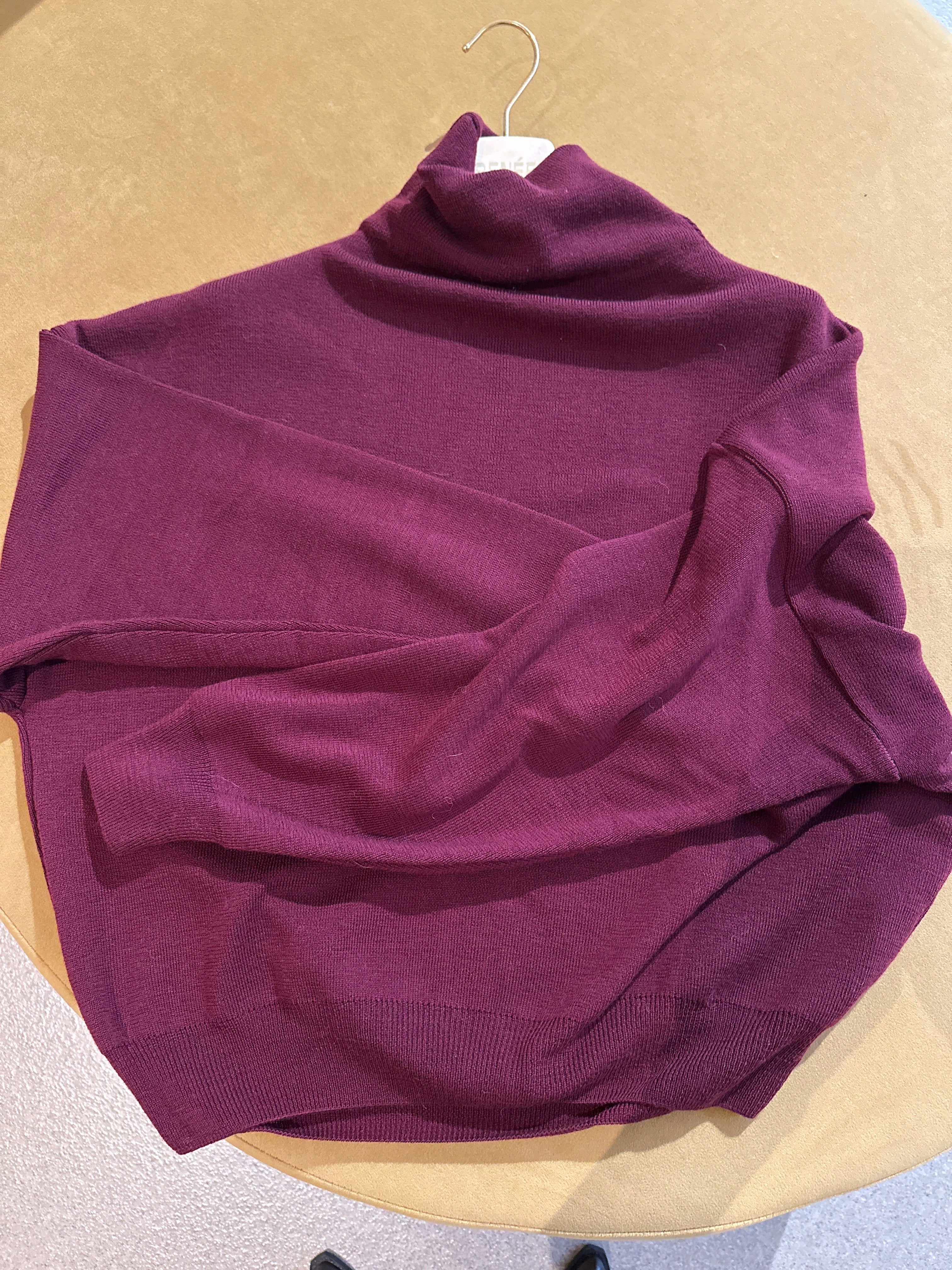 100% merinowol, wolt niet op. Donker burgundy kleur, met soepele losvallende kraag. Trui van het prachtige Belgisch merk Les Bohemiennes Lab.