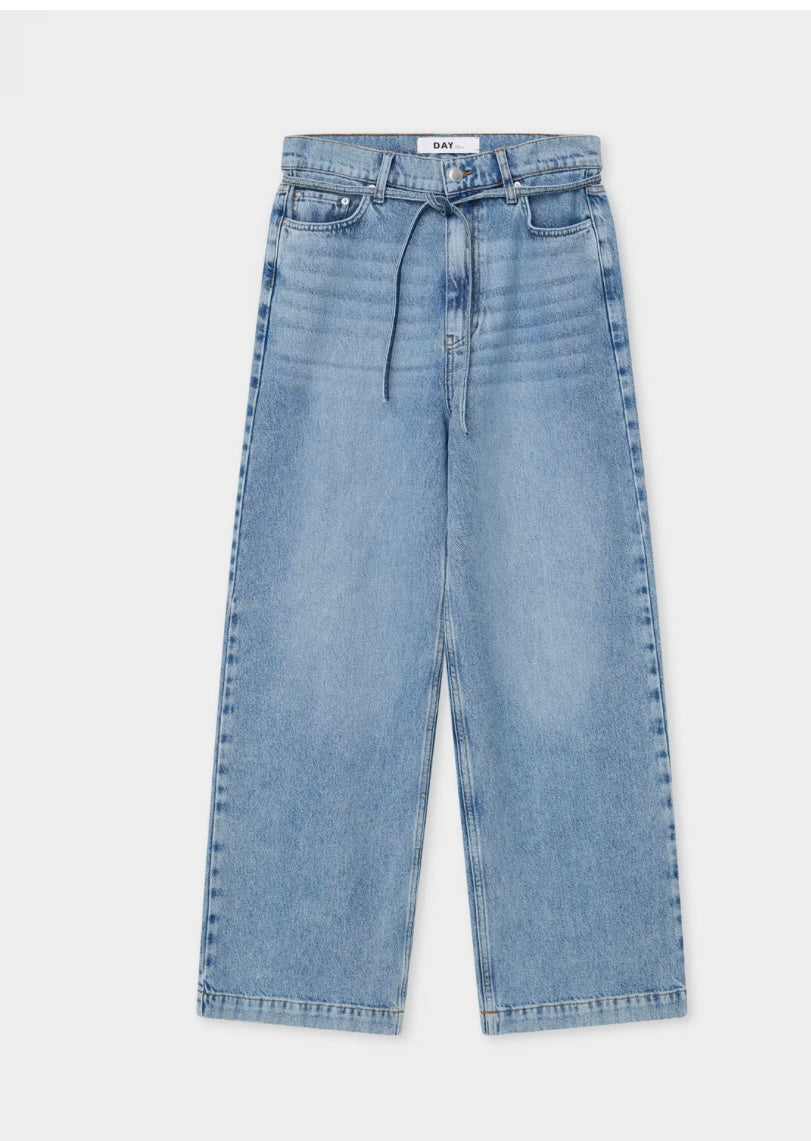 Baggy jeans by brand DAY. These low-rise, straight-leg jeans feature five pockets, a zip fly with button closure, and a removable tie belt at the waist. The jeans have a loose fit.