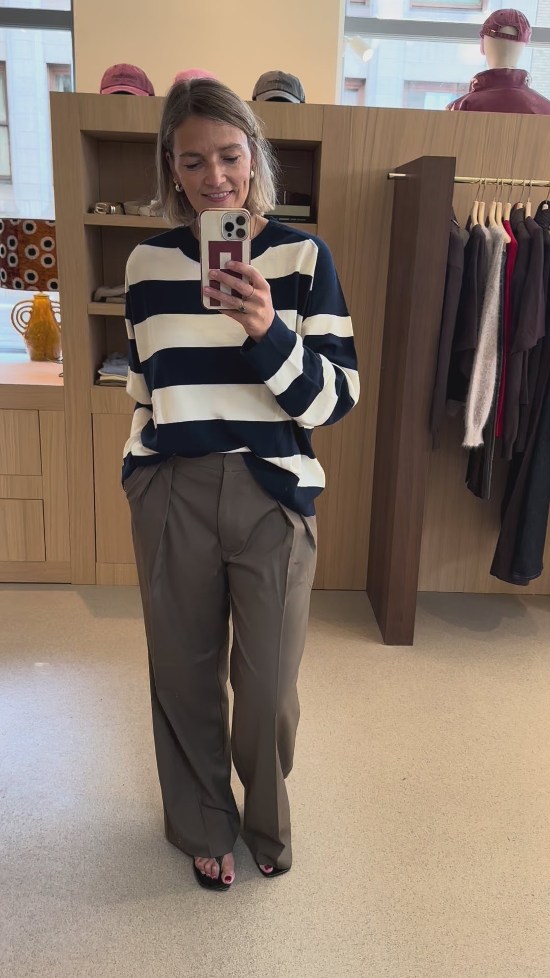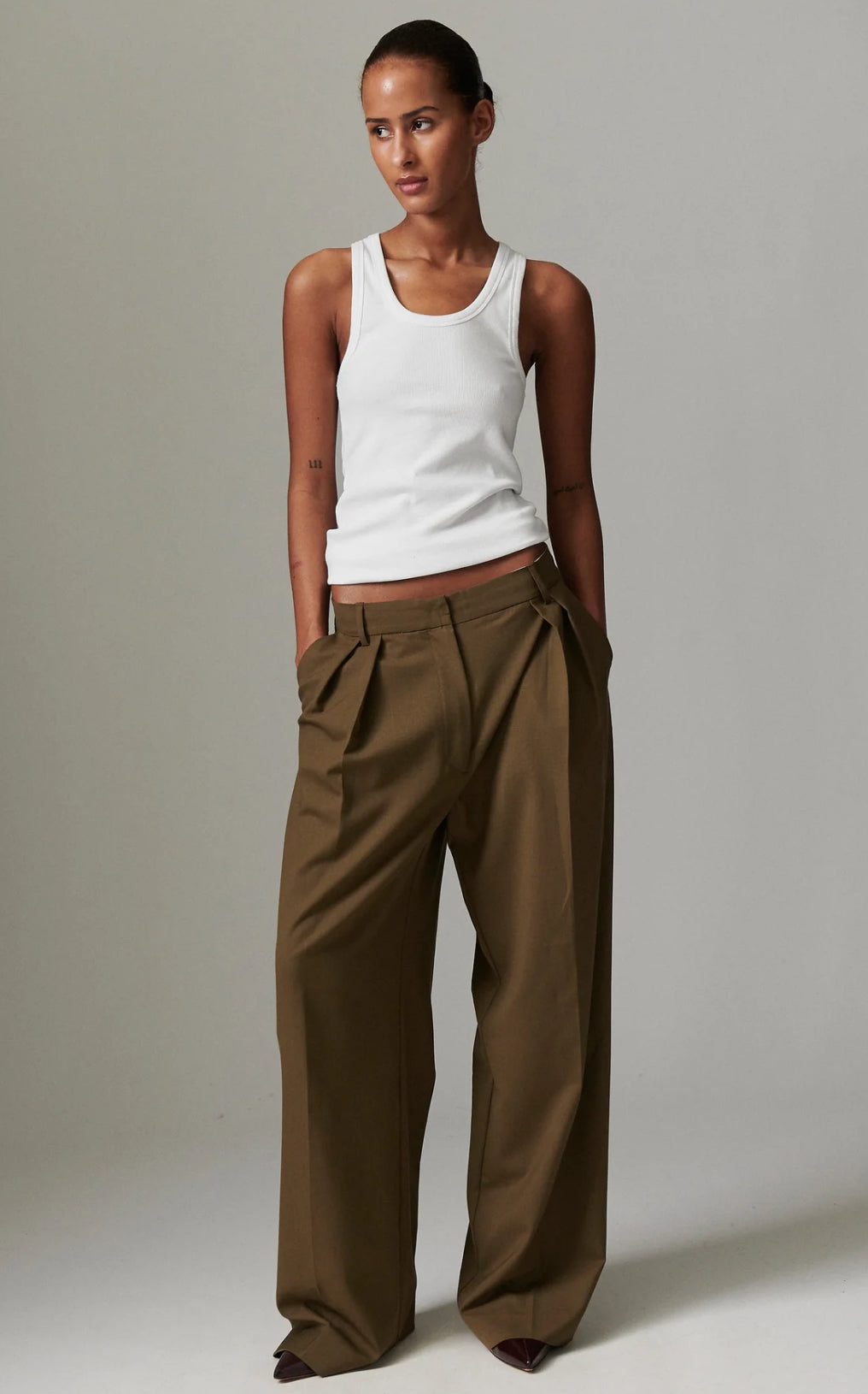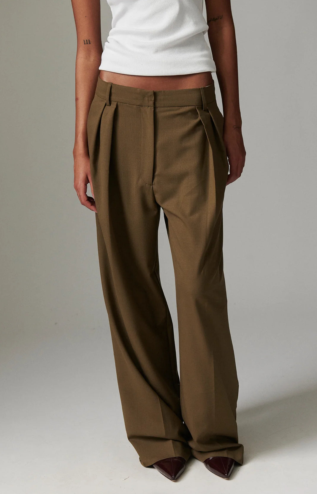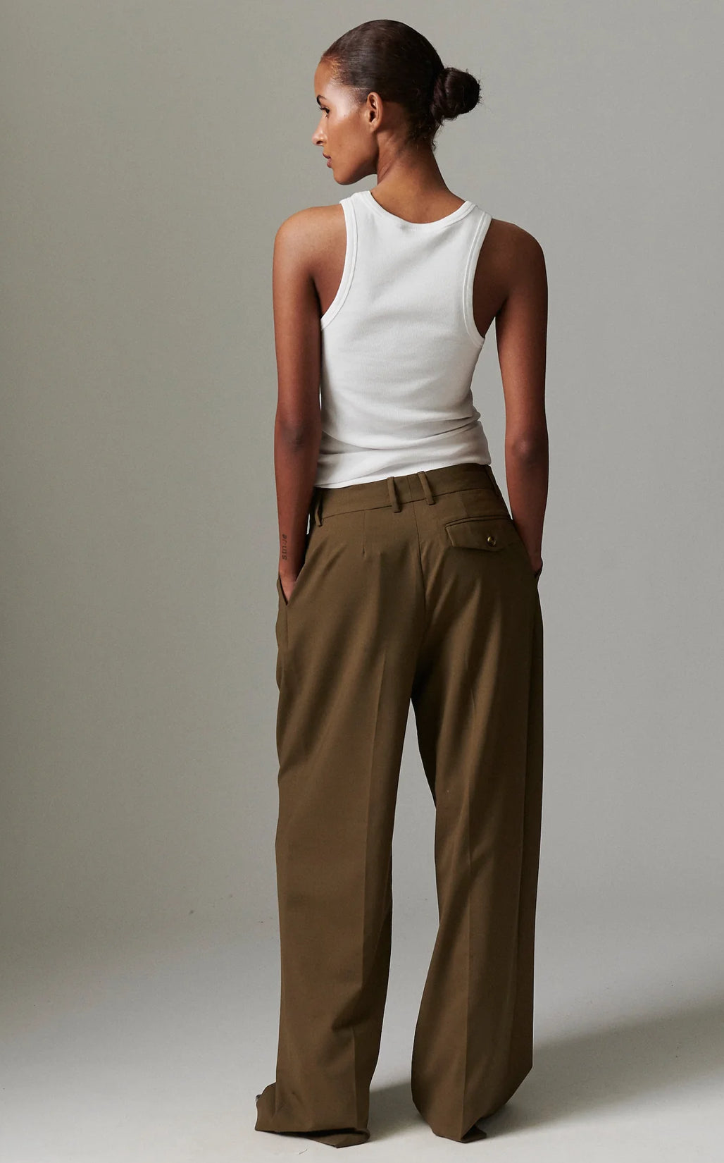 These high-rise, wide-leg trousers have pleats at the waist, a zip fly with a hook closure, and side pockets. There is a single patch pocket in the back. These trousers have a regular fit. Size down with 1 size.