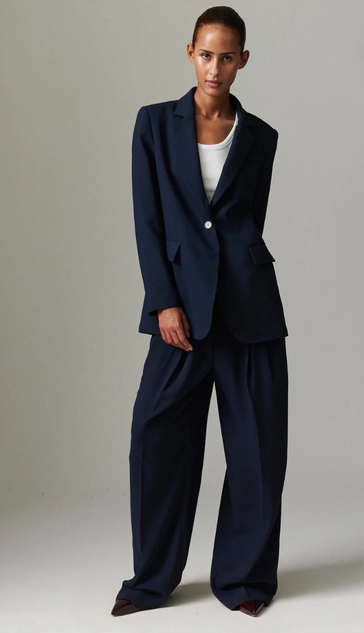 These high-rise, wide-leg trousers have pleats at the waist, a zip fly with a hook closure, and side pockets. There is a single patch pocket in the back. These trousers have a regular fit.