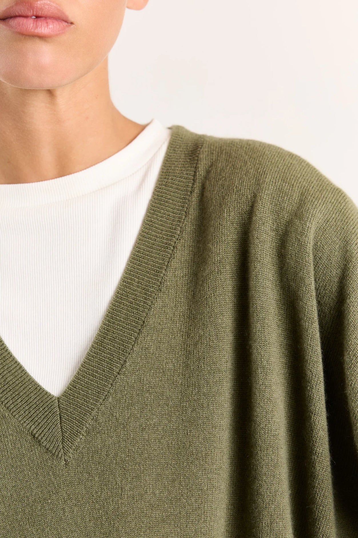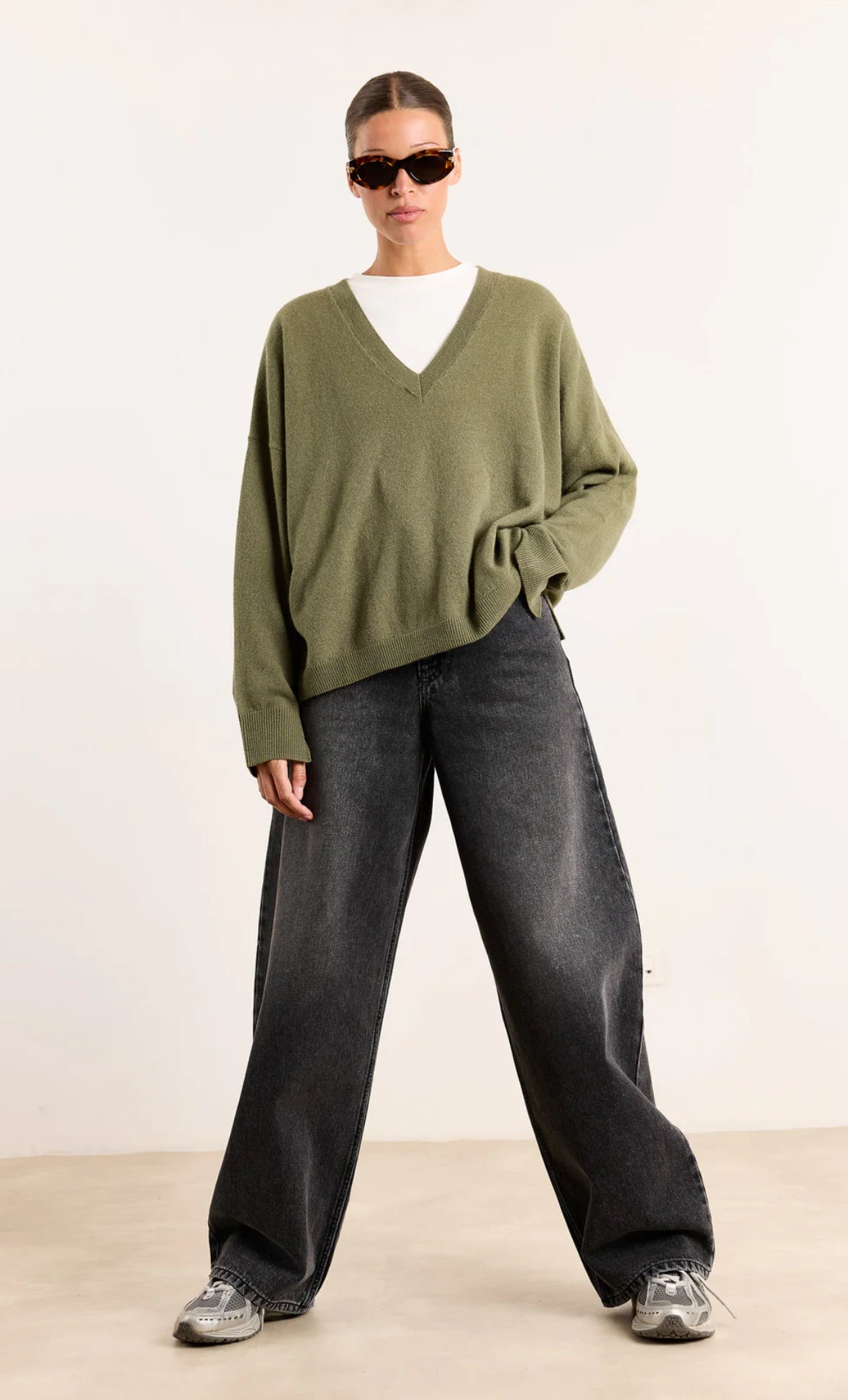 This cashmere V-neck sweater feels like a deep exhale. Spun from soft cashmere yarn, it’s cut generously with dropped shoulders and elongated sleeves that gather softly at the wrists. The wide V neckline invites nonchalance: wear it slouched off one shoulder or layered with a crisp tee for contrast.