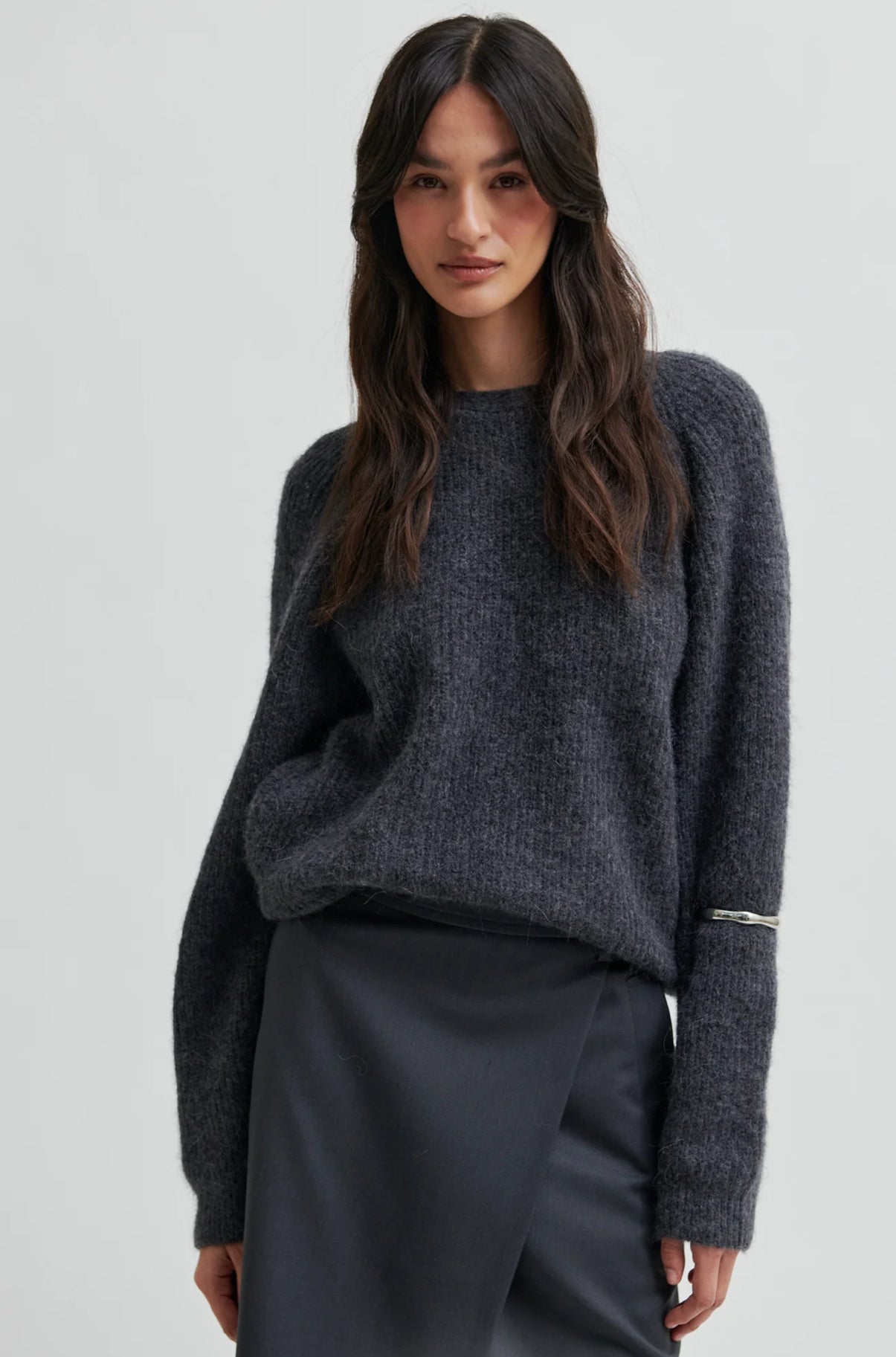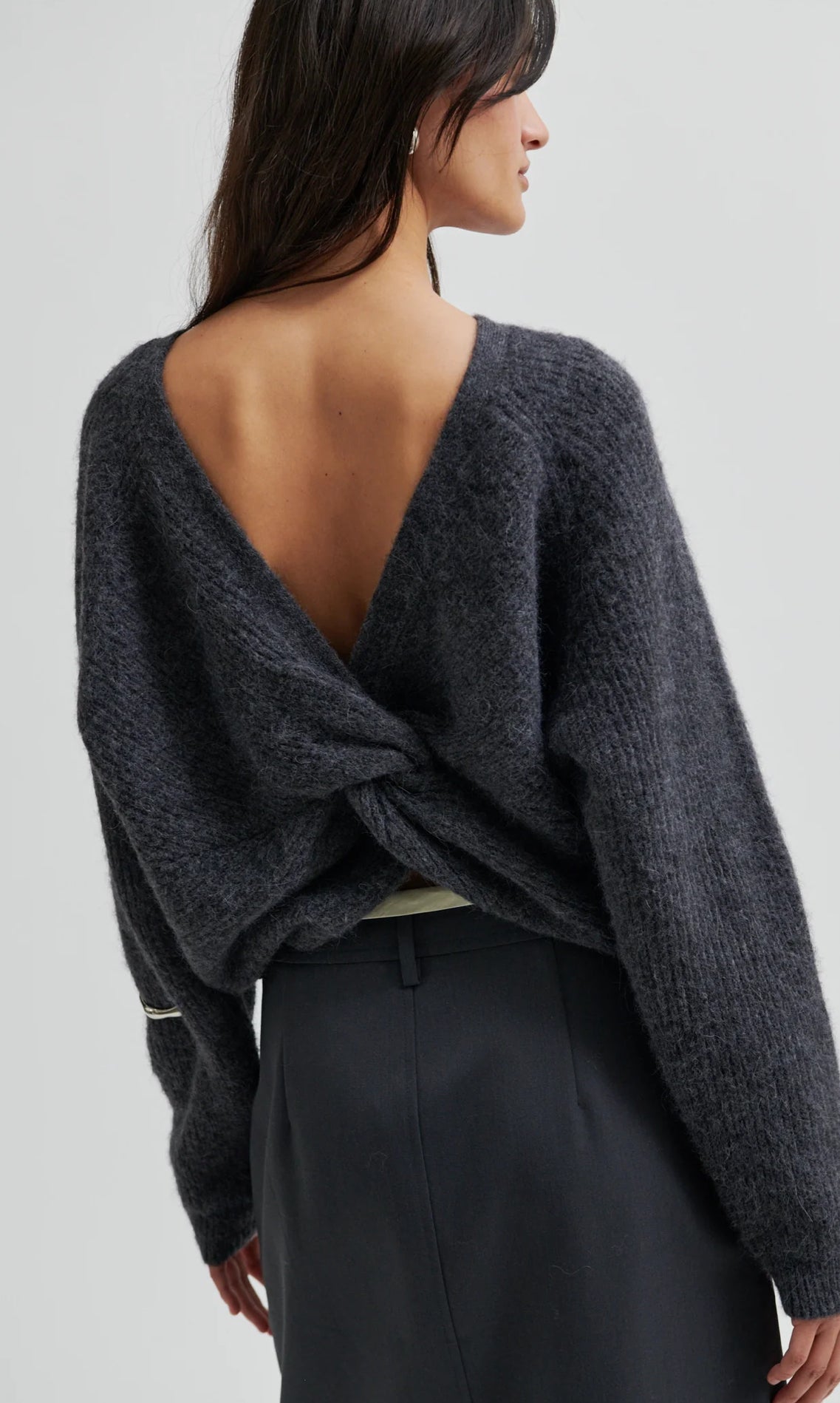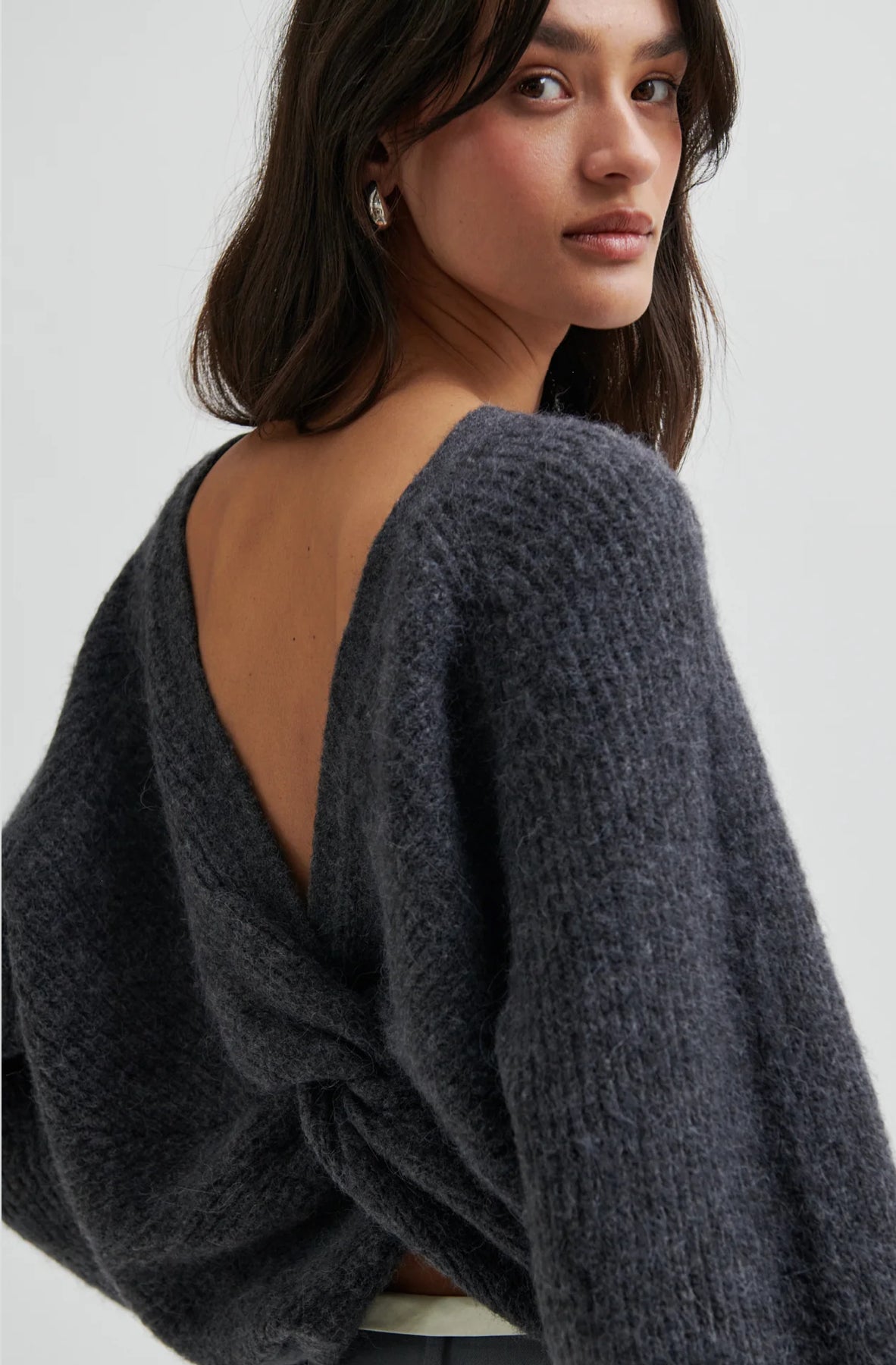 Second Female knotted pullover. The pullover is made in soft fabric with a fluffy texture. Featuring a round neck and knotted detail at the back, which can also be worn the other way. Dropped shoulders and long sleeves. Loose fit.