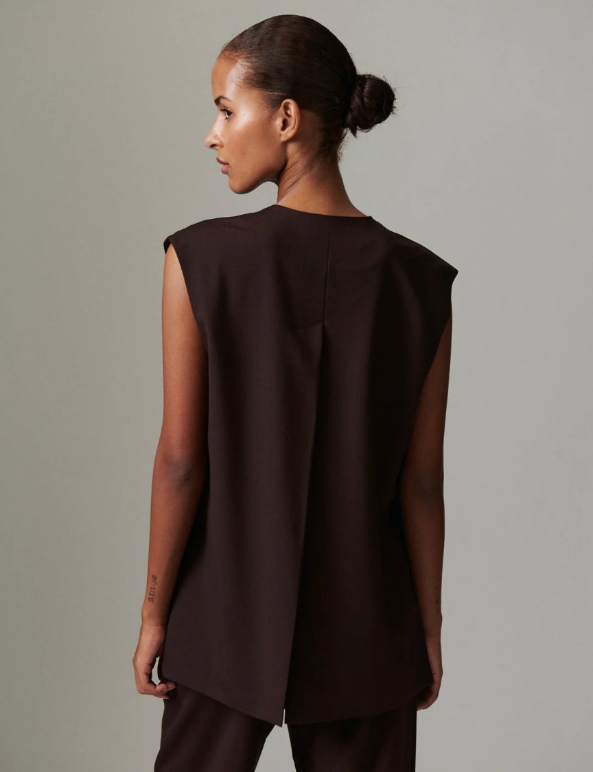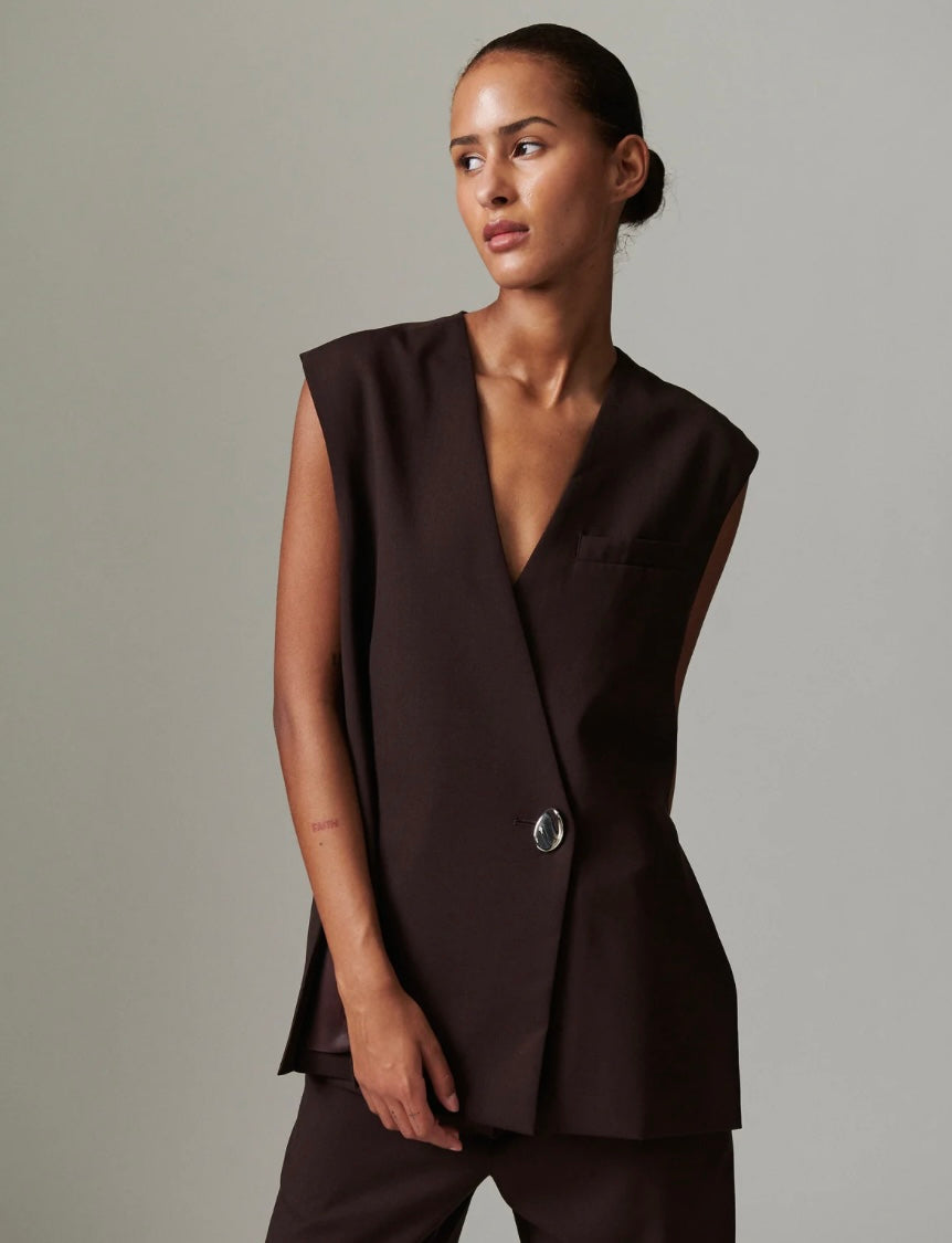This waistcoat features a deep V-neck, large bauble button closure, and a chest pocket. There are slits at the sides and a long opening in the back that has a button closure in the middle. The waistcoat is fully lined and has a loose fit.