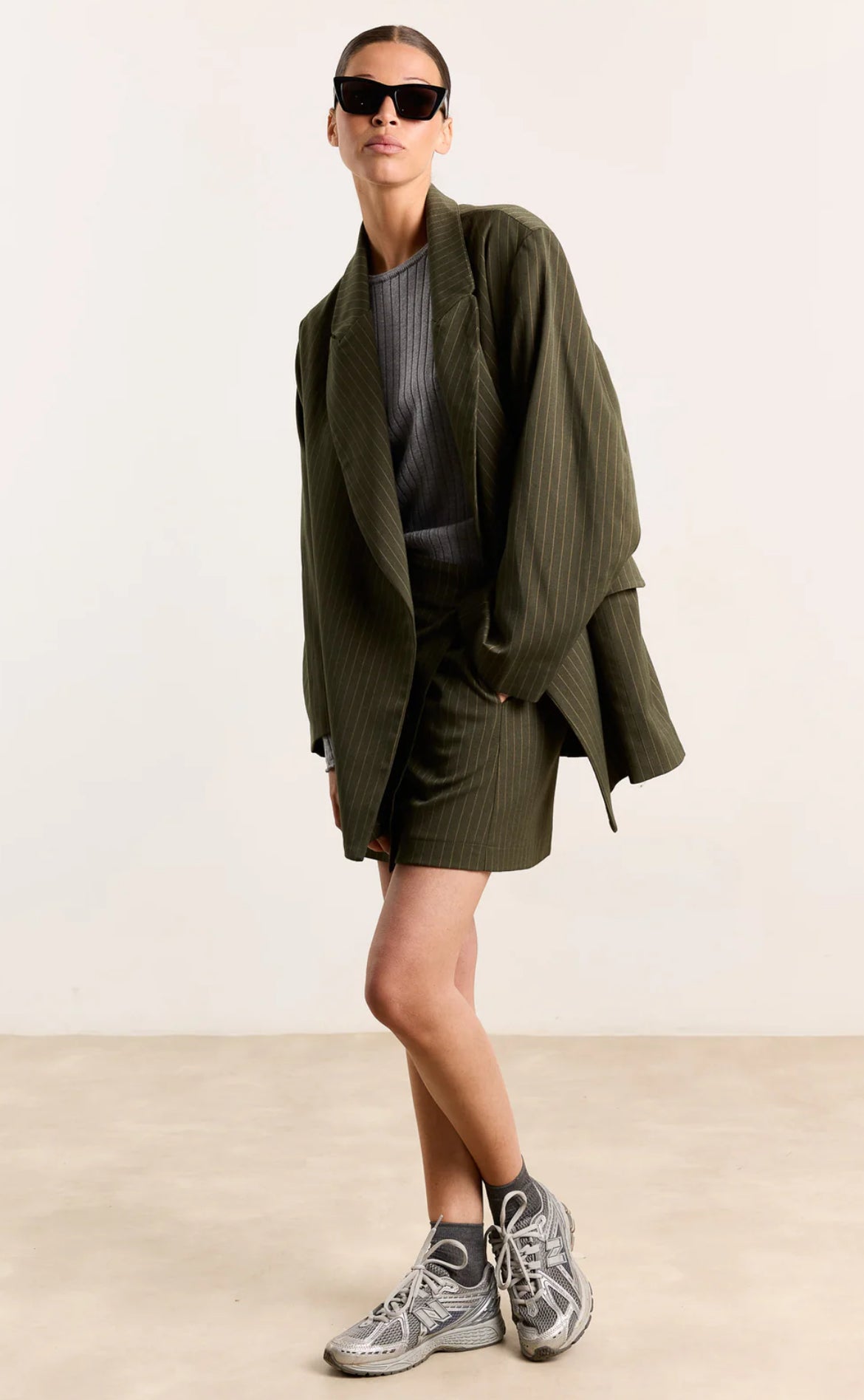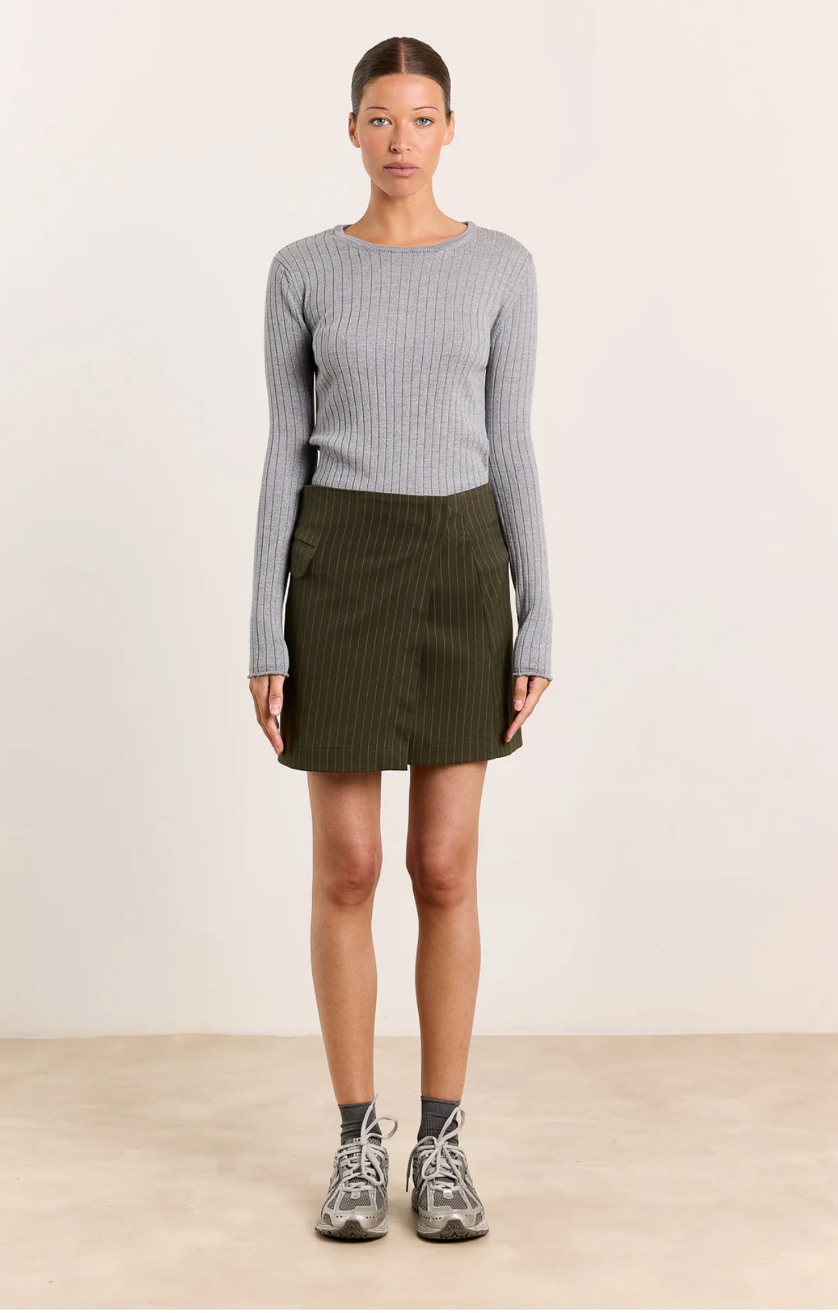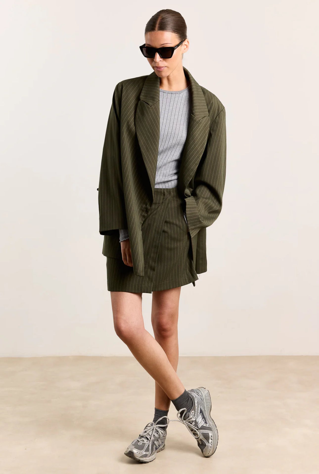Crafted in a rich suiting fabric with a subtle pinstripe, this mini skirt plays with proportion through a clean A-line silhouette and a single, sharp flap pocket detail. Designed with clean lines and presence, perfect from meeting rooms to late dinners.