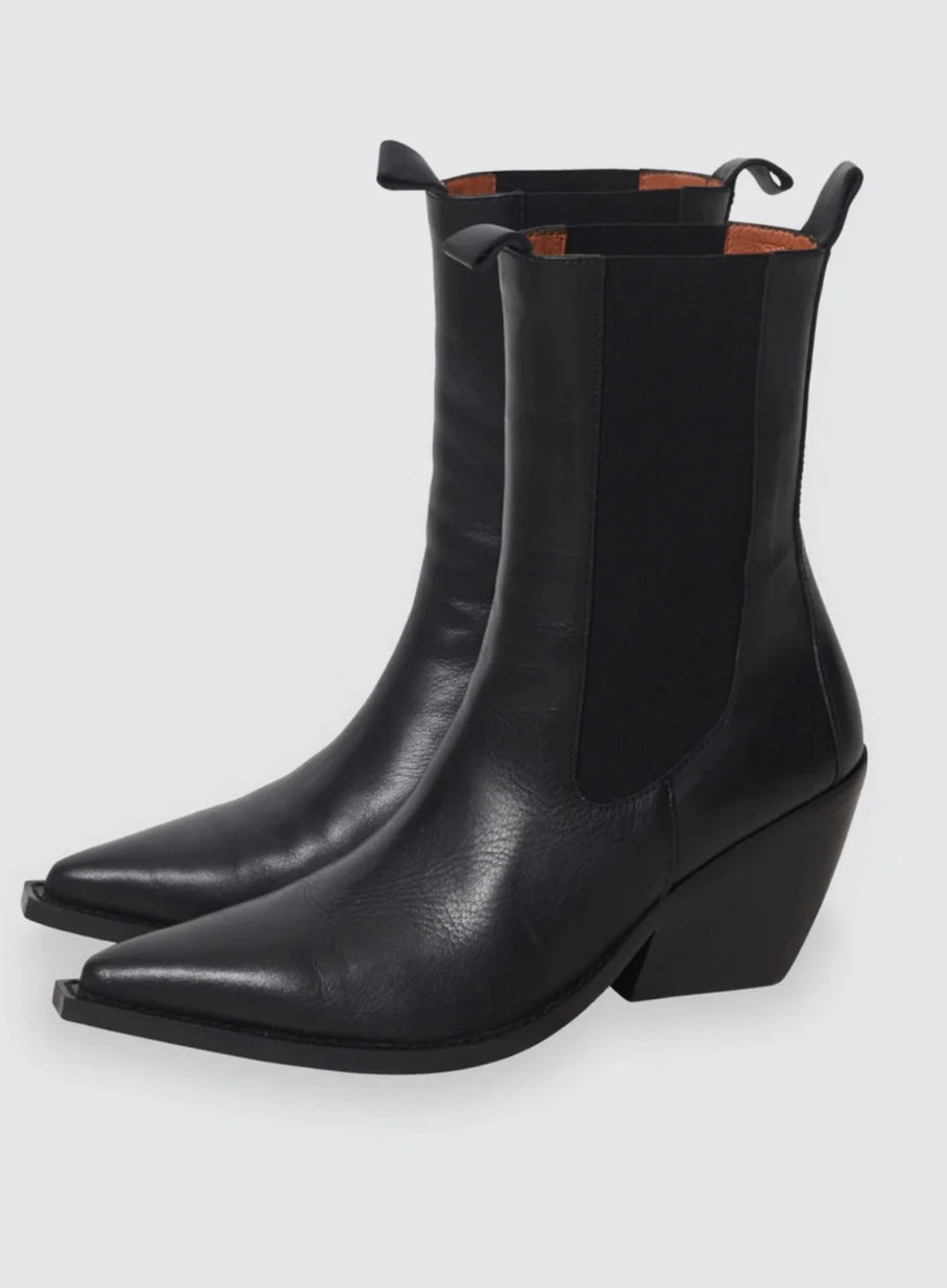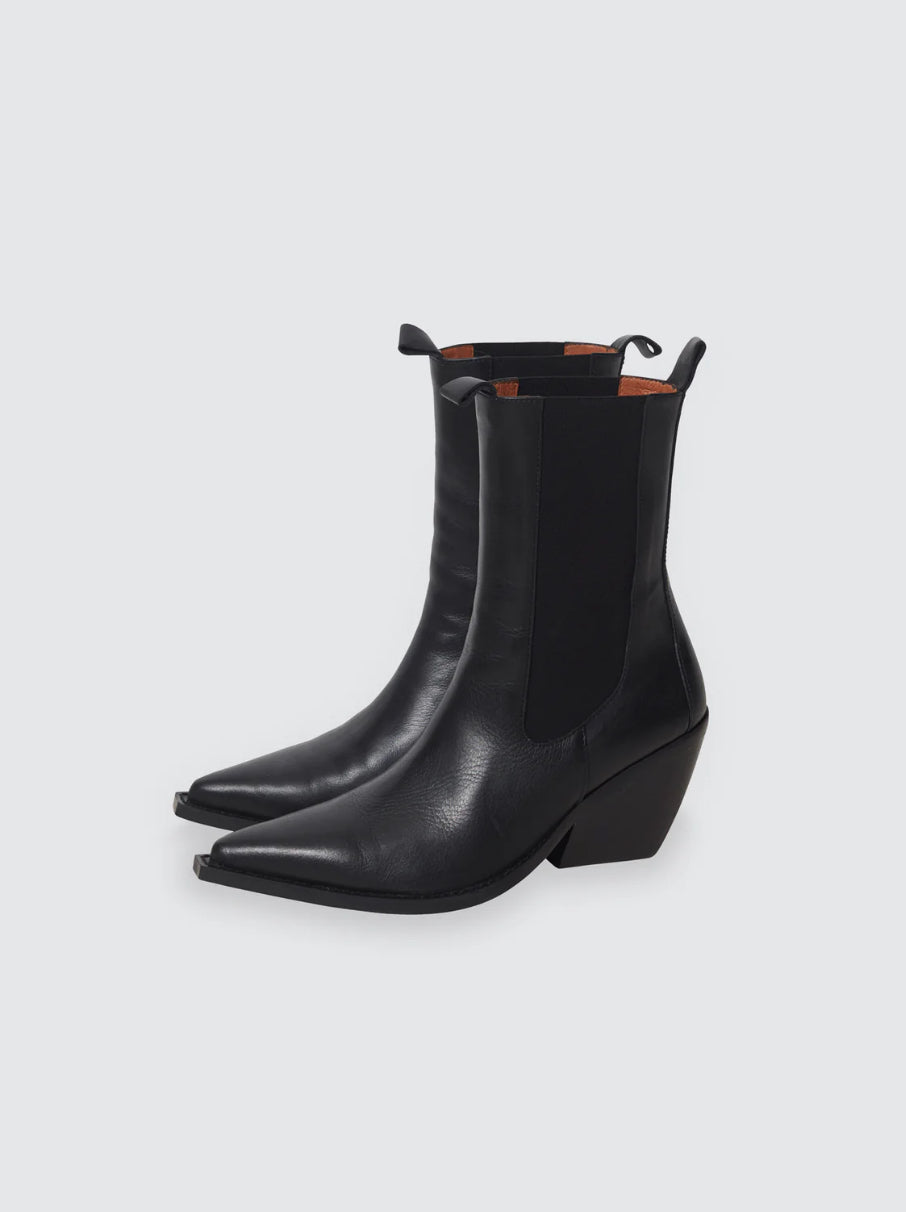 These leather pistol boots have a pointed toe and pull tabs on the front and back. There is stretchy webbing at the ankle for comfort.