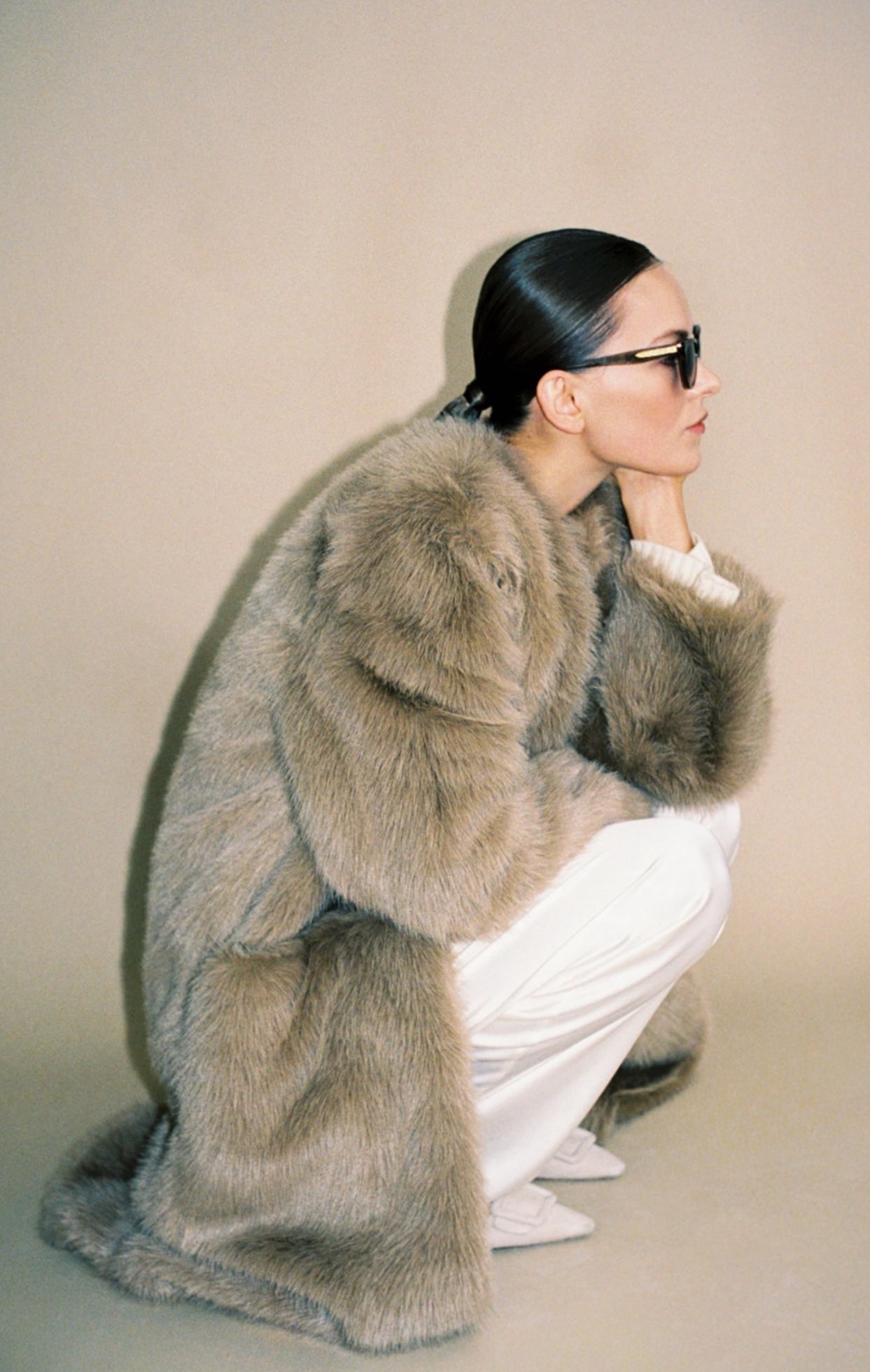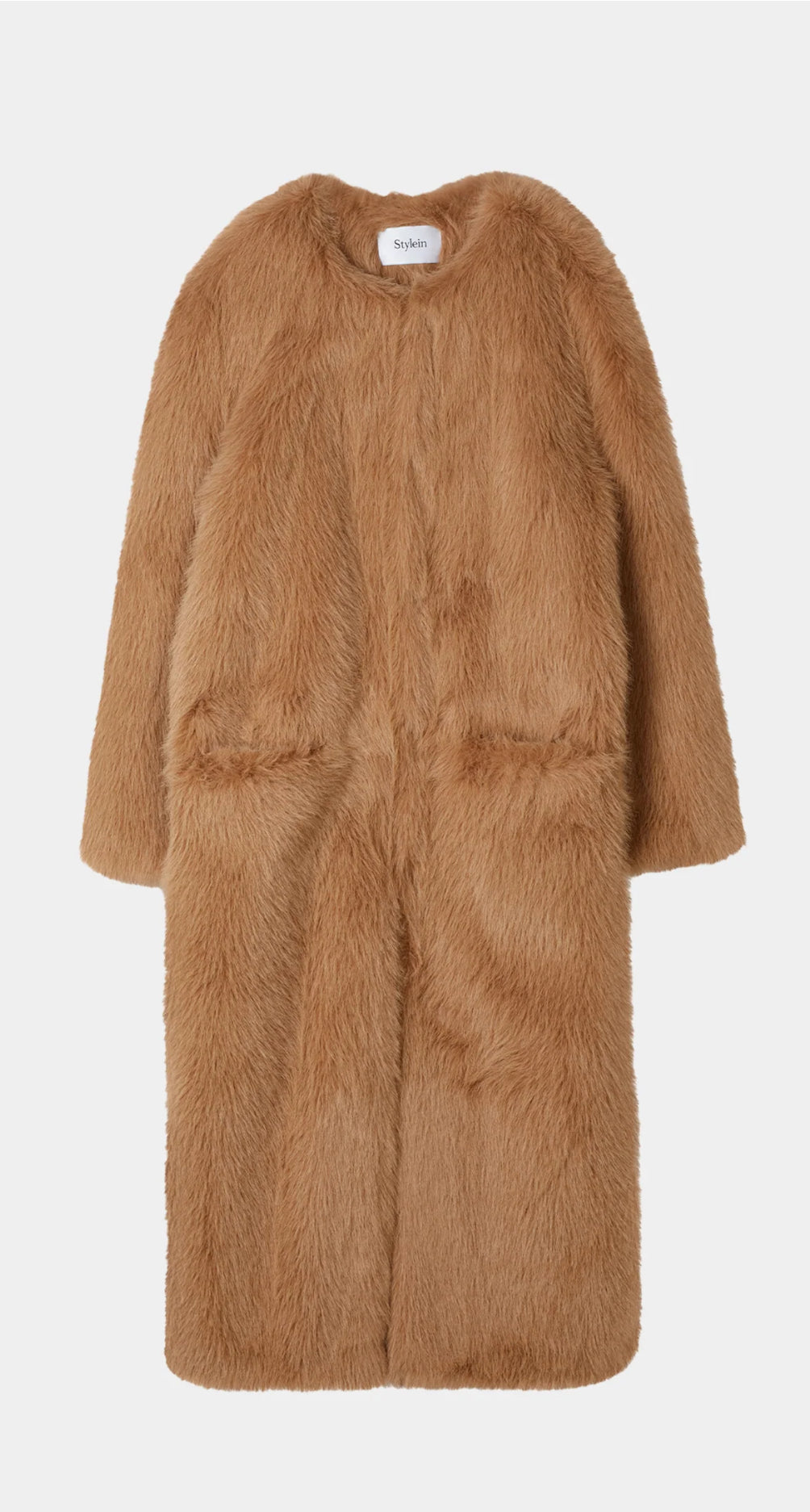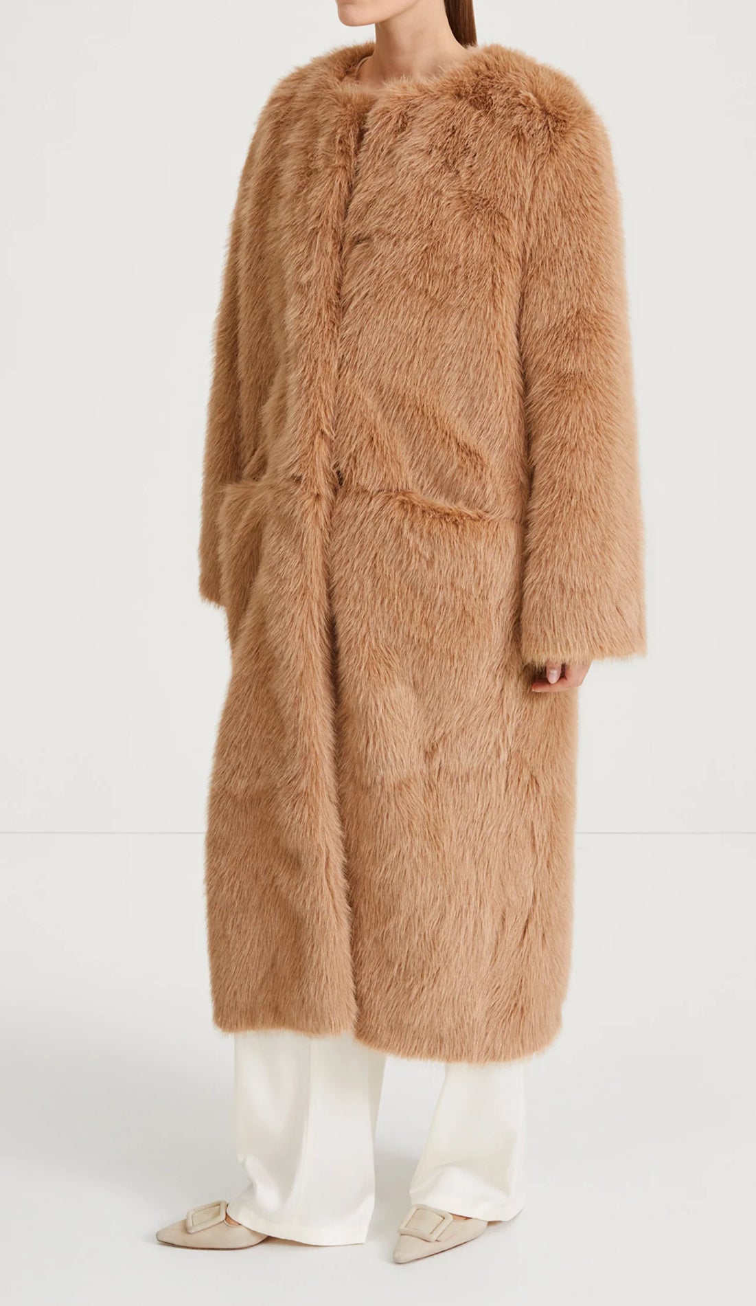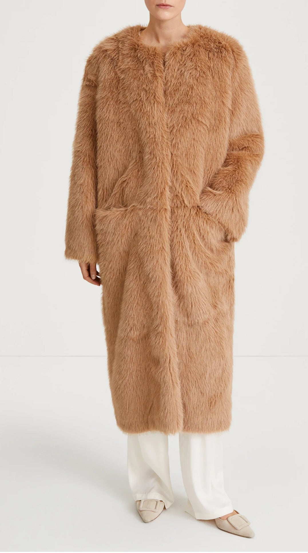 Haiza is a long coat crafted from soft faux fur, designed with a rounded neckline and full-length sleeves. It features two front pockets, a clean snap-button closure, and a slit at the back hem.