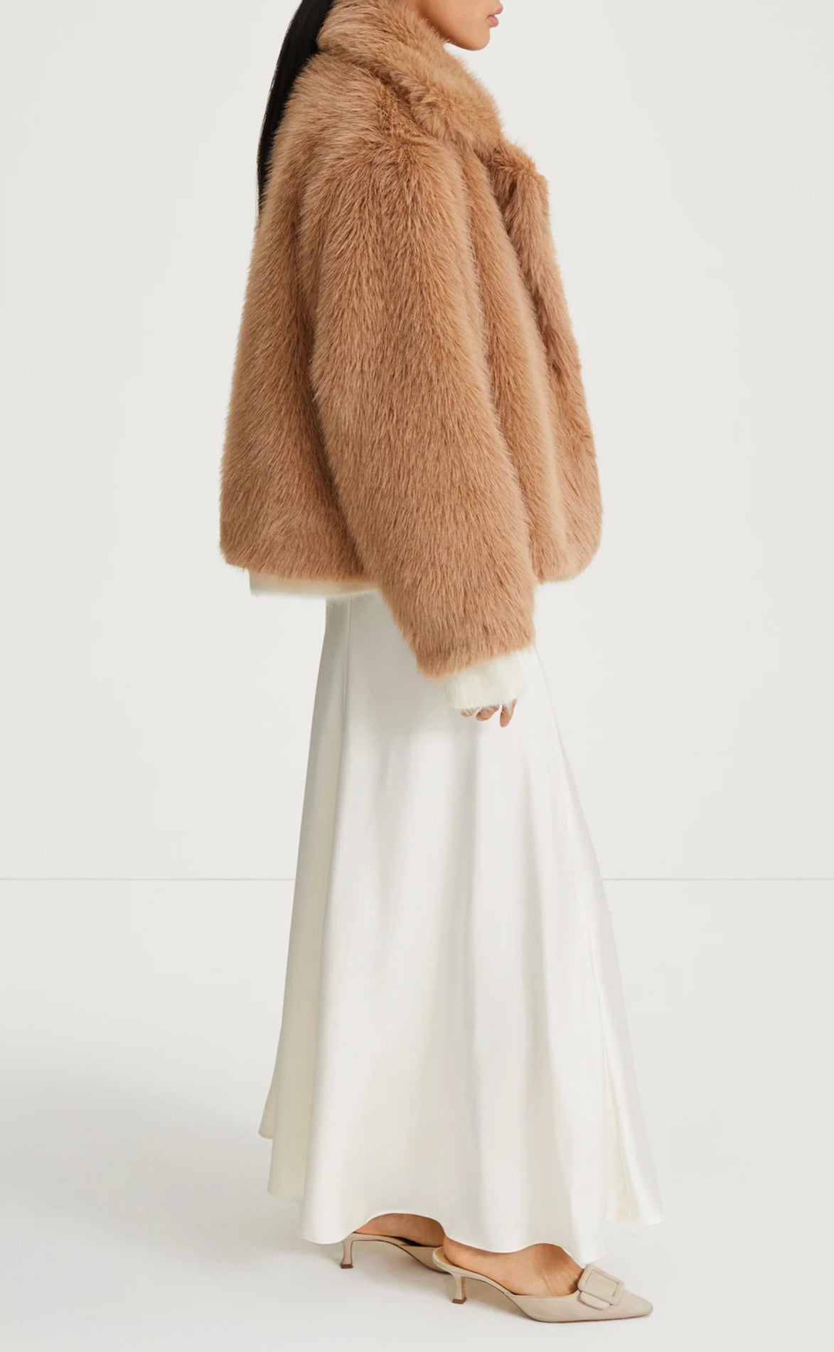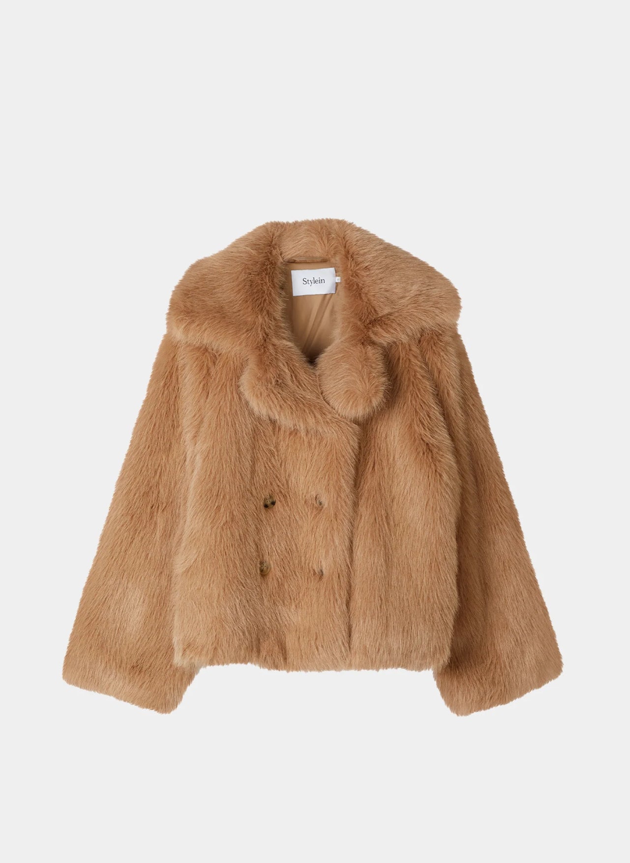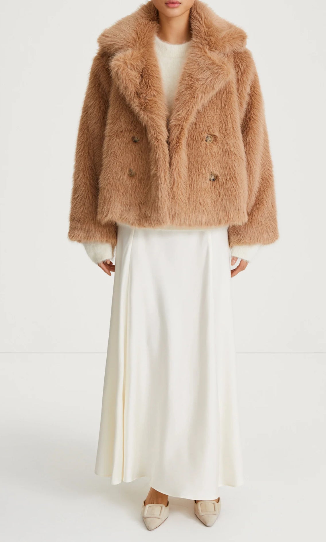 Hazel is a loose, cropped jacket crafted from soft faux fur. Fully lined for comfort, it features a classic collar, full-length wide sleeves, and discreet side seam pockets. The double-breasted front is detailed with six buttons, along with an extra button on the right front lapel for a secure and polished finish