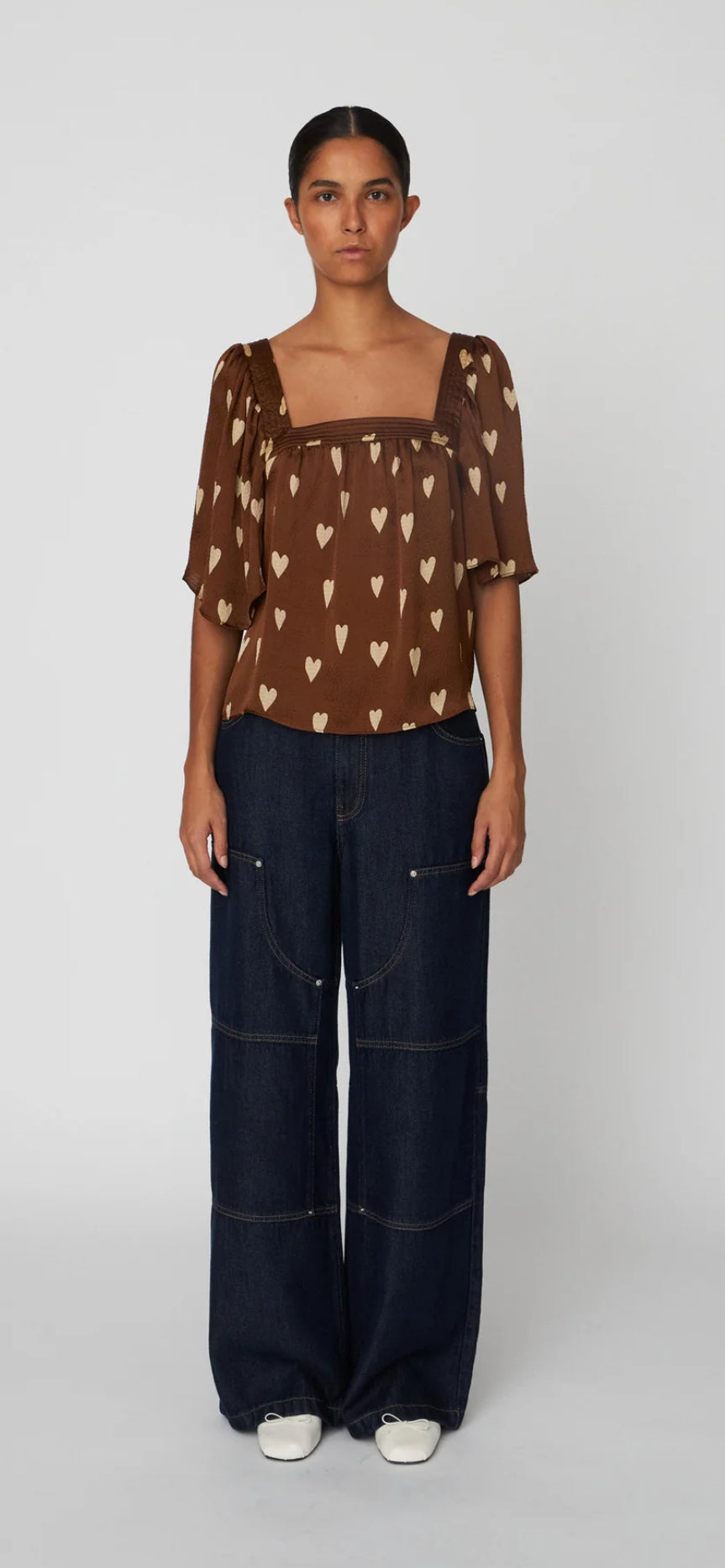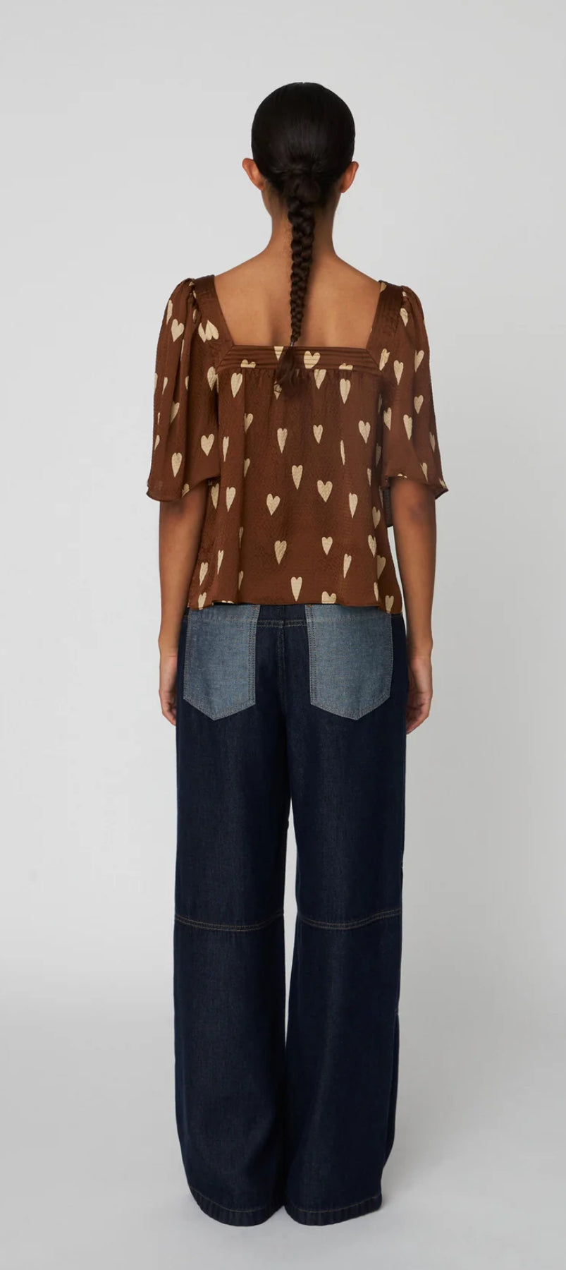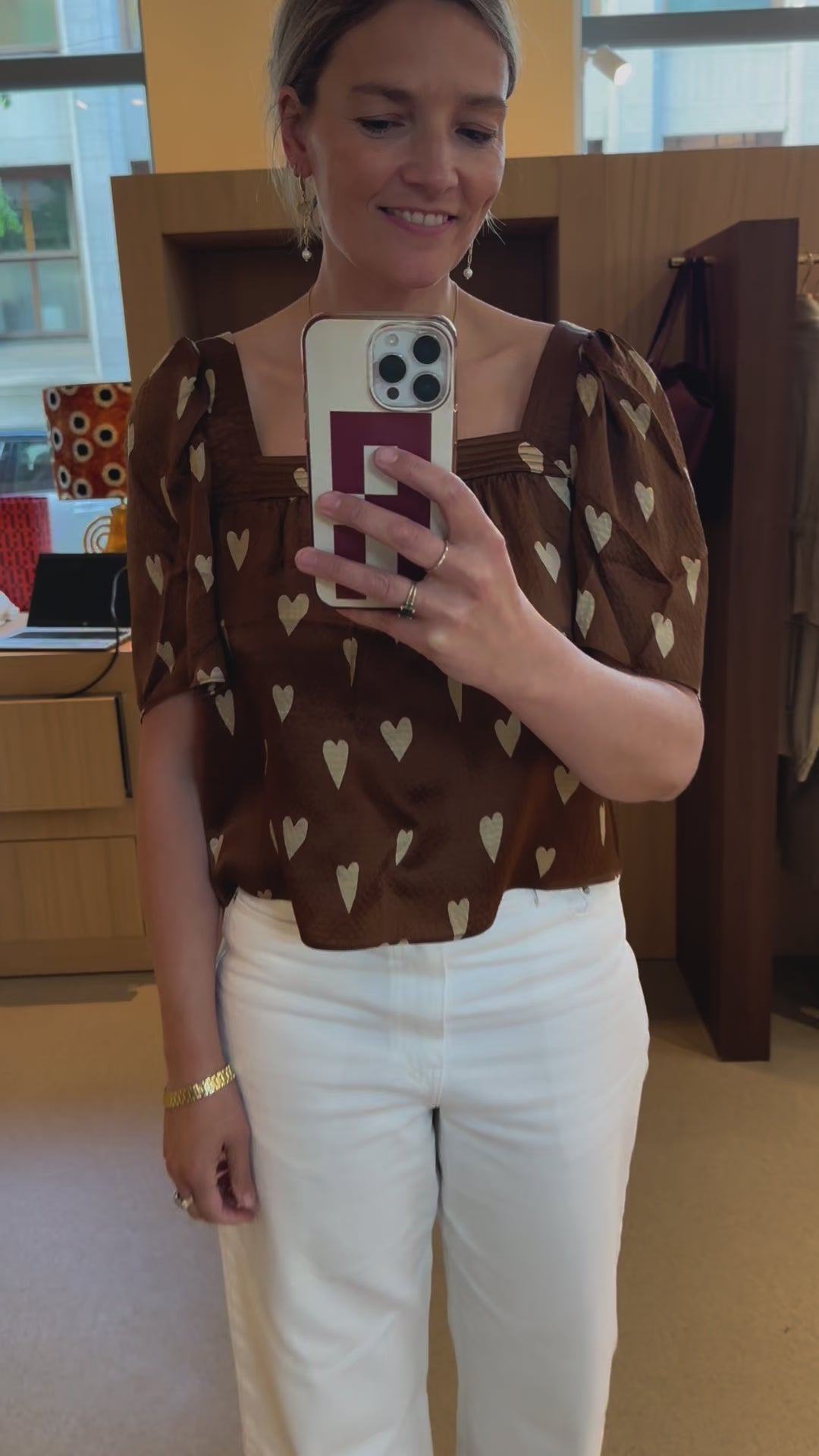Top made from 100% silk with a heart pattern, square neckline, and elbow-length sleeves.