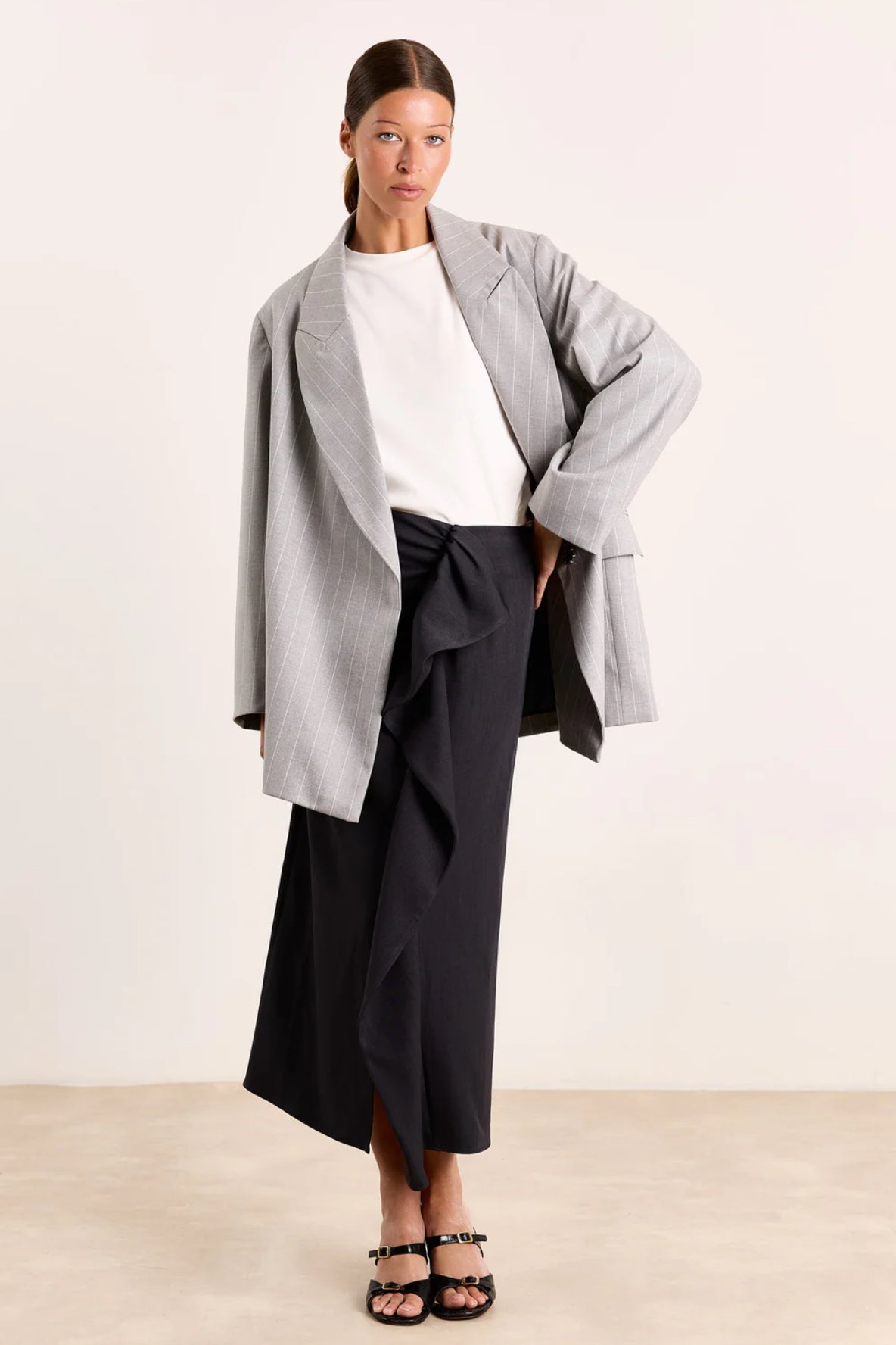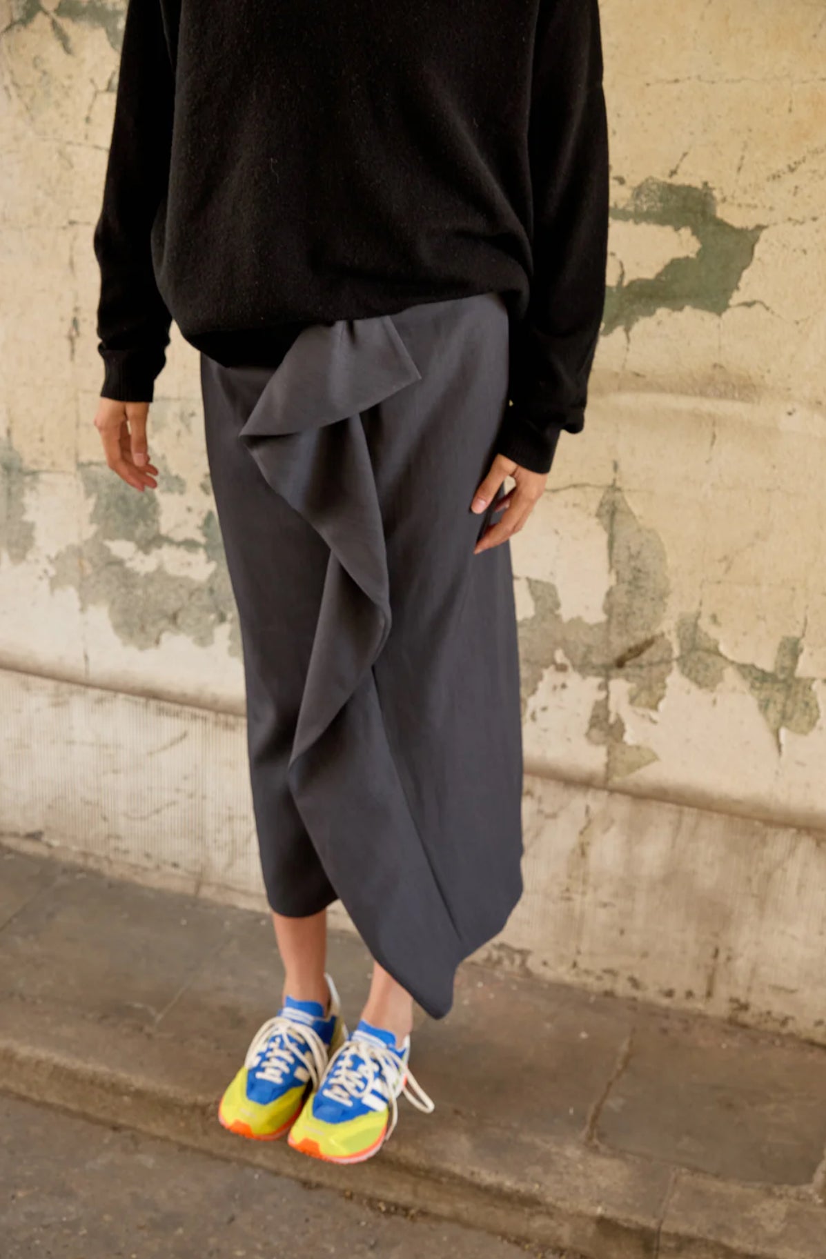 This 7/8th skirt redefines the classic skirt with a wrapped ruffle detail that is present but still subtle. Style it with mathcing blazer Fanny for an artful play on proportions, or keep it sleek with a fine knit (such as Dahlia) tucked in. A confident choice for women who like their classics with character