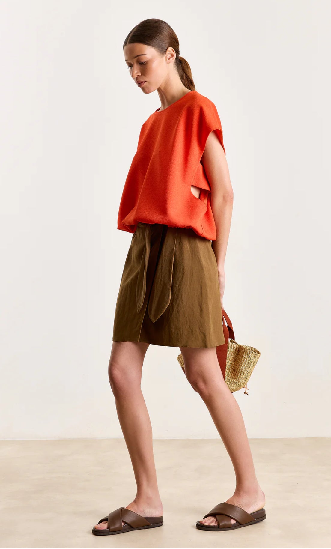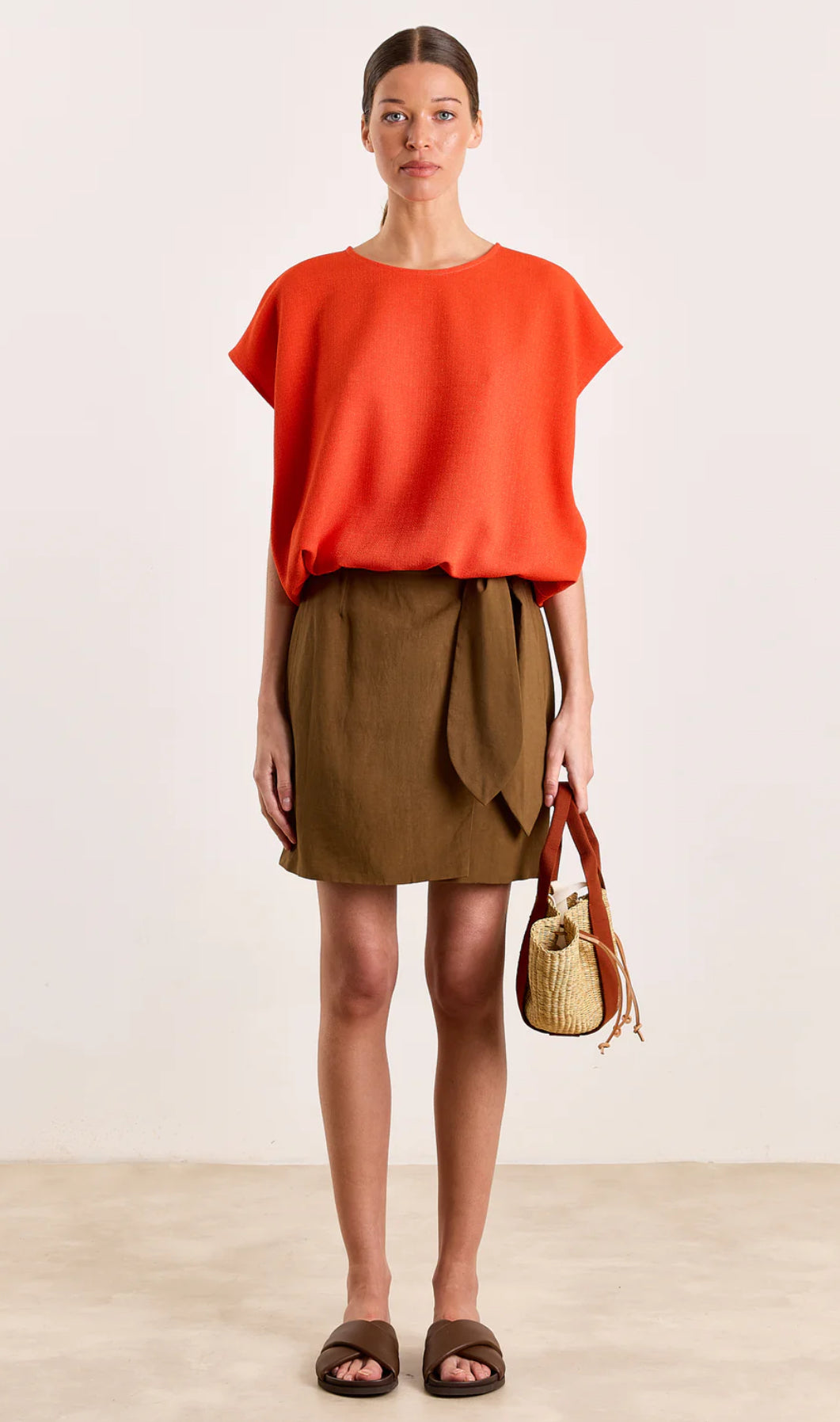 This mini skirt plays it cool with a clean silhouette and a wrap-style front, finished with a bow that ties neatly at the waist. Pair with Michou and slides for off-duty days, or elevate it with a tucked-in blouse and heeled sandals for warm evenings out. It’s one of those pieces that does both street-casual and laid-back polished, no overthinking required