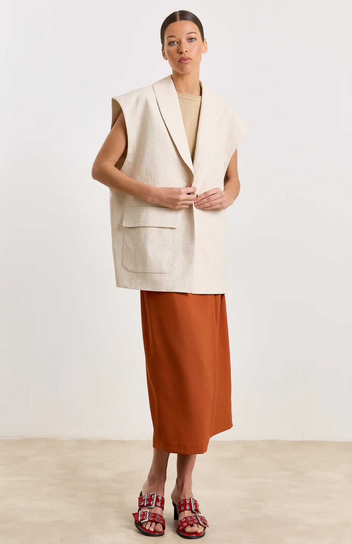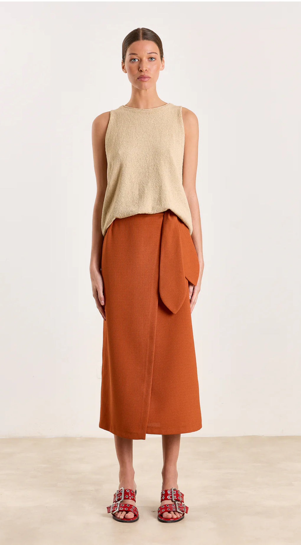 With its sharp wrap design and tie-up waist, this skirt brings just the right amount of structure to a laid-back look.
