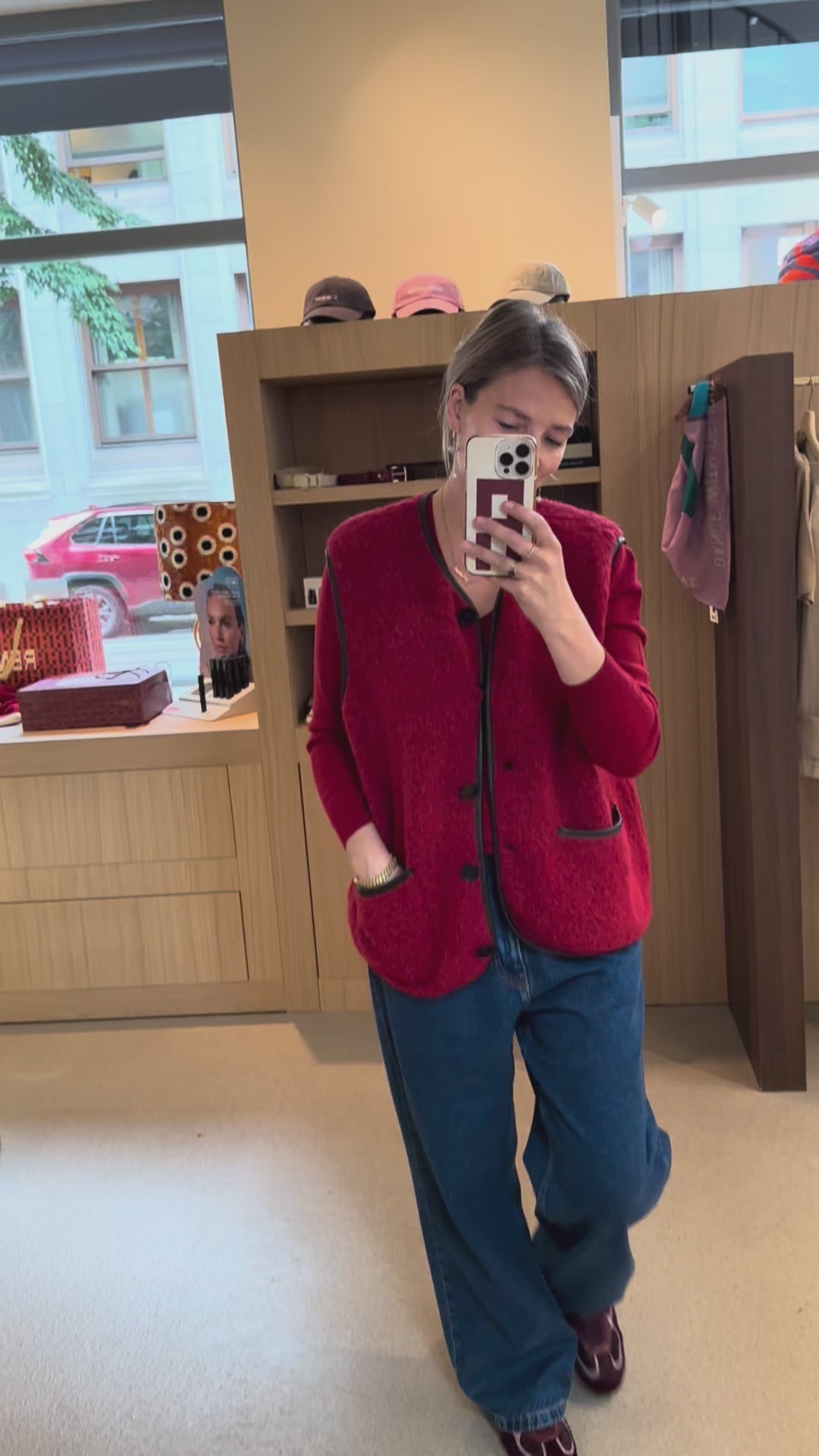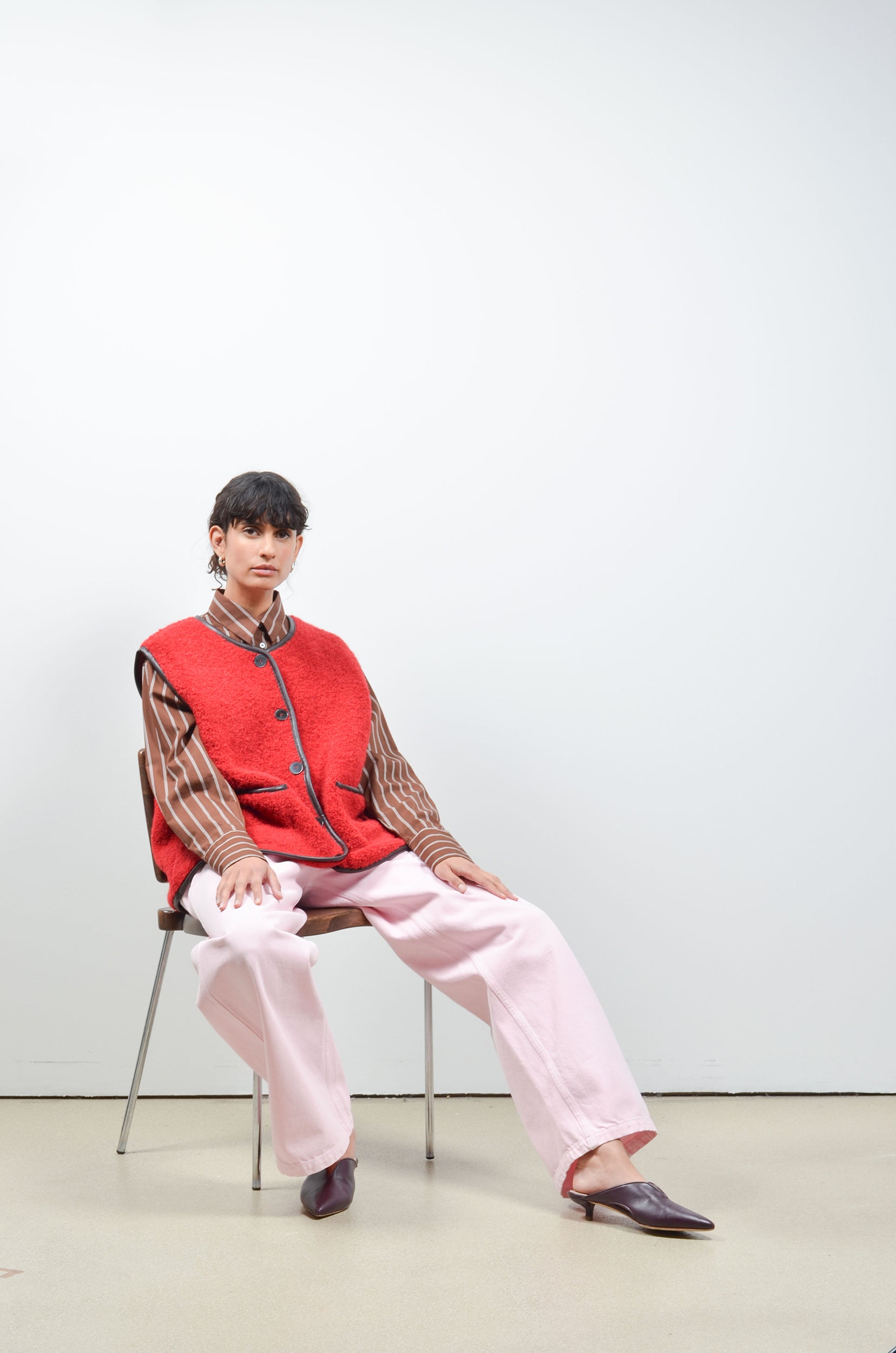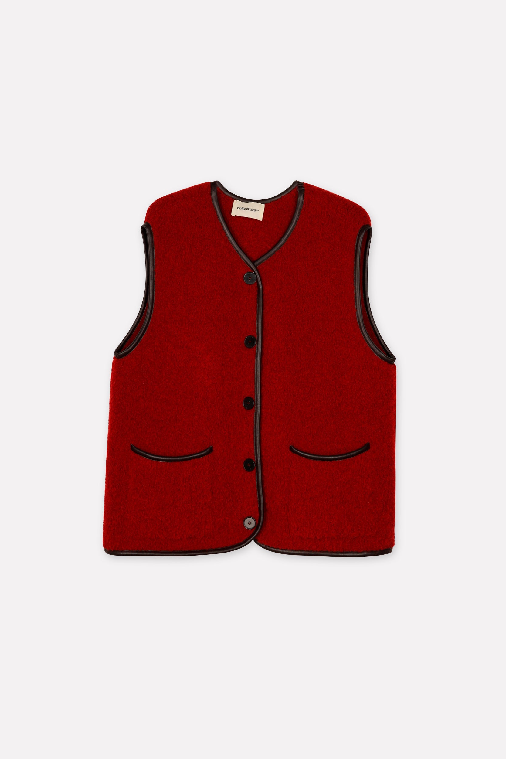This sleeveless cardi by Belgian brand Collectors Club is made from a bouclé yarn, has a loose fit, closes with buttons at the center & is bordered with a dark brown faux leather bias tape.This item is perfect for layering in the colder days.