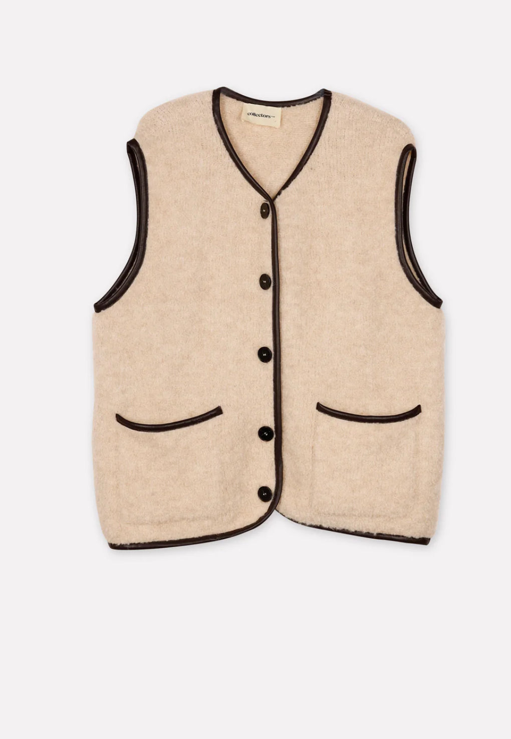 This sleeveless cardi by Belgian brand Collectors Club is made from a bouclé yarn, has a loose fit, closes with buttons at the center & is bordered with a dark brown faux leather bias tape.This item is perfect for layering in the colder days.