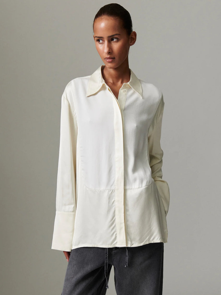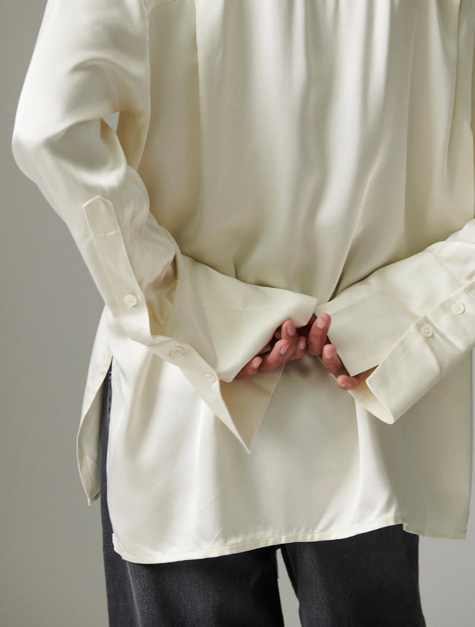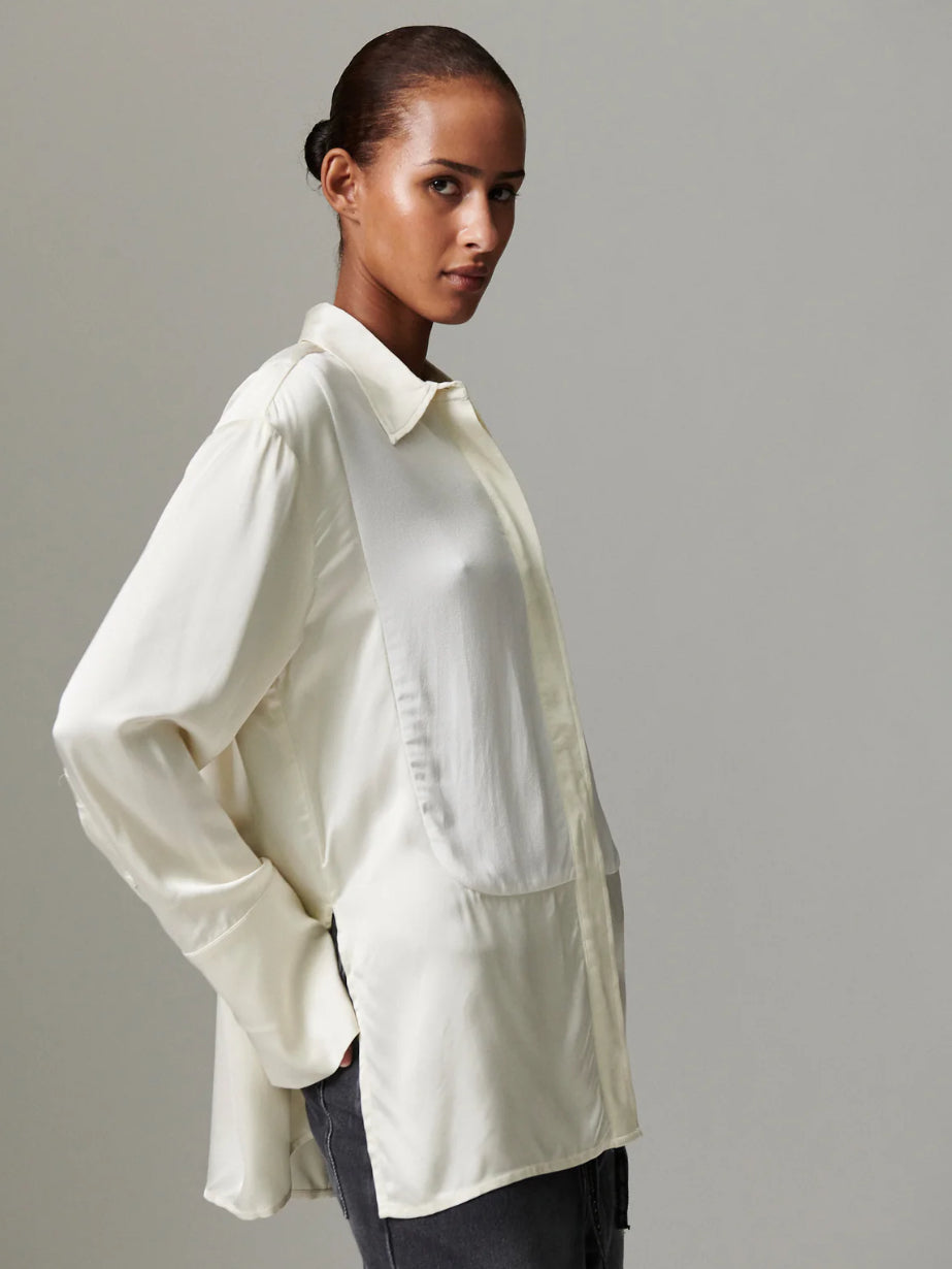 This fluid button-up top features oversized cuffs, a dipped hem, and a yoke in a contrast fabric. The top has an oversized fit.