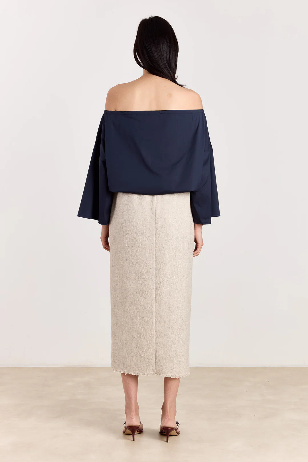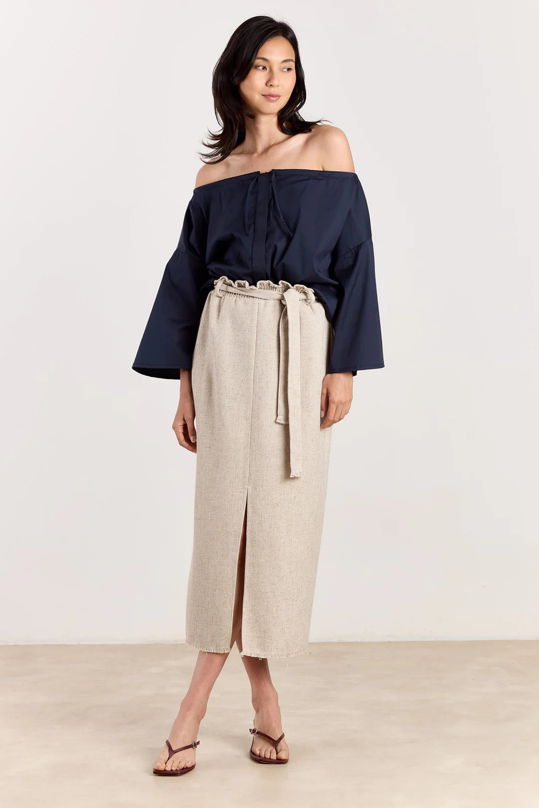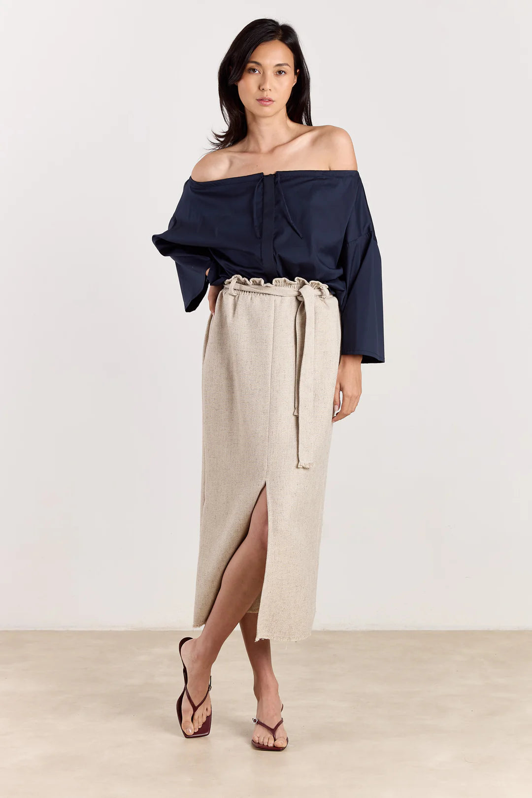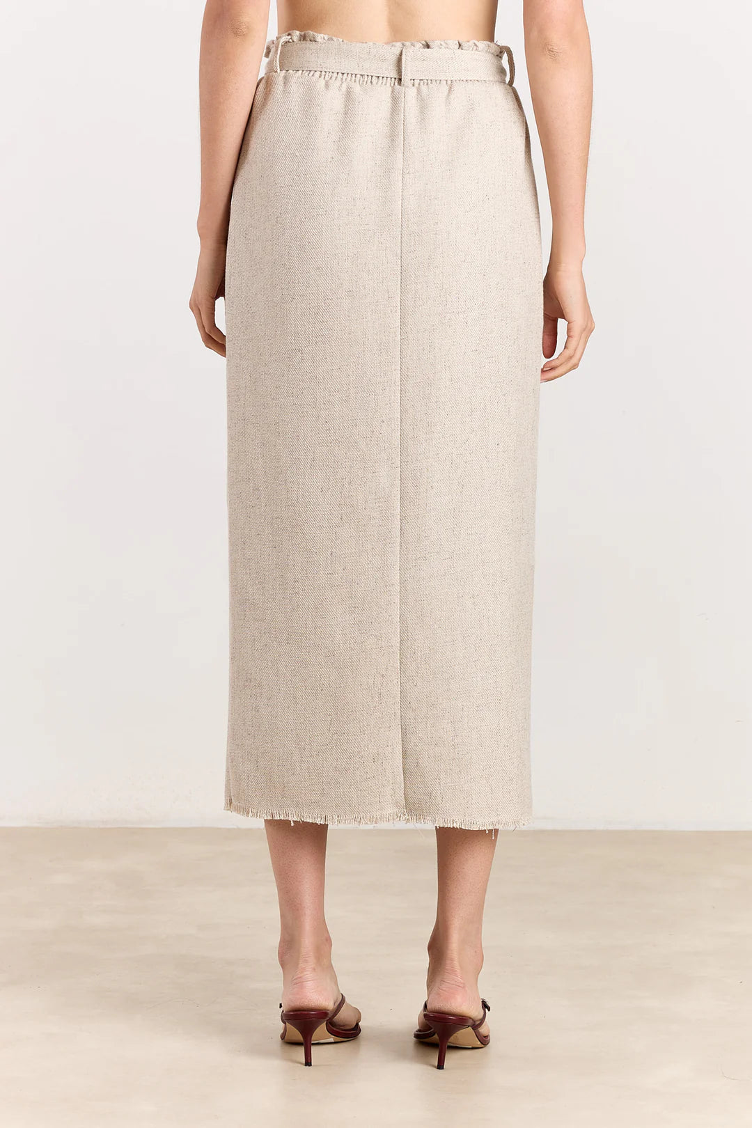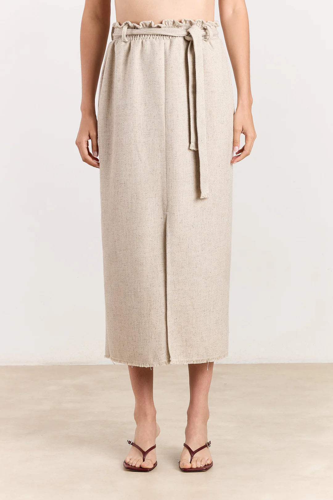 This skirt is defined by its linen melange fabric and straight, elongated shape. The natural texture gives the surface a slightly irregular look, while the front slit breaks the clean vertical line. Finished with a soft, gathered waist and a tied belt, it balances structure with a relaxed feel. Style with Anais for a casual chic look.