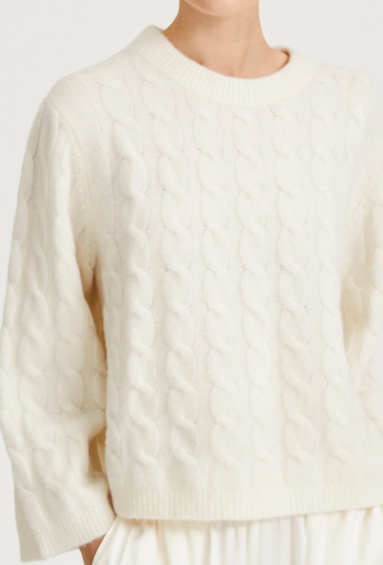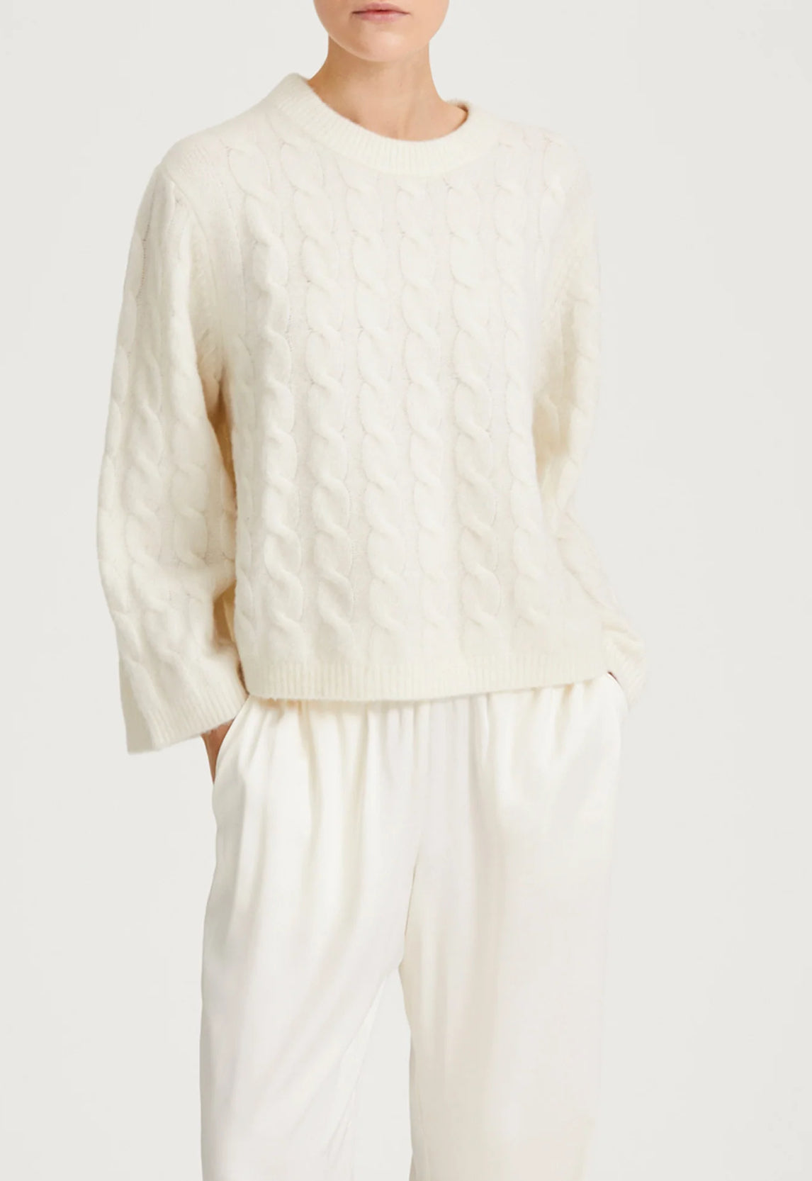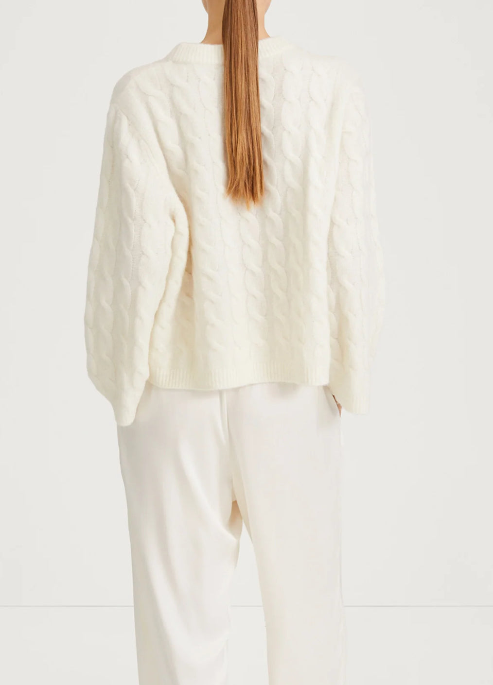 The Lumina Sweater, crafted from a soft alpaca blend, features a timeless cable-knit pattern in a loose, straight silhouette. Designed with full-length sleeves, subtly tapered by a finer rib at the cuffs, and finished with a classic round neckline.