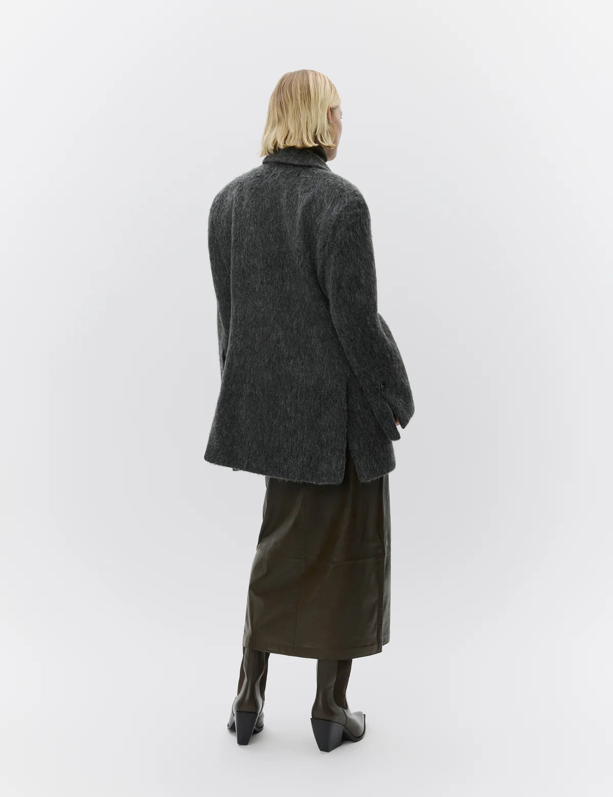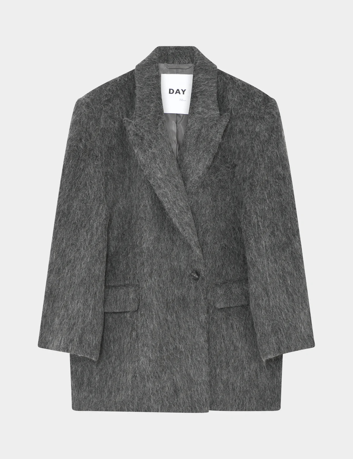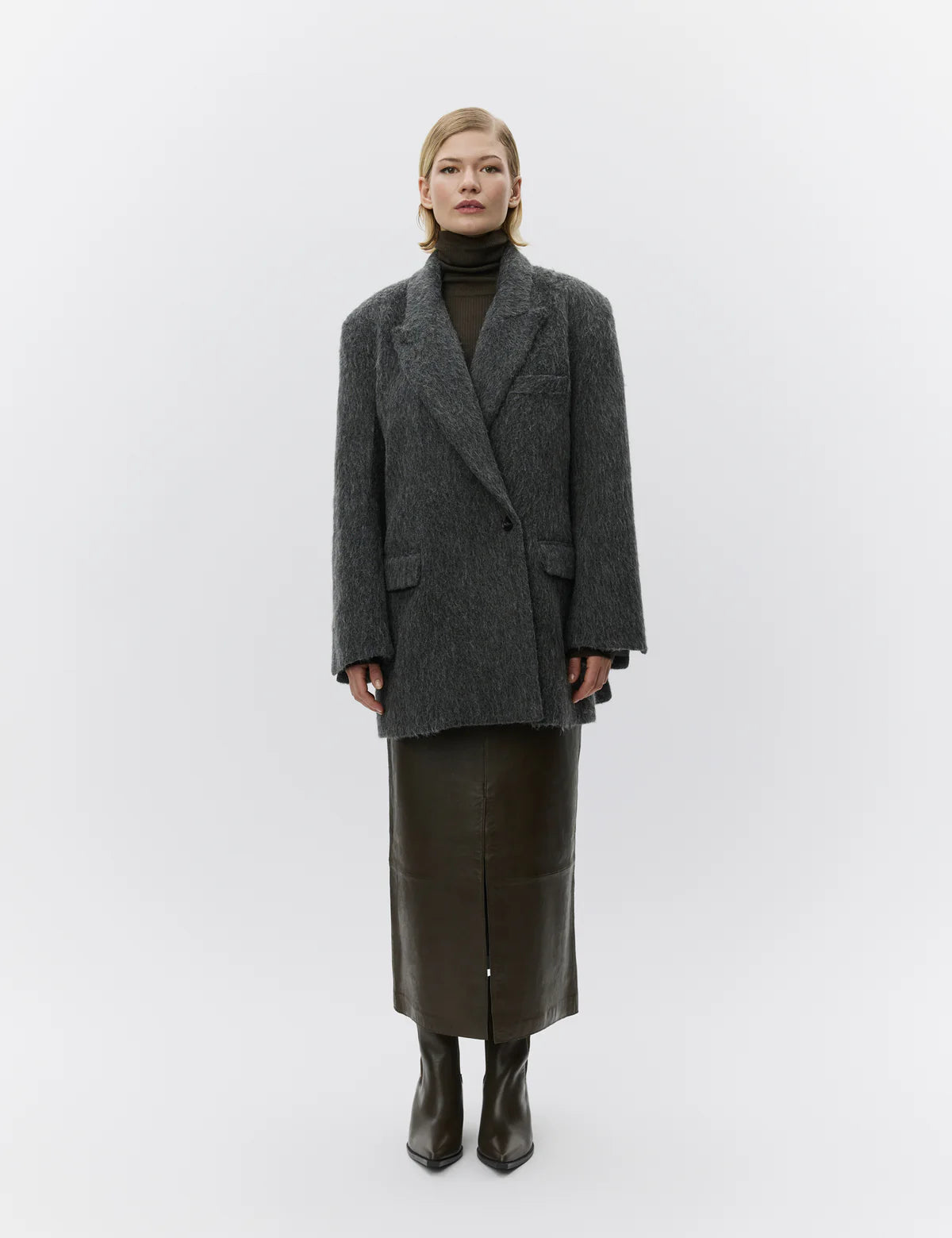 This shaggy, double-breasted blazer features patch pockets, an interior pocket, padded shoulders, and a peaked lapel. The blazer is fully lined and has an oversized fit.