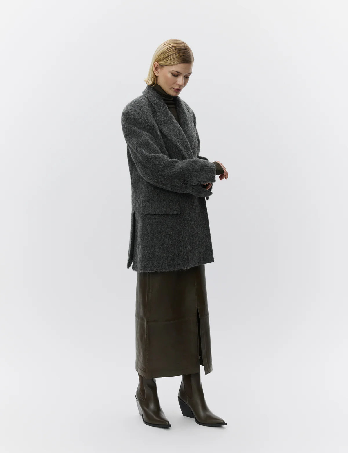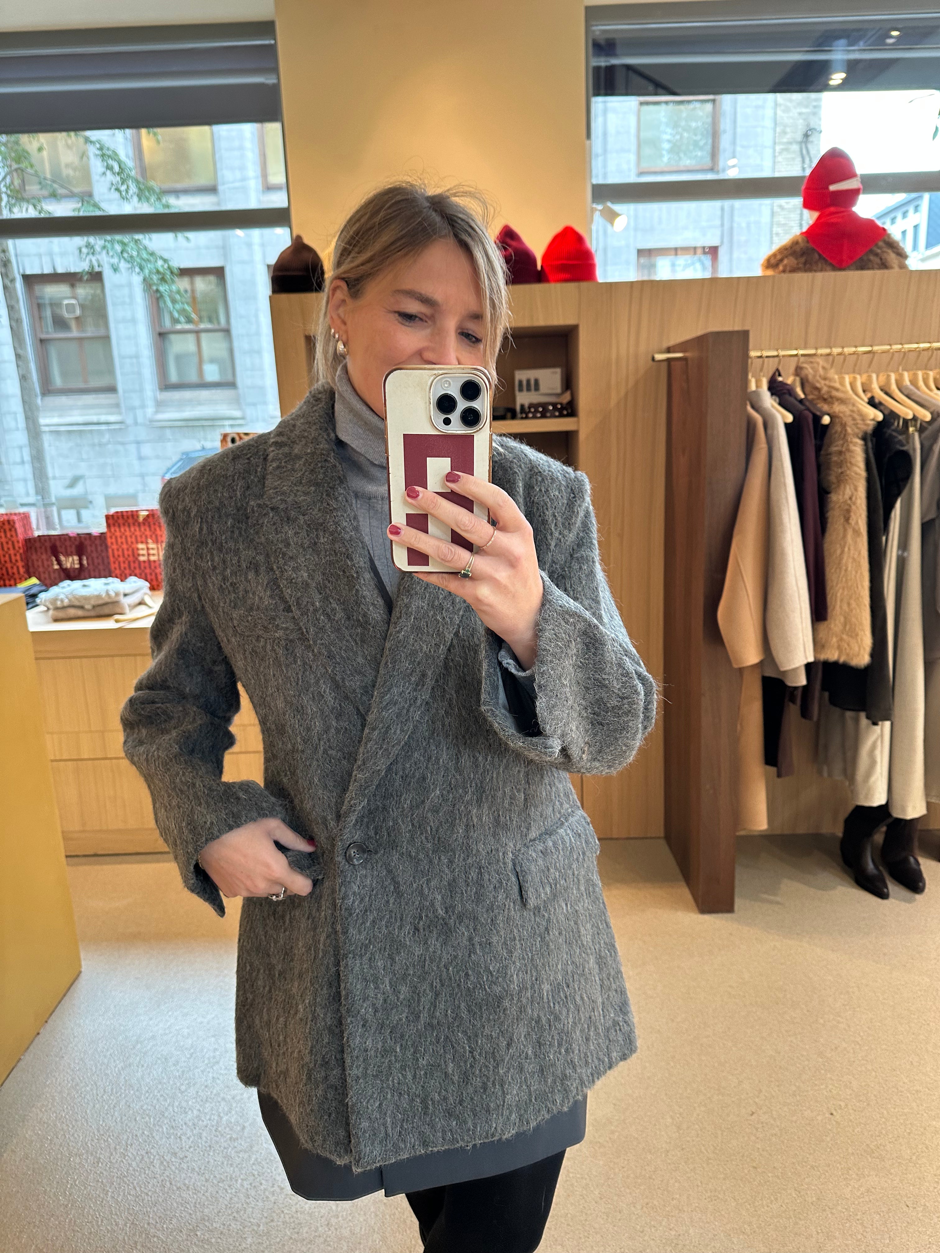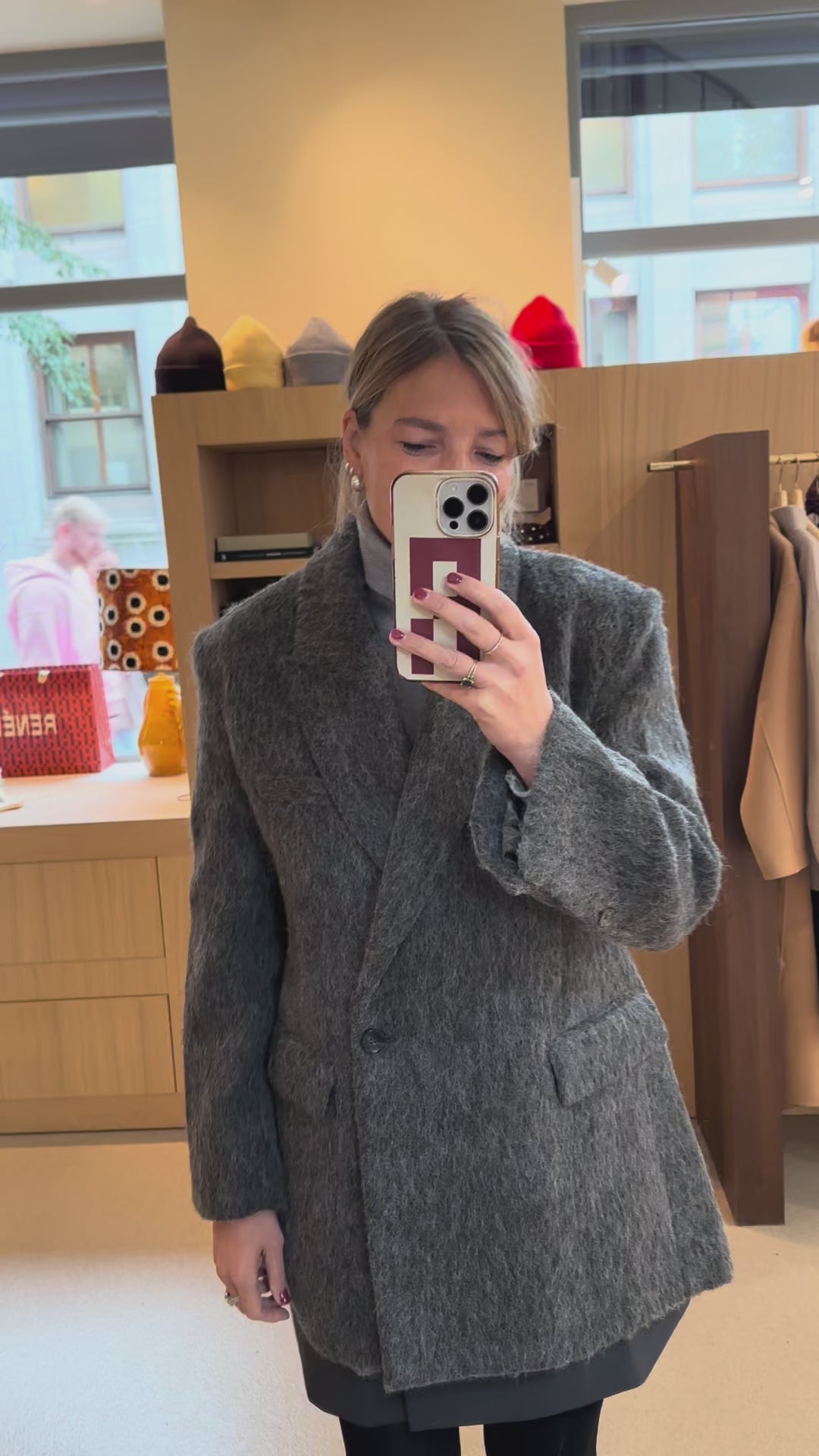 This shaggy, double-breasted blazer features patch pockets, an interior pocket, padded shoulders, and a peaked lapel. The blazer is fully lined and has an oversized fit.