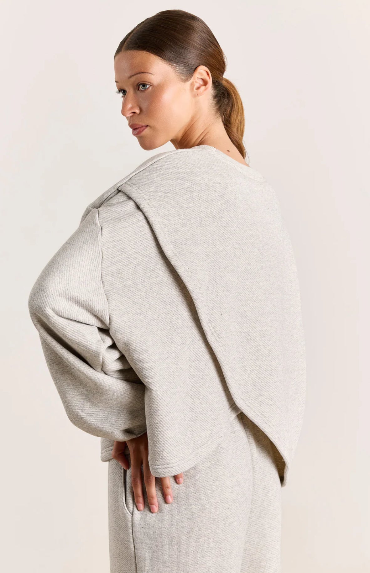 This basic sweatshirt features an unexpected asymmetric drape at the back, making it a piece with an extra "je ne sais quoi". Designed for movement and flow, it’s a statement piece that doesn’t raise its voice, best paired with coordinating trousers Magnus, or thrown over your favorite denim.