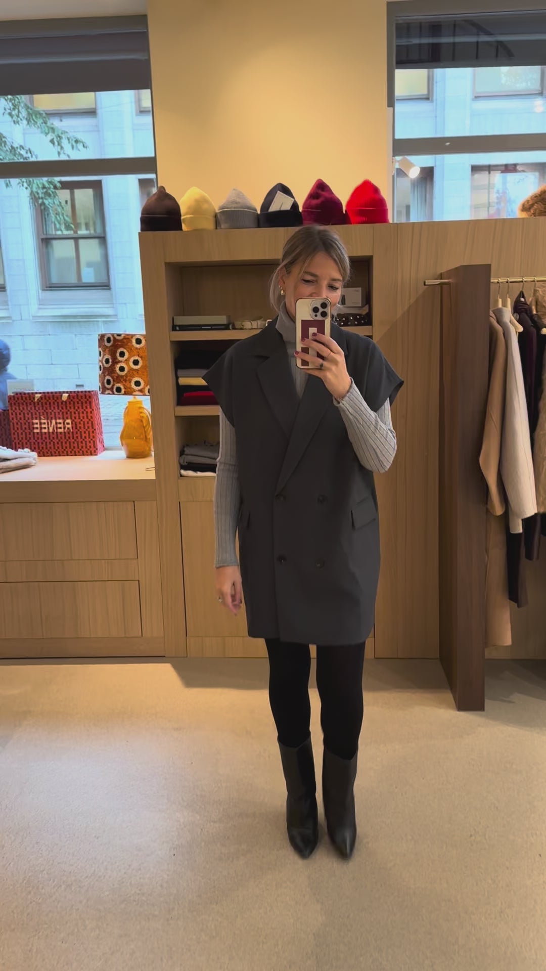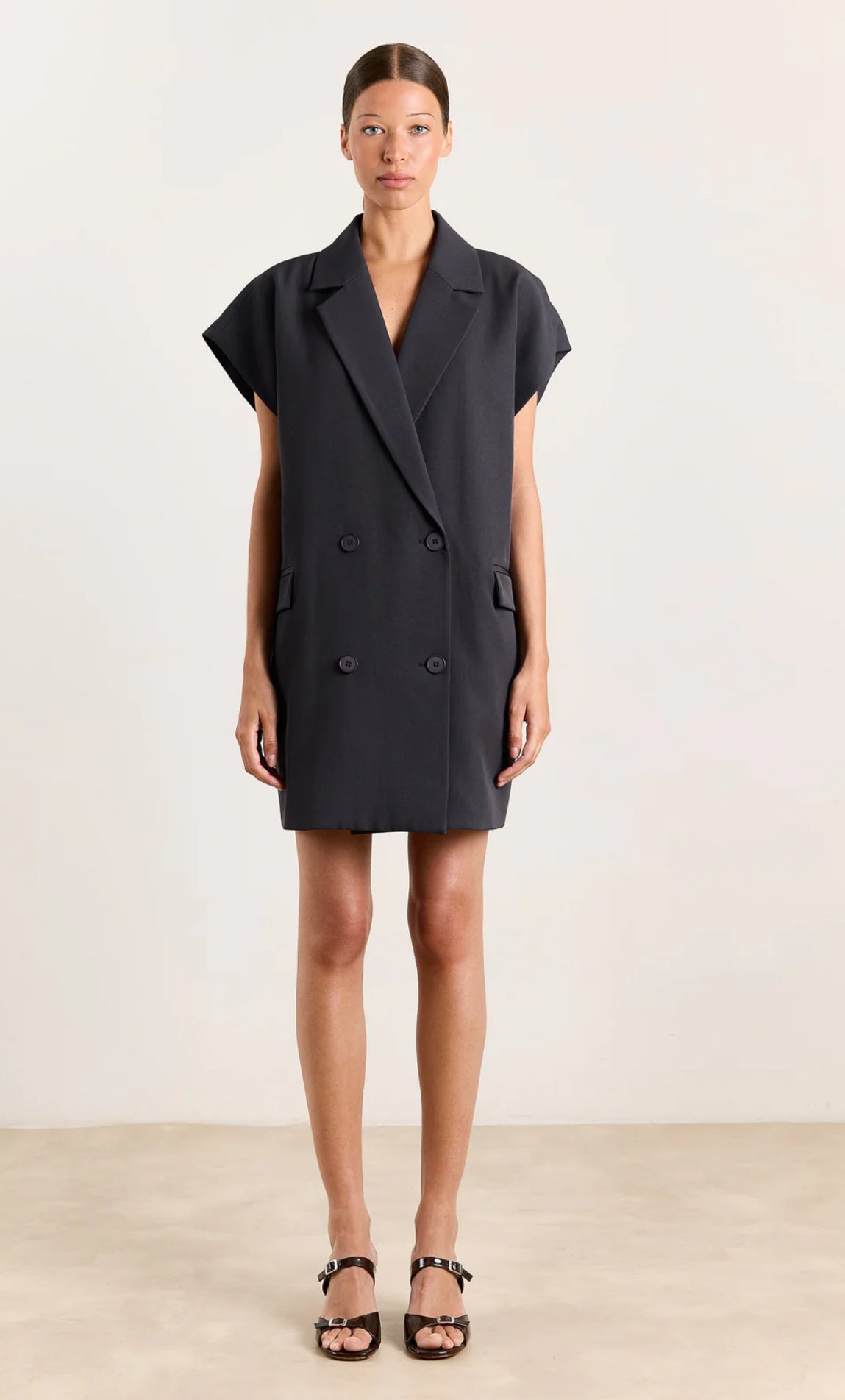This structured suiting dress is your new go-to for timeless sophistication. With its sharp shoulders, double-breasted cut and sleeveless design, it balances soft power with timeless minimalism. Style it solo for sleek evenings or layer over a fine-knit top for daytime edge. A refined dress with just enough attitude.