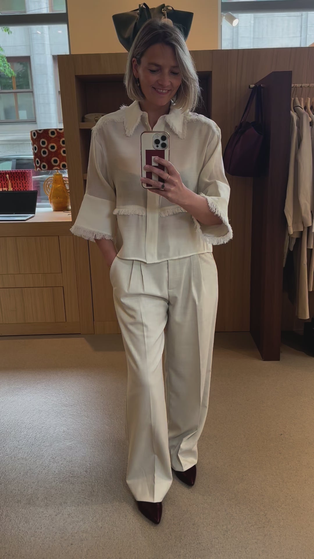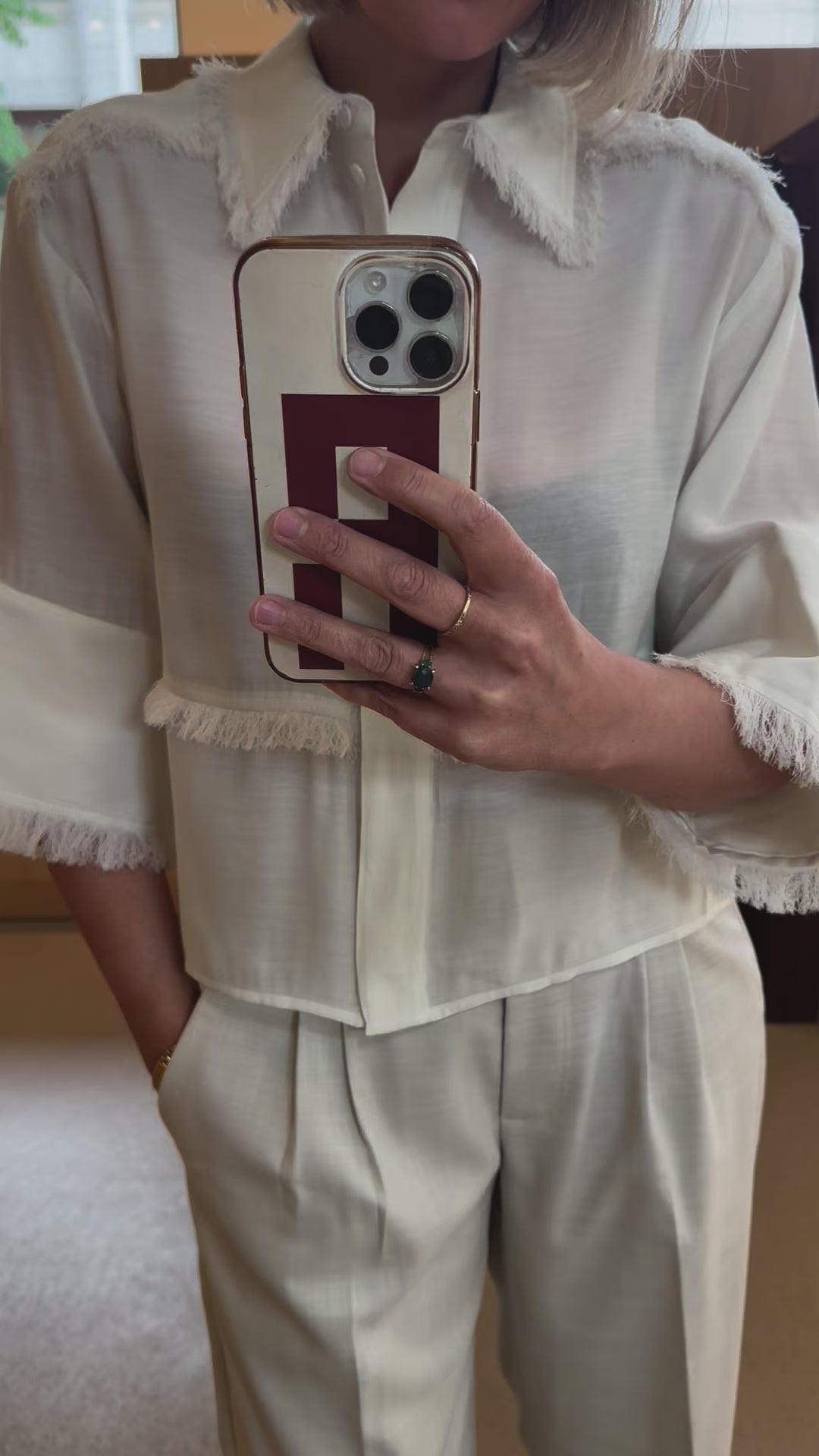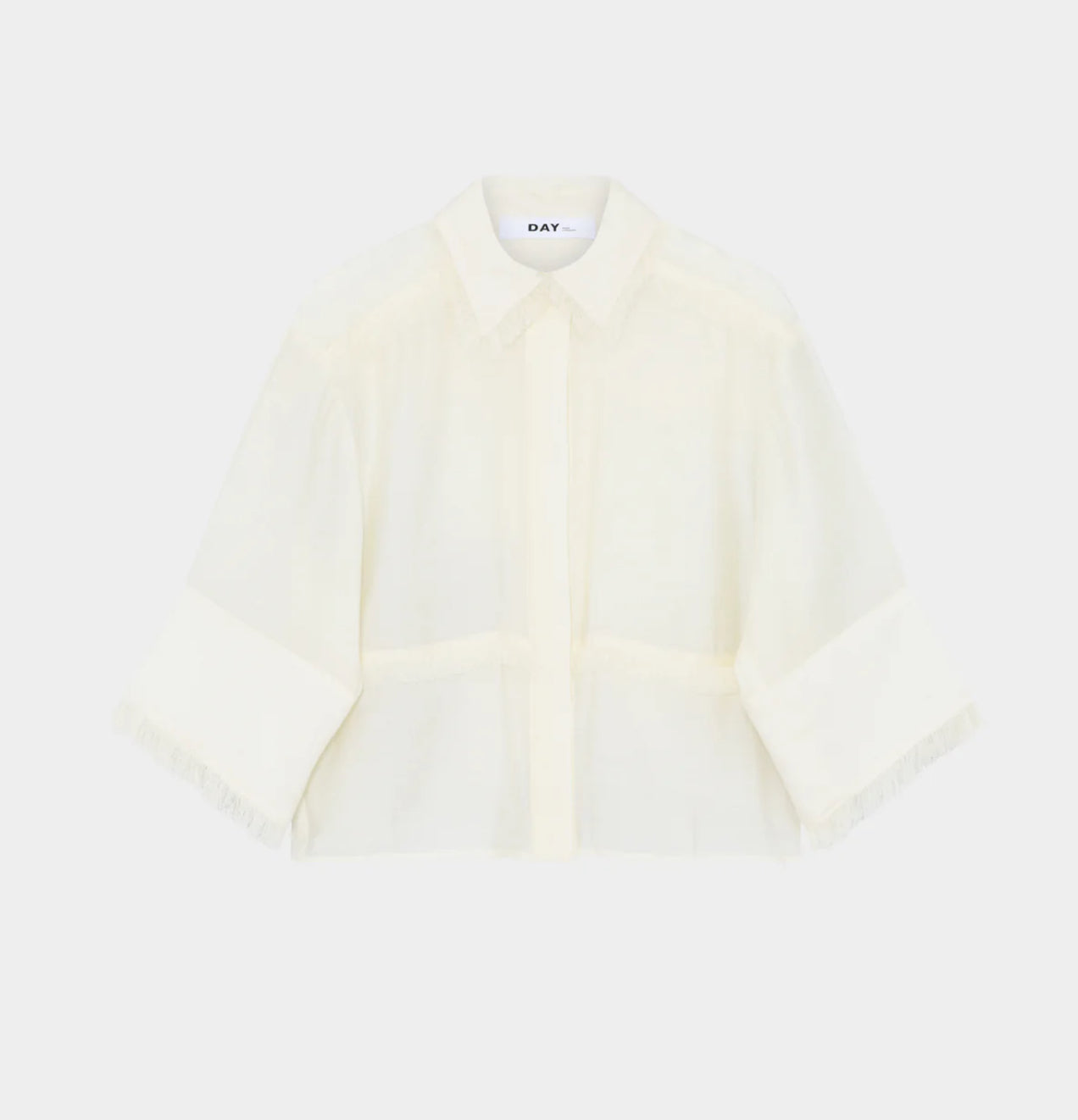 This button-up top features cropped, wide sleeves and fringe detailing throughout the front, collar, and back. The top has a semi-sheer finish and a loose fit.