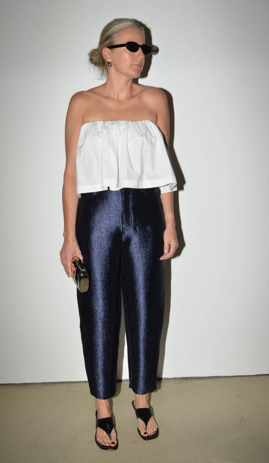 PALEO is a 5-pocket pants with a rounded tapered leg in ankle length. The delicate shiny textured fabric look makes these pants great for going out!