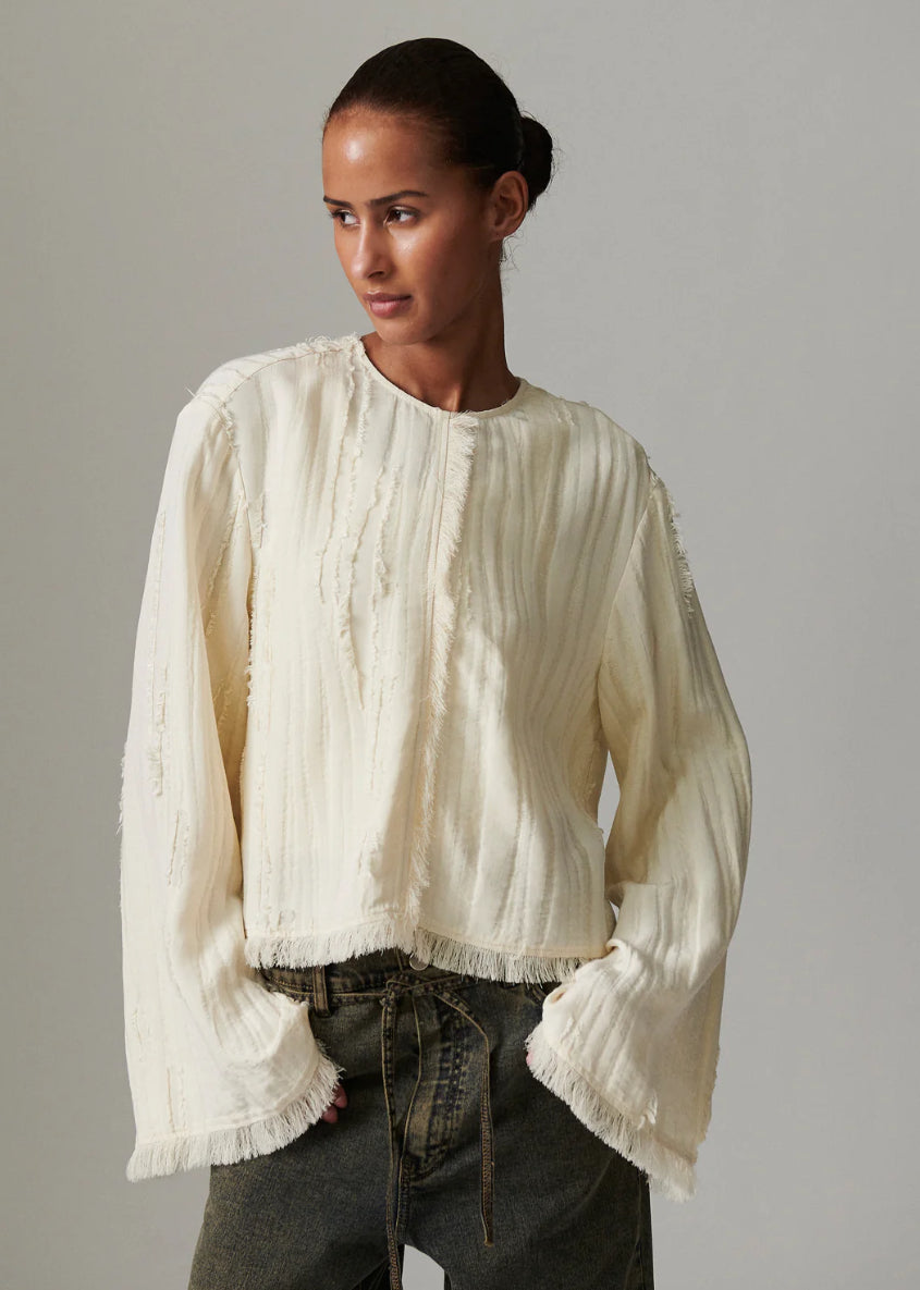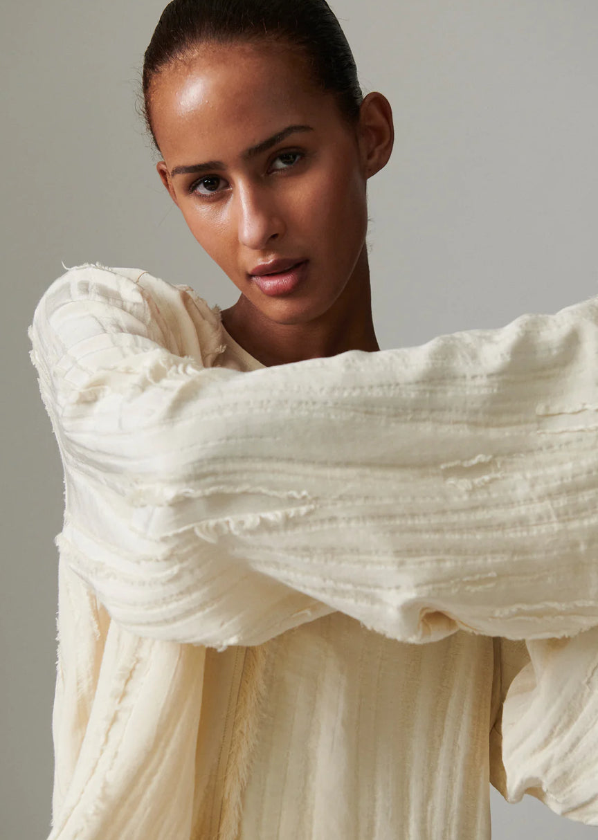 This top features a fringed texture throughout, a keyhole with button closure at the back, and side sleeves. There is a fringe across the hem and wrists. The top has a loose fit.
