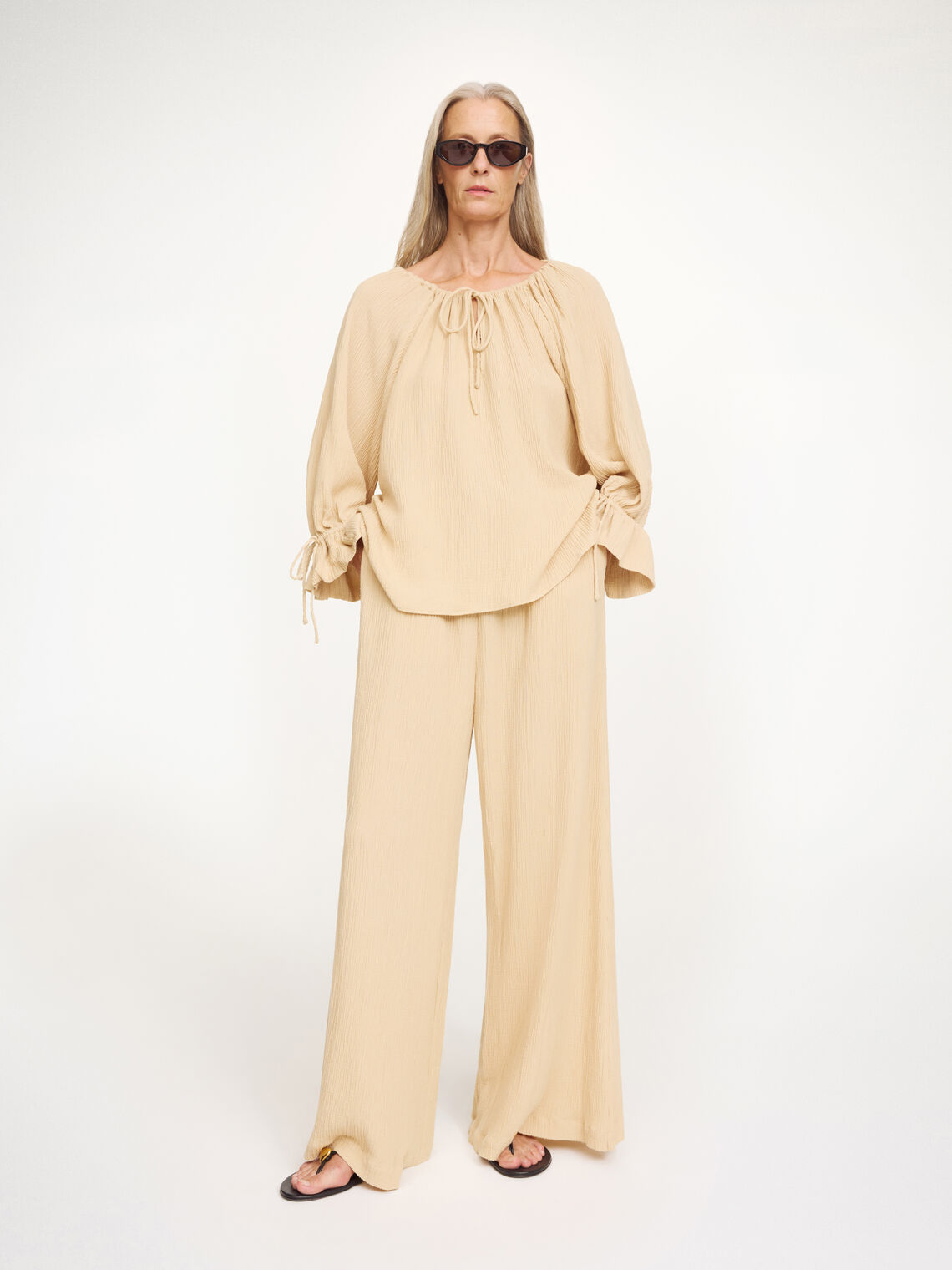 Eclectic and easy to wear, such is the Rose Weave blouse. With its lush collar, deep V-neck and adjustable ties, it’s wearable for numerous occasions – and seasons. Wear with the matching Pisca Weave -Loose fit