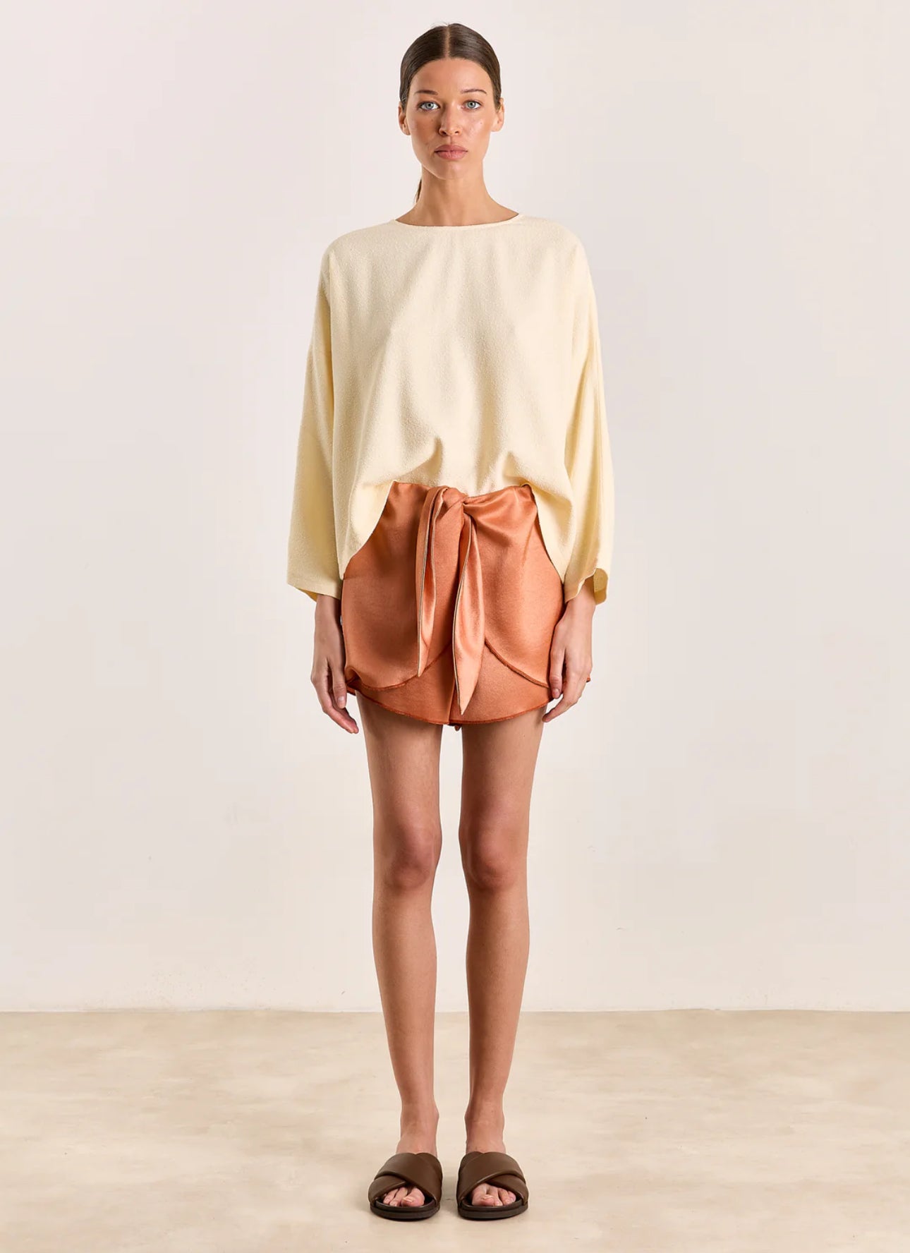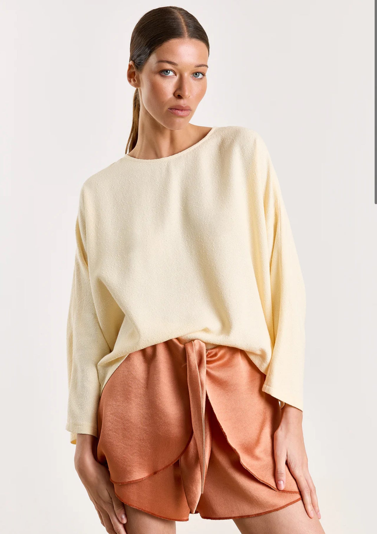 This textured long sleeved top features a fluid, boxy silhouette with dropped shoulders and a clean neckline. Whether you choose the soft butter yellow or classic black, it’s a low-effort essential that always looks polished, on its own or layered.