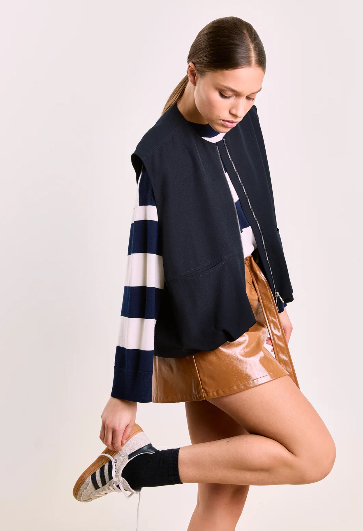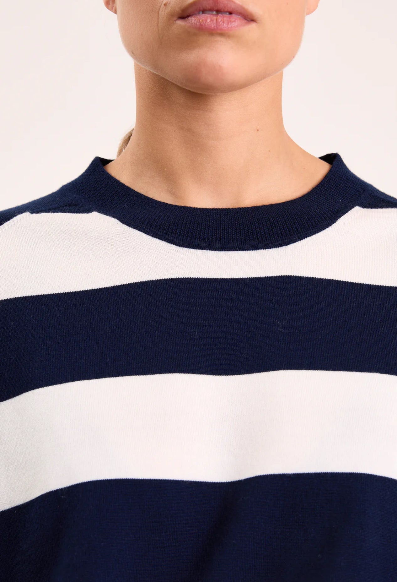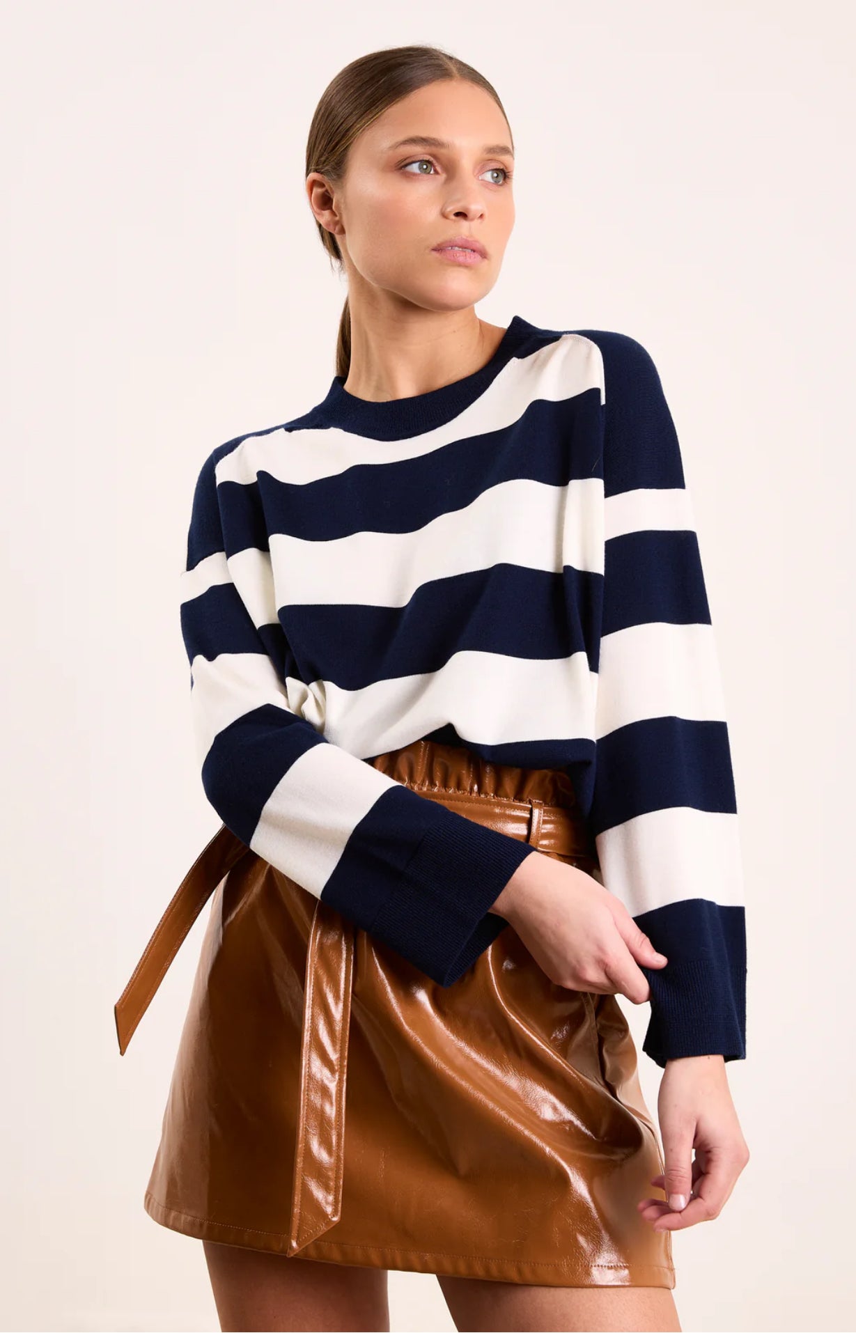 What's not to love about stripes? Sasha is perfect for a nautical-inspired weekend look, wear it half-tucked into high-waisted jeans or tailored trousers. For a fresh twist, pair it with our Tosca faux-leather mini skirt, letting the contrast of textures elevate the outfit.