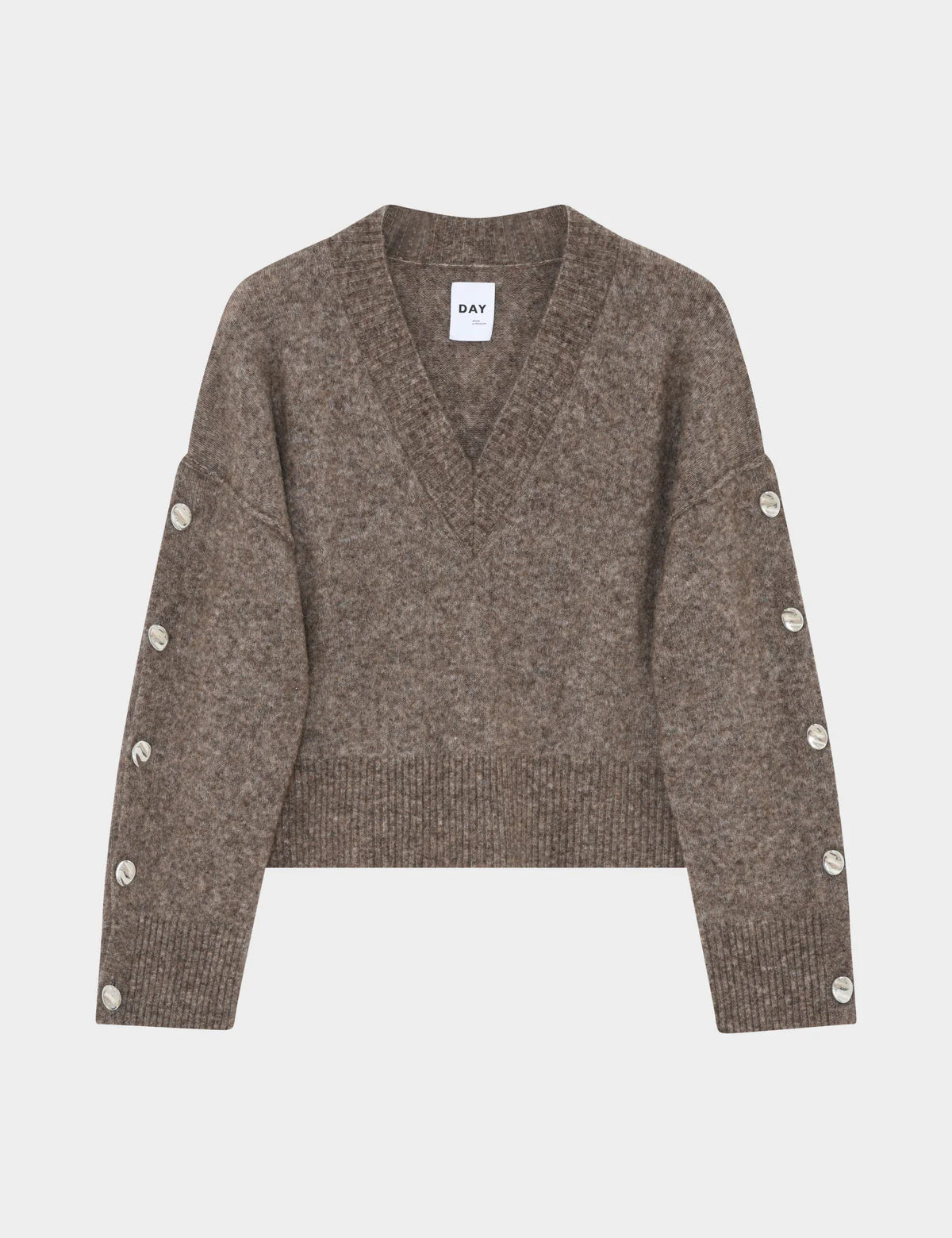 This V-neck jumper features bauble buttons down the sleeves. The jumper has an oversized fit.