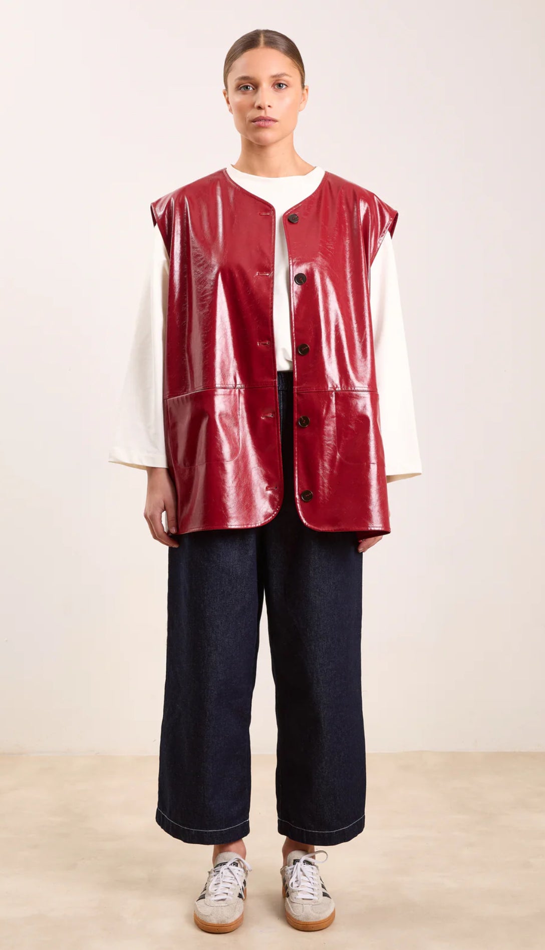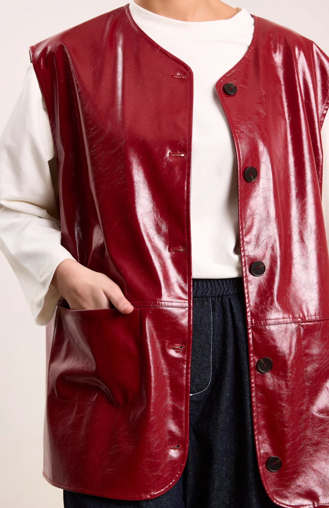 This high-shine coated vest is your instant statement-maker. Perfect for injecting attitude into your everyday look. Balance with soft layers underneath - think oversized shirting, tonal knits, or a crisp white tee. Pair it with tailored trousers for a polished contrast, or go off-duty with wide-leg denim. If you are into sets, combine effortlessly with Tessa. Available in Caramel & Raspberry.